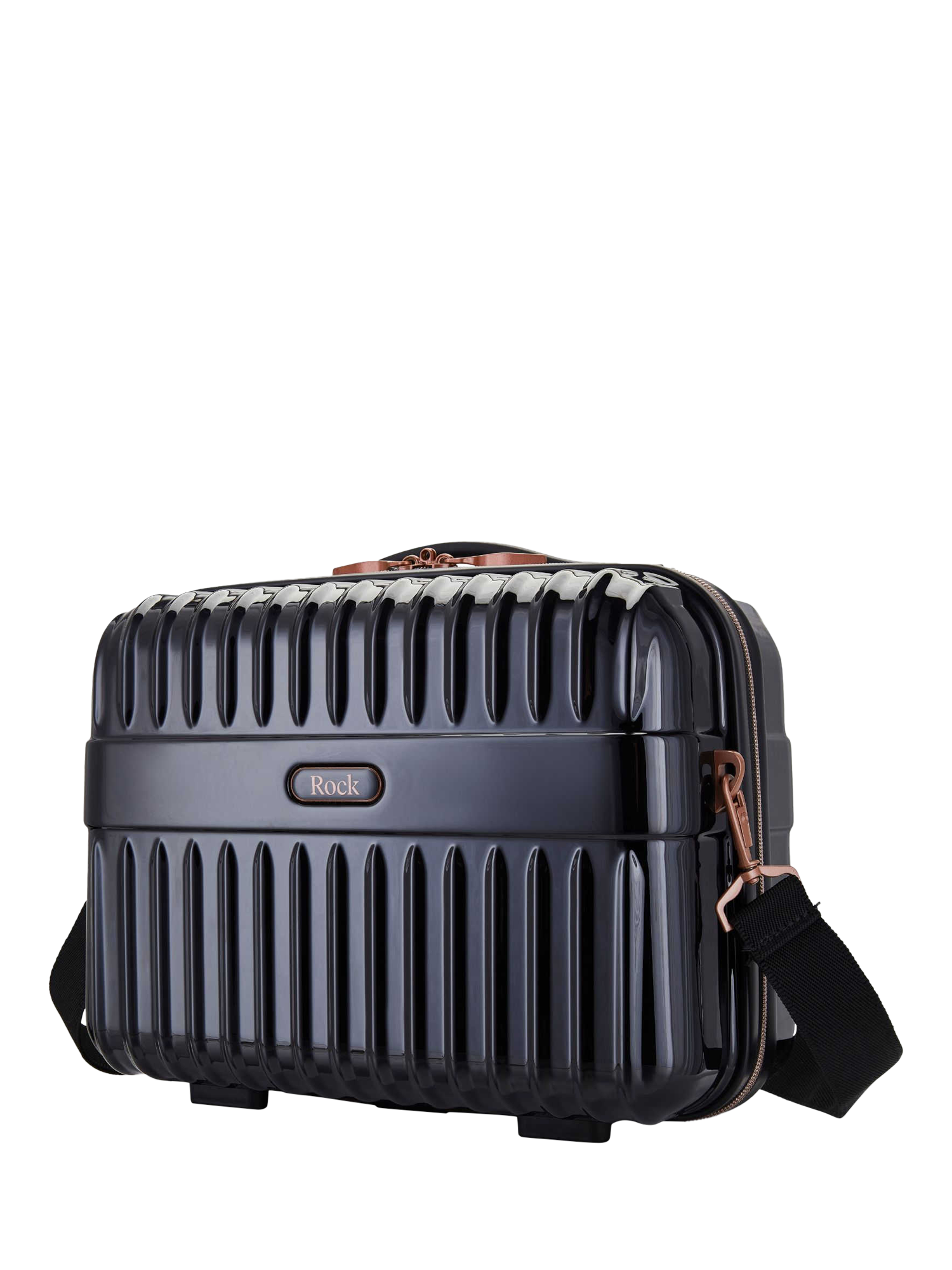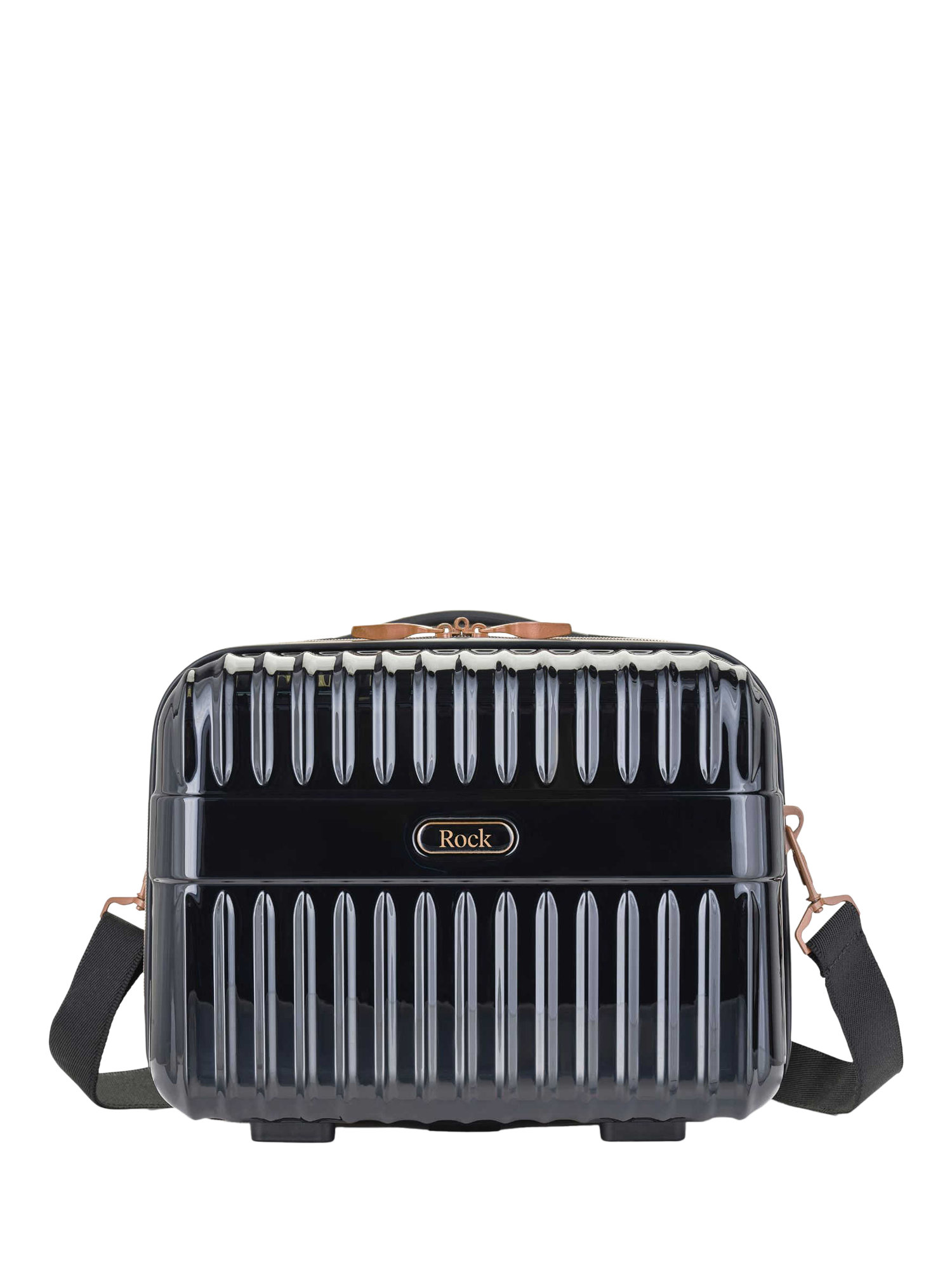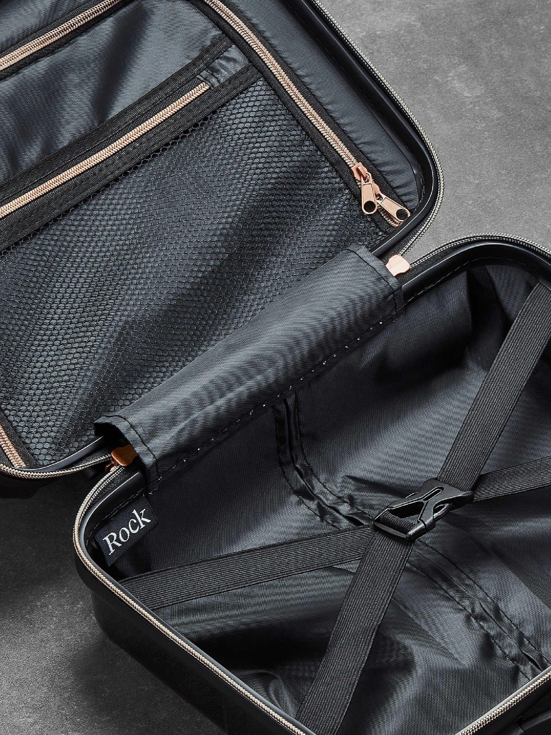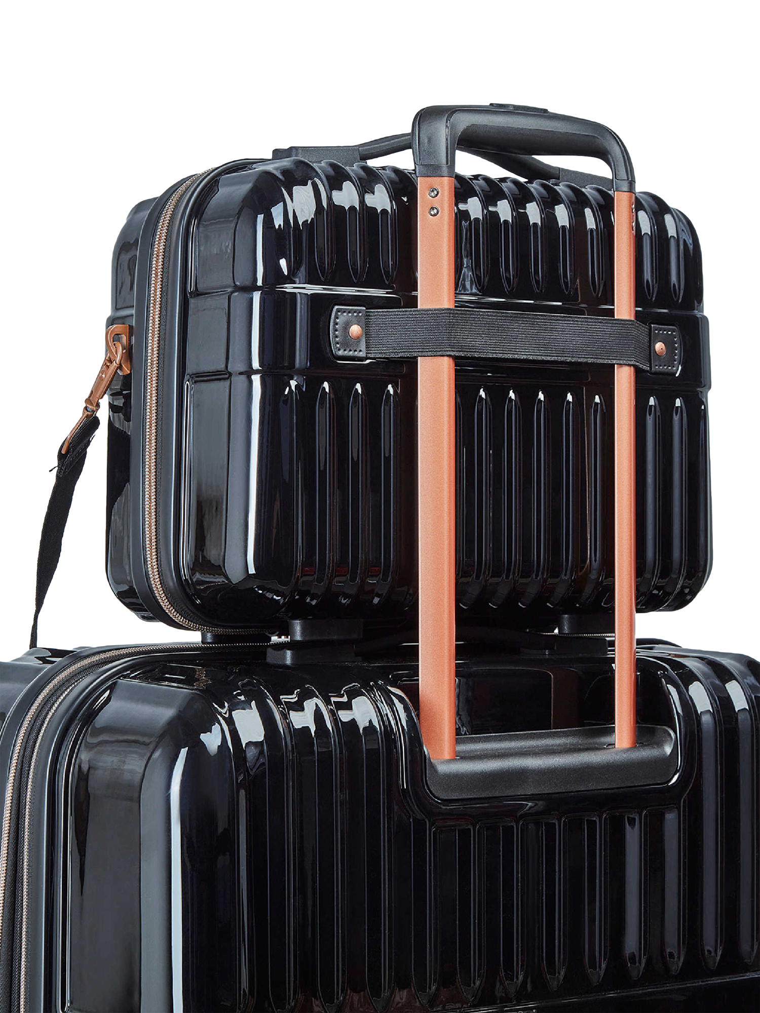 A trolley handle strap on the back allows this Vanity Case to be conveniently secured on top of your suitcase.