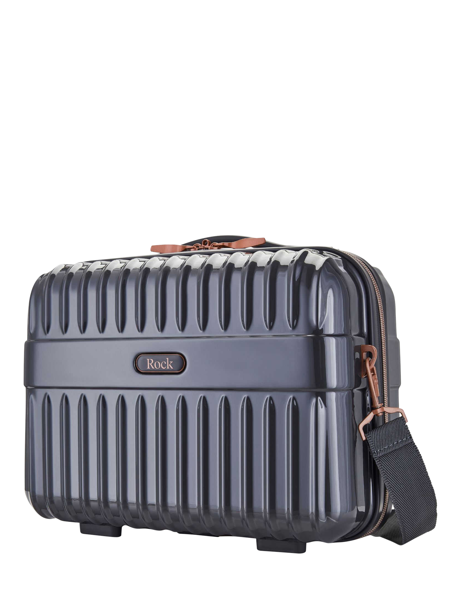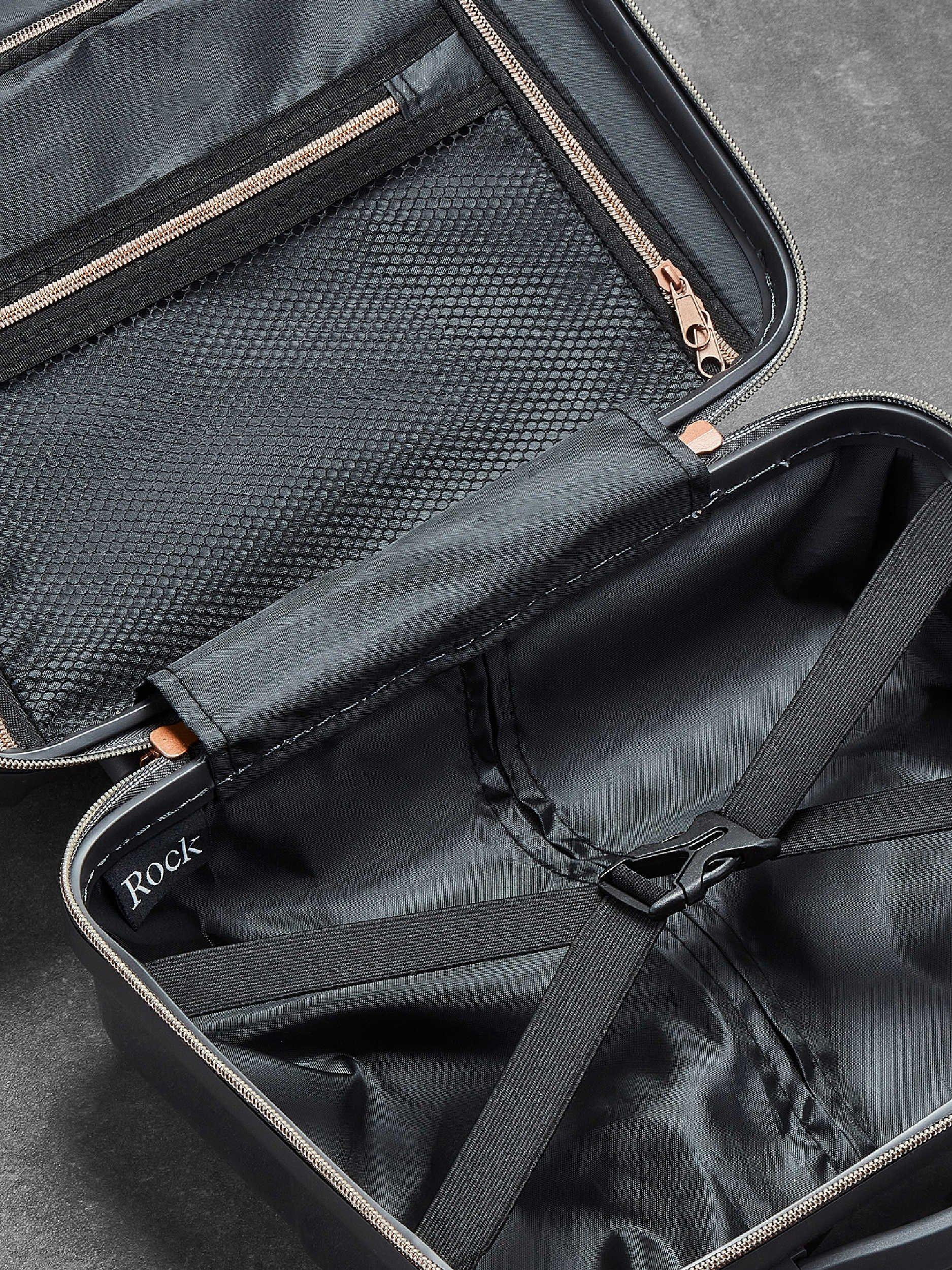 A trolley handle strap on the back allows this Vanity Case to be conveniently secured on top of your suitcase.