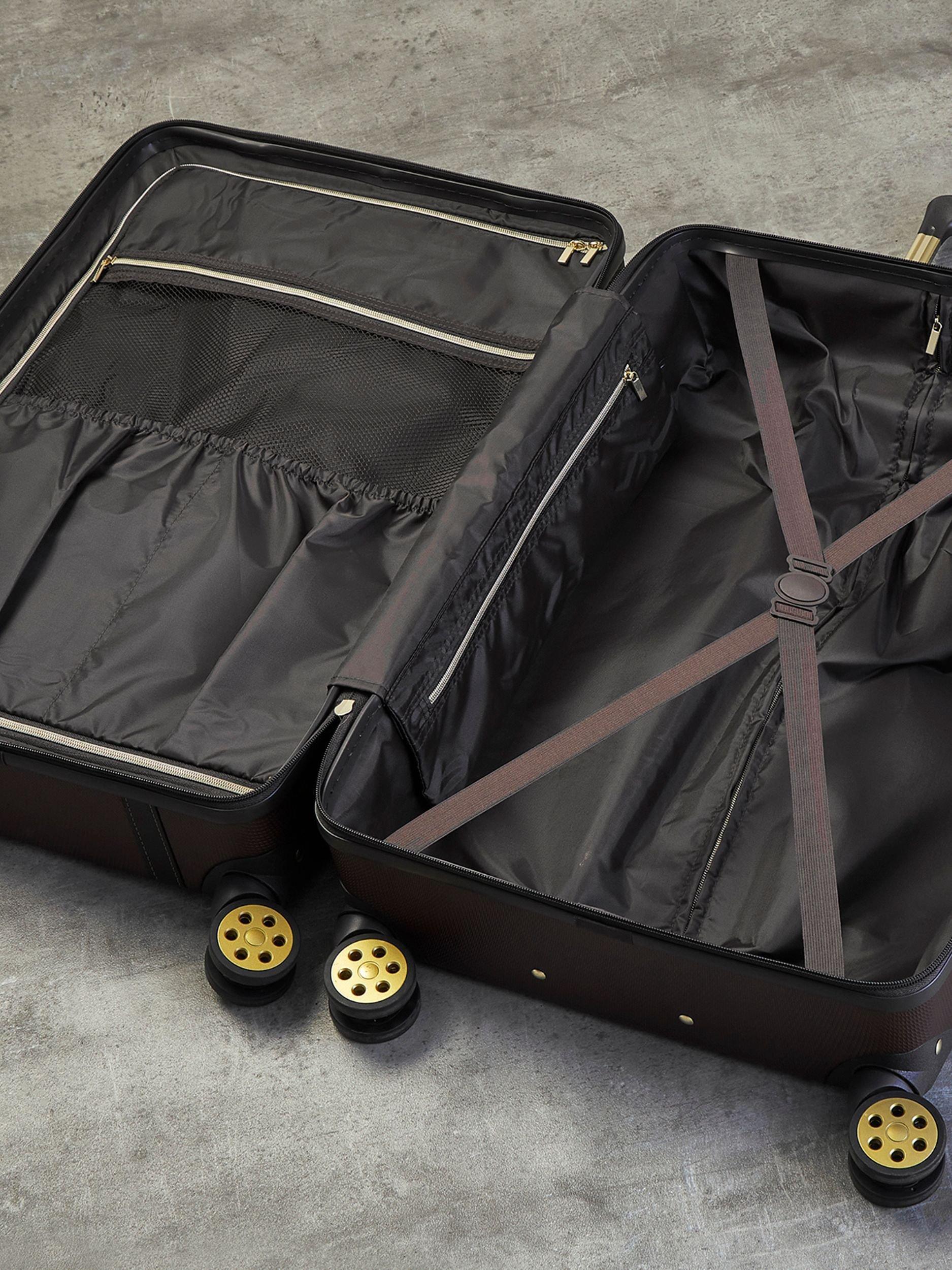 The fashion forward trunk design of the Vintage embodies a classic timeless look with contemporary lightweight construction and strong, durable features. They’re made of an impact-resistant, hard shell ABS material. And tough, reinforced corners protect belongings from all the bashes and bumps of baggage handling. The interior has luxurious soft touch lining, a zipped pocket, and a mesh divider section. The design also features a convenient zipped inside pocket and elasticated packing straps to keep your clothes securely in place.