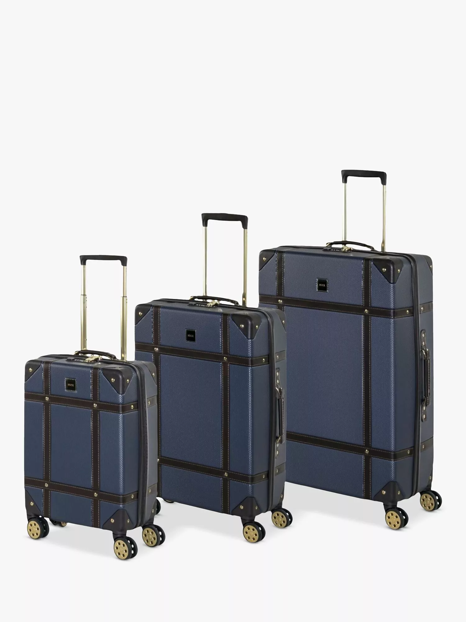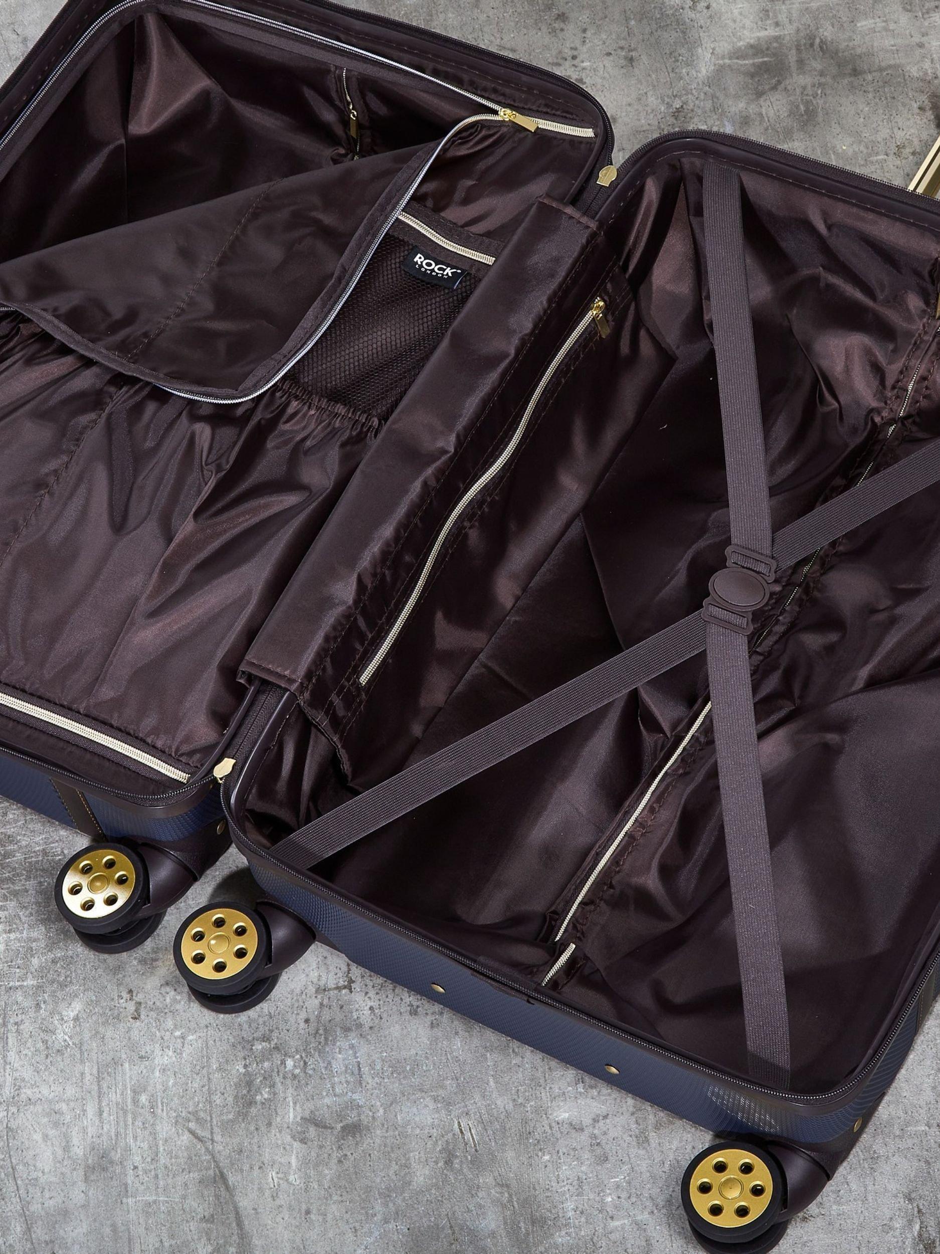 The fashion forward trunk design of the Vintage embodies a classic timeless look with contemporary lightweight construction and strong, durable features. They’re made of an impact-resistant, hard shell ABS material. And tough, reinforced corners protect belongings from all the bashes and bumps of baggage handling. The interior has luxurious soft touch lining, a zipped pocket, and a mesh divider section. The design also features a convenient zipped inside pocket and elasticated packing straps to keep your clothes securely in place. The 3 cases can be nested inside one another to save space when not in use.