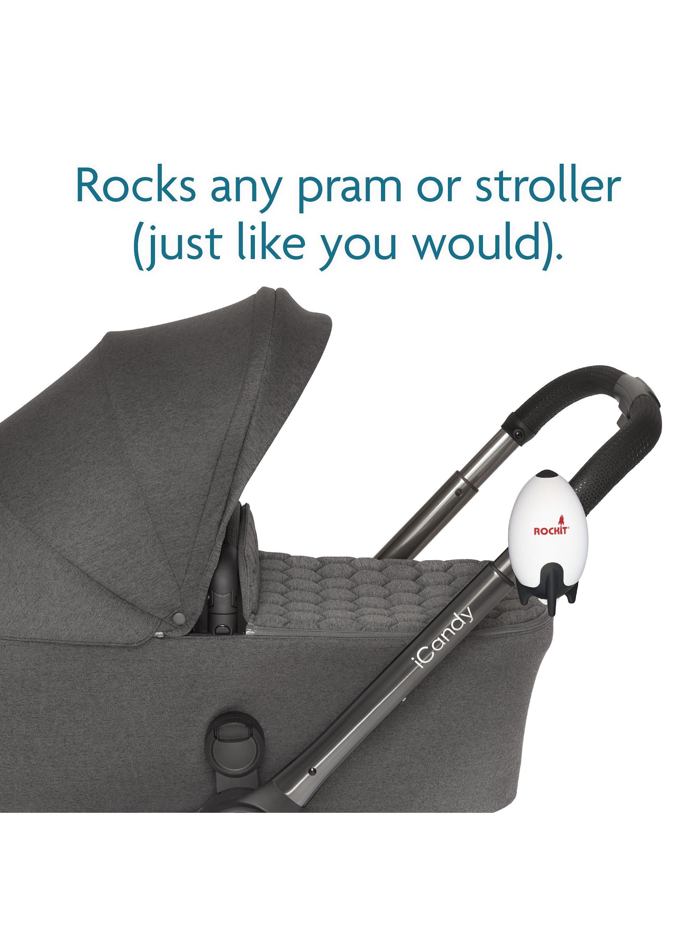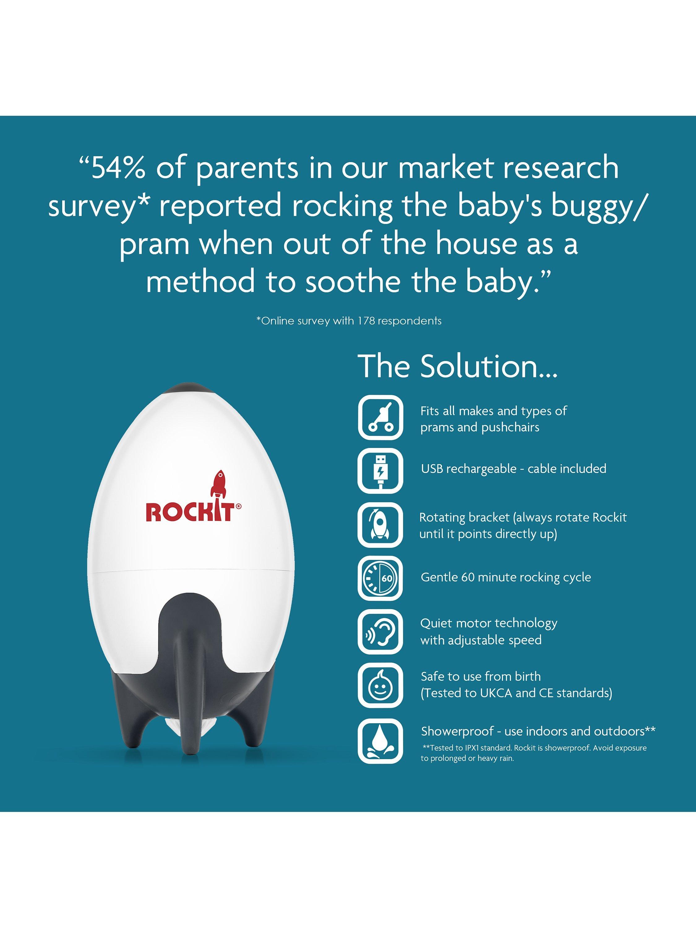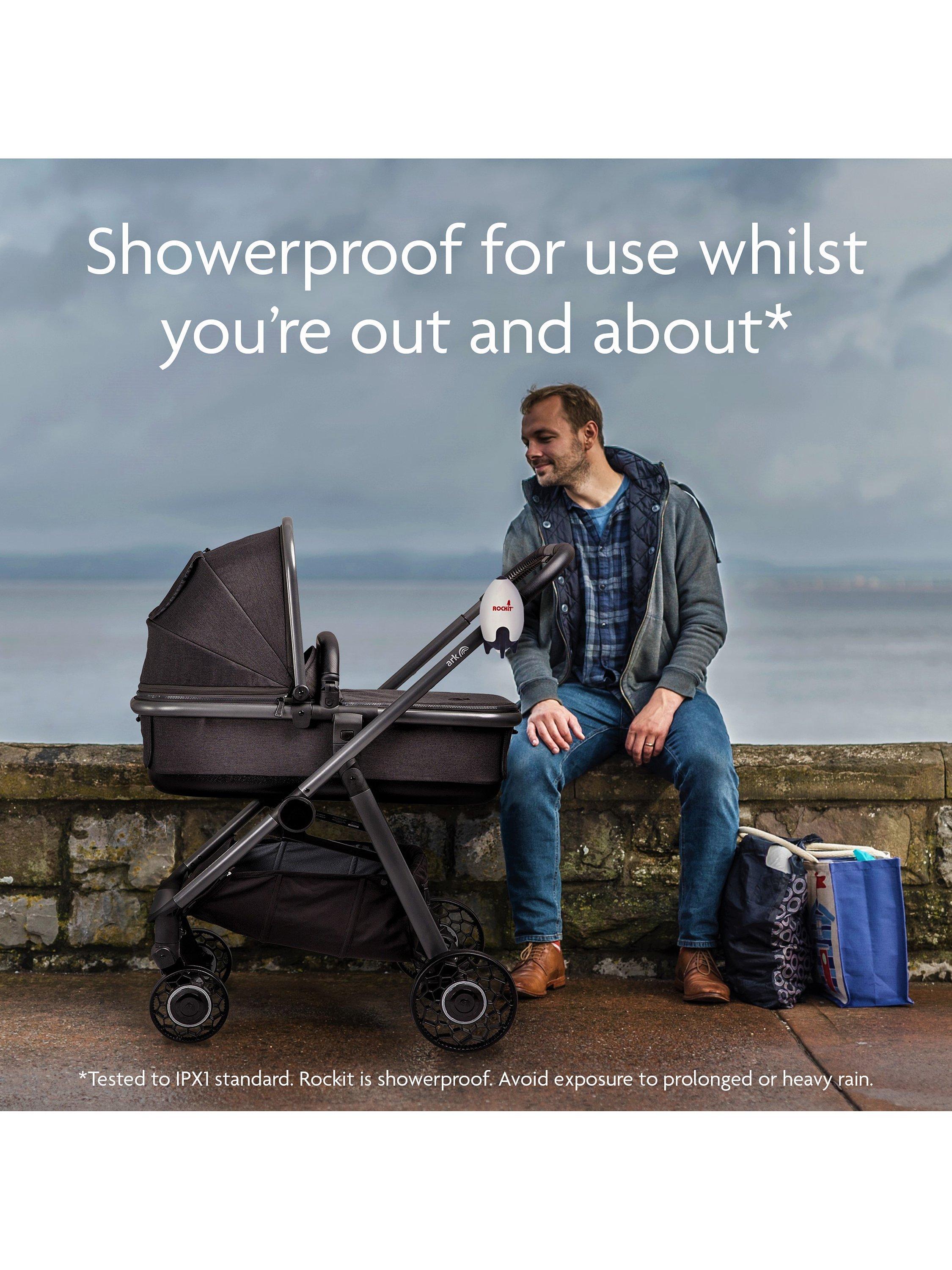- • Only to be used on prams and strollers. Do not use it on cots, cribs or car seats.• Position out of reach of the child• Always ensure that the stroller or pram is on a level surface and the brake is firmly applied before attaching and operating the Rockit.• *Showerproof. Tested to IPX1 standard. Avoid exposure to heavy or prolonged rain.