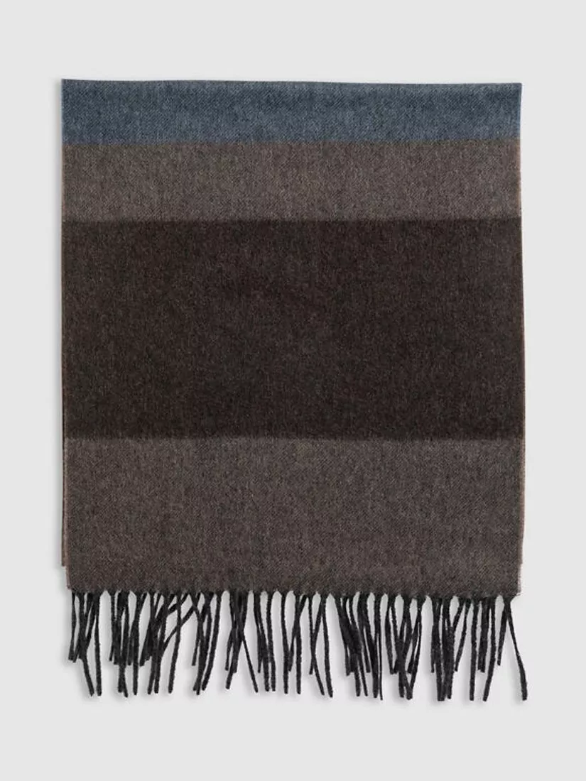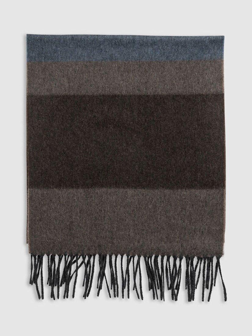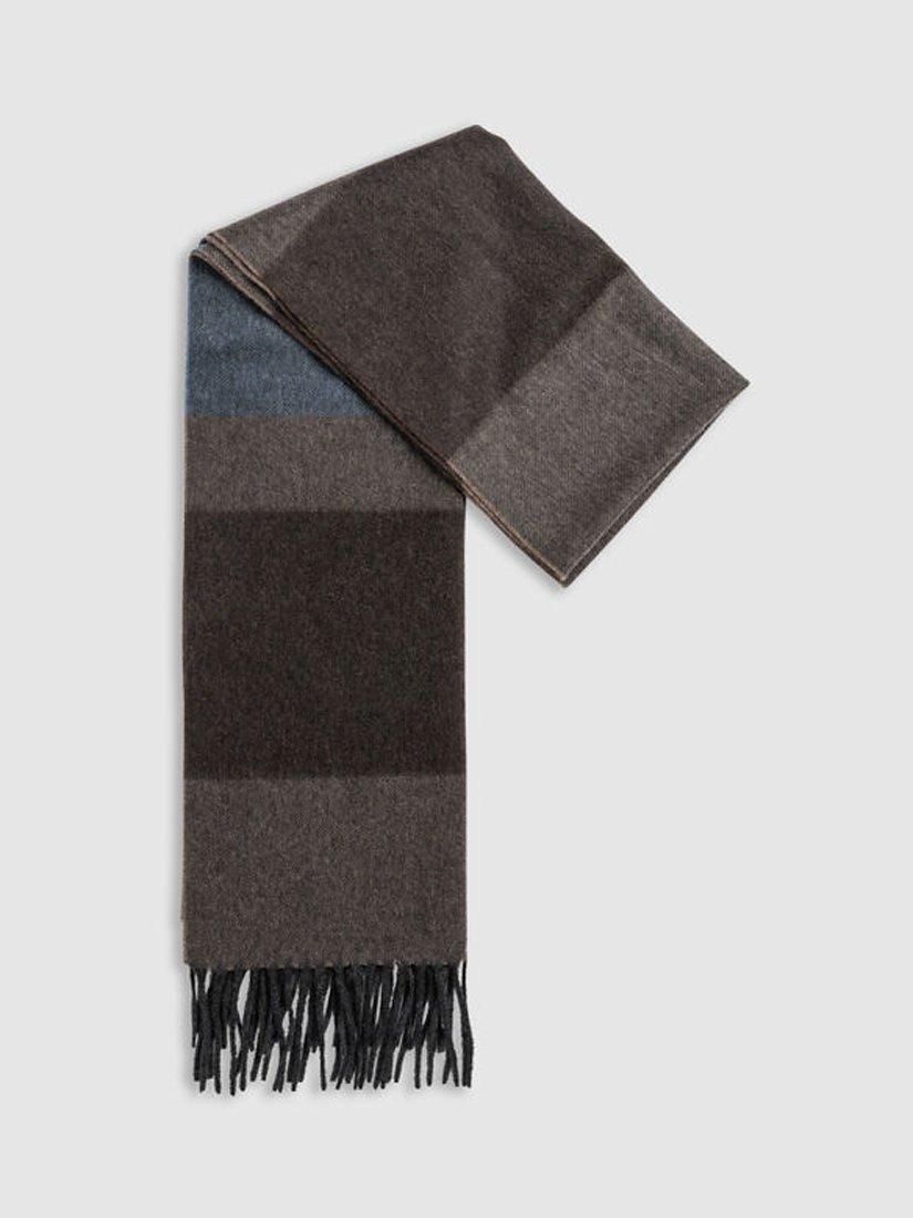 The Boucott Street is a premium scarf woven in Italy from regenerated cashmere in subtle tones but featuring bold strips across the ends of the scarf and finished with a charming fringe trim.