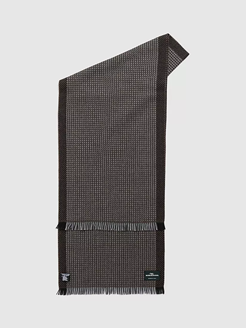 Crafted in Italy from Australian virgin wool, the Dunedin Scarf features a tonal weave with border-edge pattern, and each end finished with a small, subtle fringe.