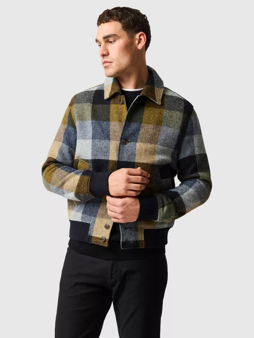 Cut from a warming wool-blend fabric, this bomber jacket also features a characterful check pattern as well as ribbed detailing at the hem and cuffs. The classic collar gives the design a slightly sharper look and feel, while a button-fastened front offers greater styling versatility.