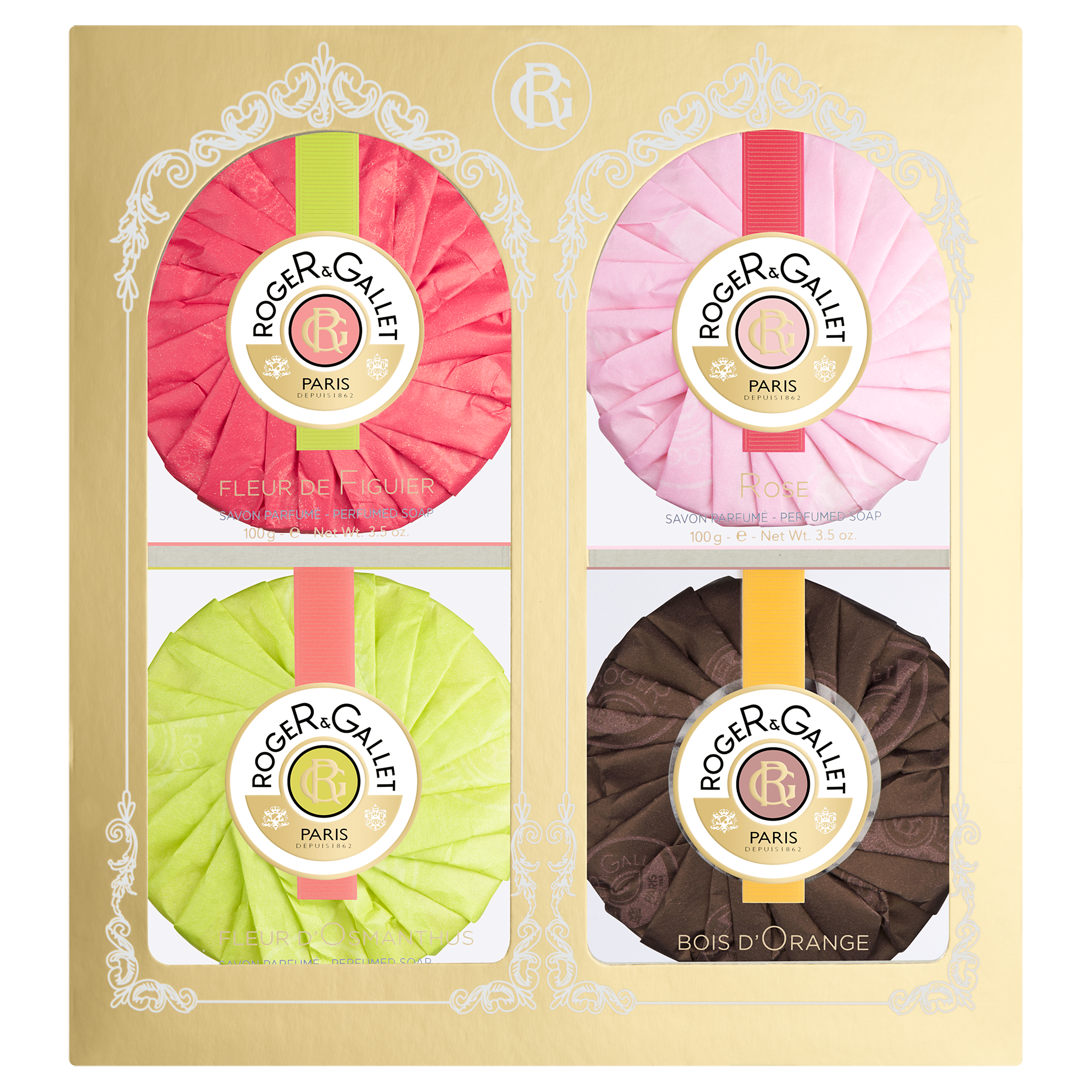 This beautiful gift set perfectly presents a range of the traditional indulgent Roger & Gallet perfumed soaps in Fleur d'Osmanthus, Rose, Bois d'Orange and Fleur de Figuier.