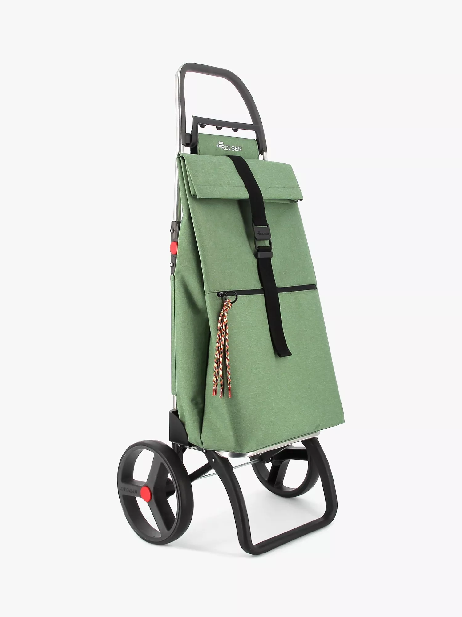 Rolser shopping trolley in folding aluminium with 2 large wheels, to avoid unnecessary loads. The 2LRSG chassis has a folding system forward for complete folding. Multifunctional hook adaptable hanger for supermarket trolleys and for hanging bags and/or other products.