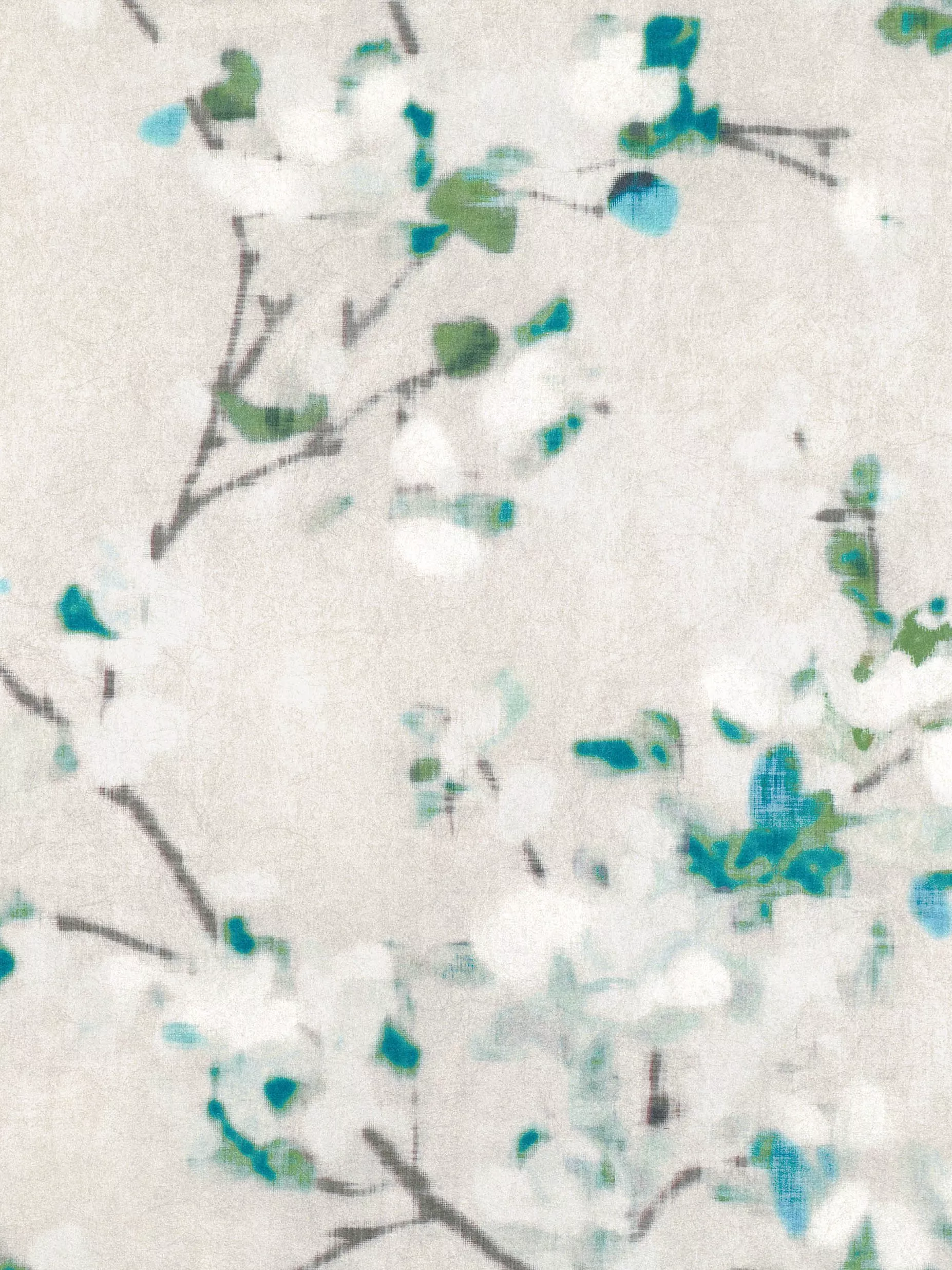 Wistful blossoming branches reminiscent of a Japanese garden appear hand-painted on a subtly textured ground that has the appearance of a refined hand-made paper. A delicate pearlescent finish adds a soft iridescence and luxurious quality.
