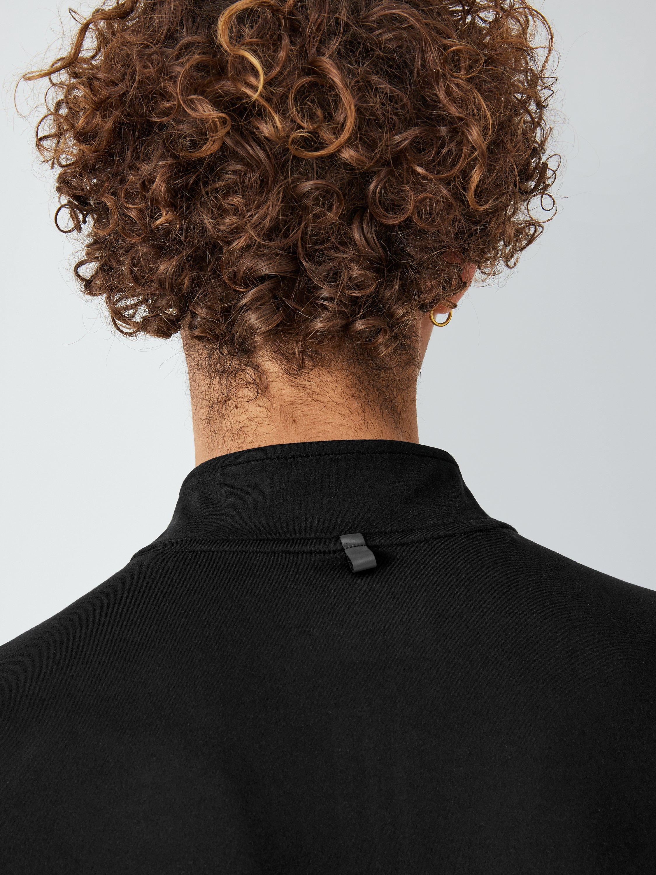 The fabric is a super soft polyester with good wicking and evaporation results. The front zip allows flexibility for venting once you have warmed up on your run. This updated style has a cosy high collar, thumb loops and is reflective for those evening jogs.