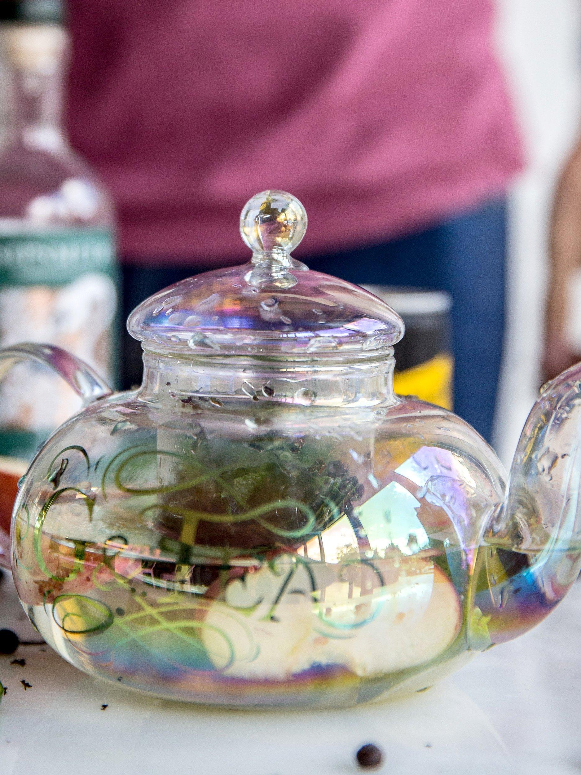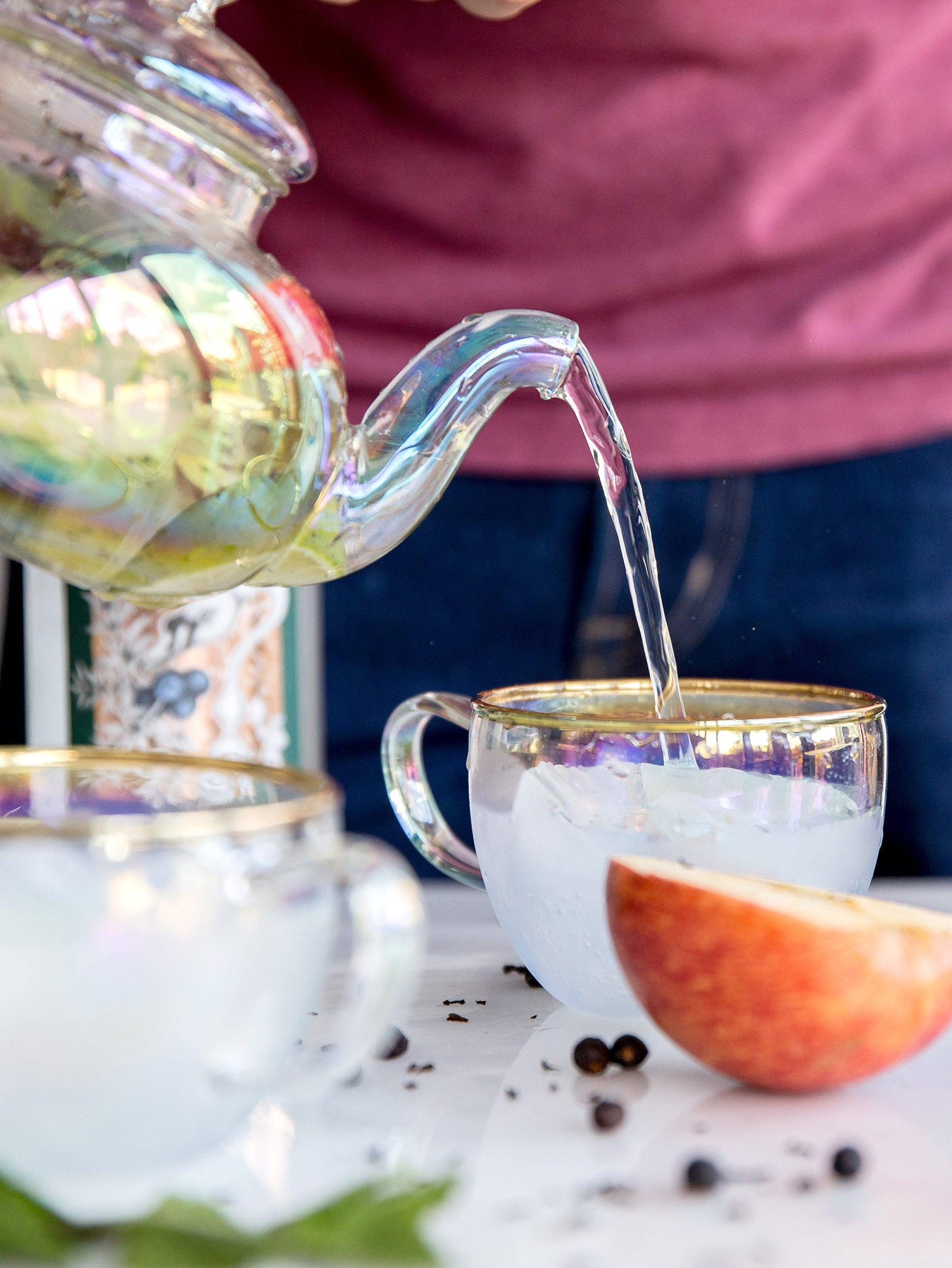The teapot comes with a filter basket keeping fruity lumps and pips out of the matching duo of teacups. It's ideal for adding spices, citrus or cucumber slices to infuse the gin.