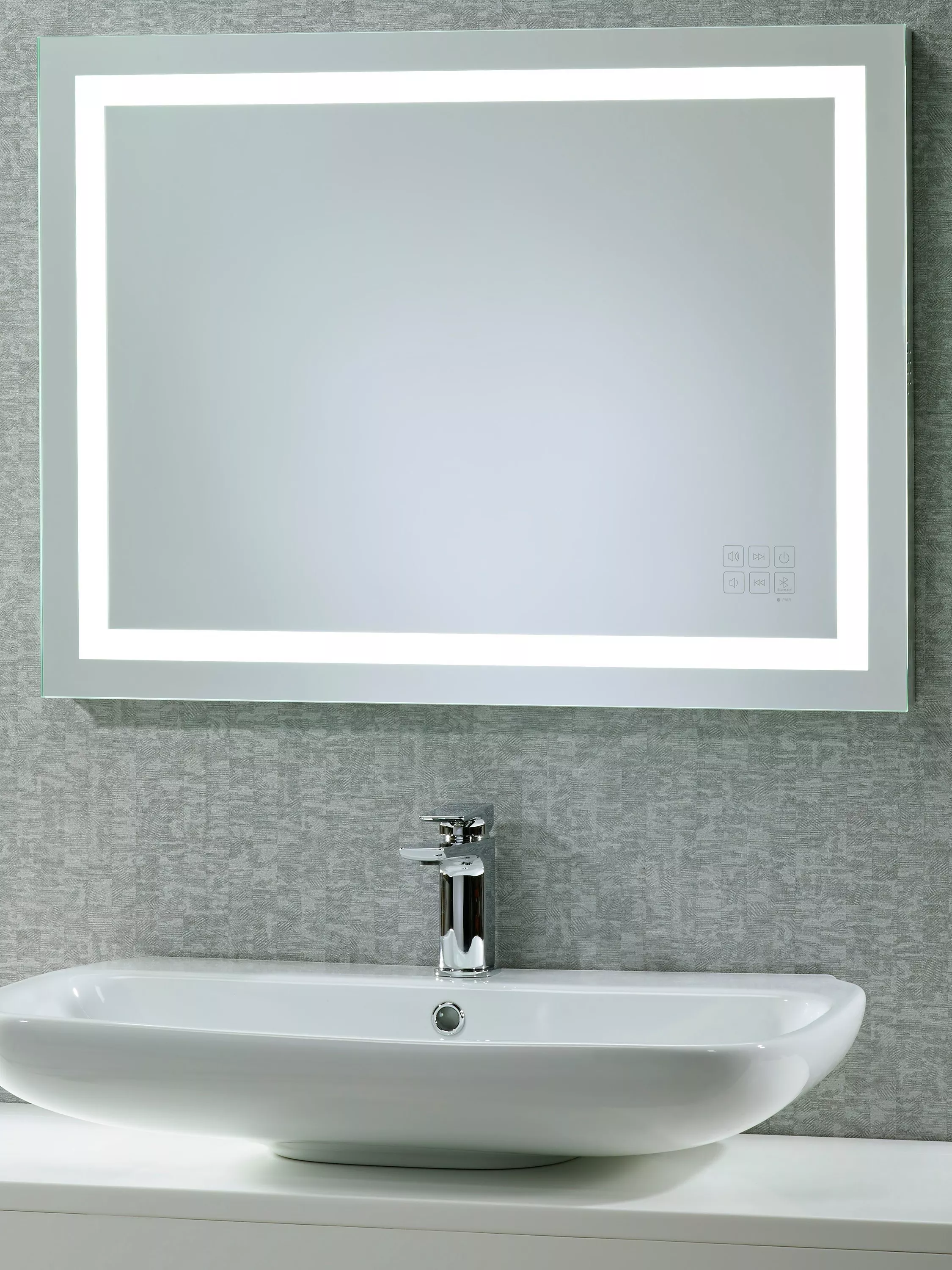 Sing along to your favourite songs in the shower, or relax with some soothing music in the bath with this LED backlit bathroom mirror. It features an integrated stereo system which can be controlled by a Bluetooth device or by using the touch control display on the front of the mirror.