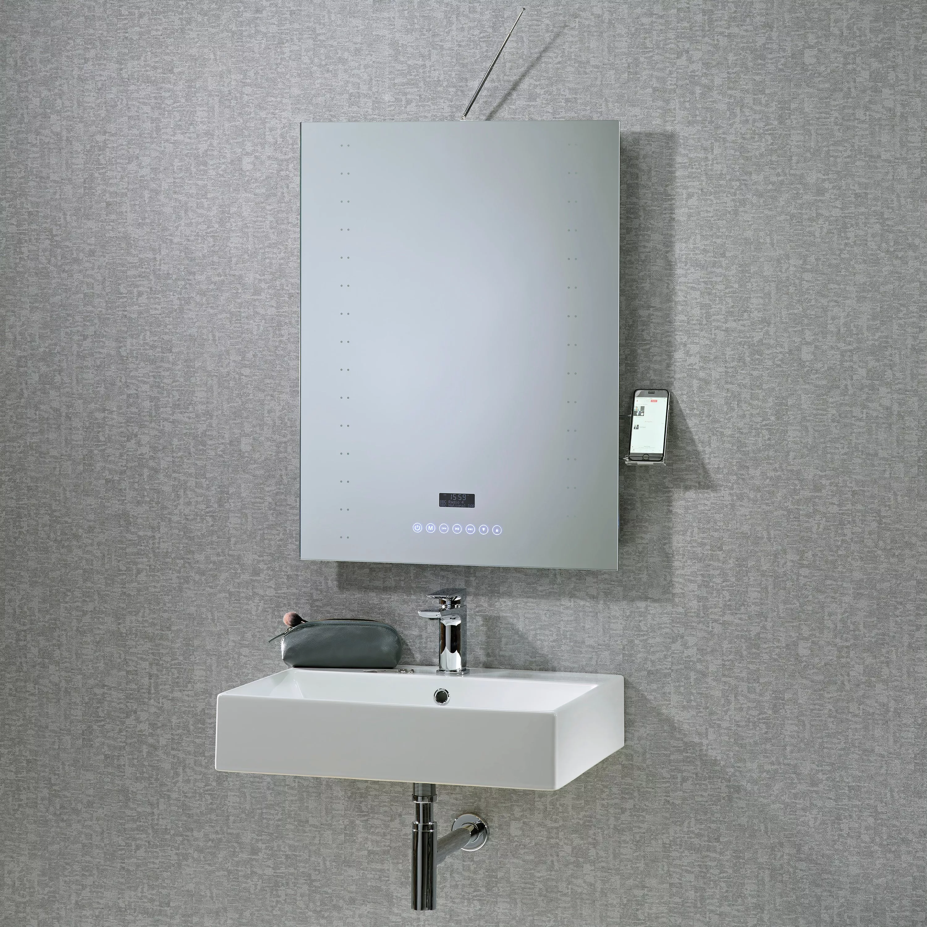 The slick, streamlined mirror has removable media device storage, touch-sensitive controls, a folding aerial and integrated stereo speakers for outstanding sound quality.