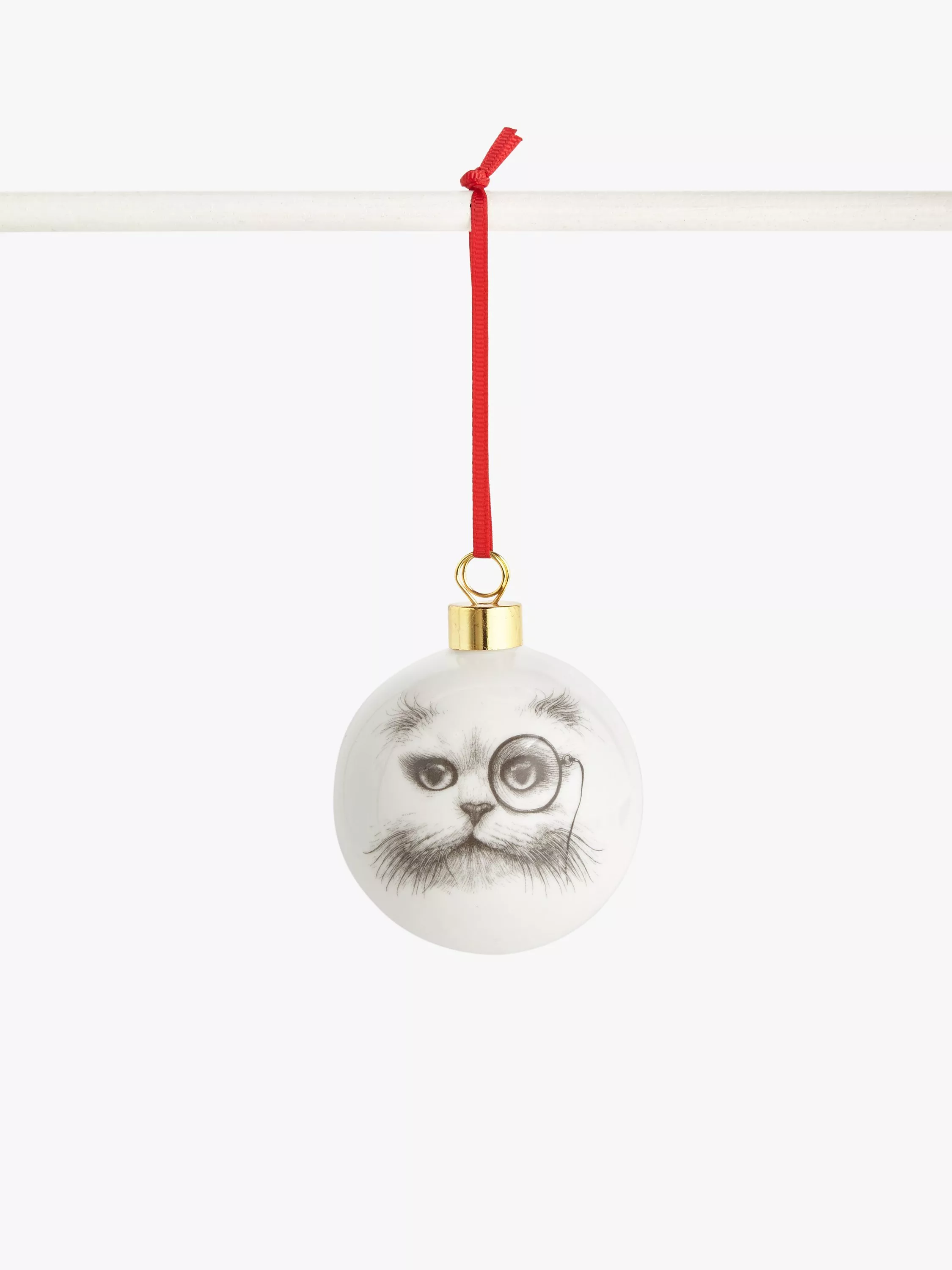 Handmade and hand-decorated this bauble from Rory Dobner is a fun decoration for the Christmas tree. The white ceramic background makes the quirky jet-black illustration of the cat wearing a monocle stand out, and the red ribbon gives a little festive colour as a finishing touch.