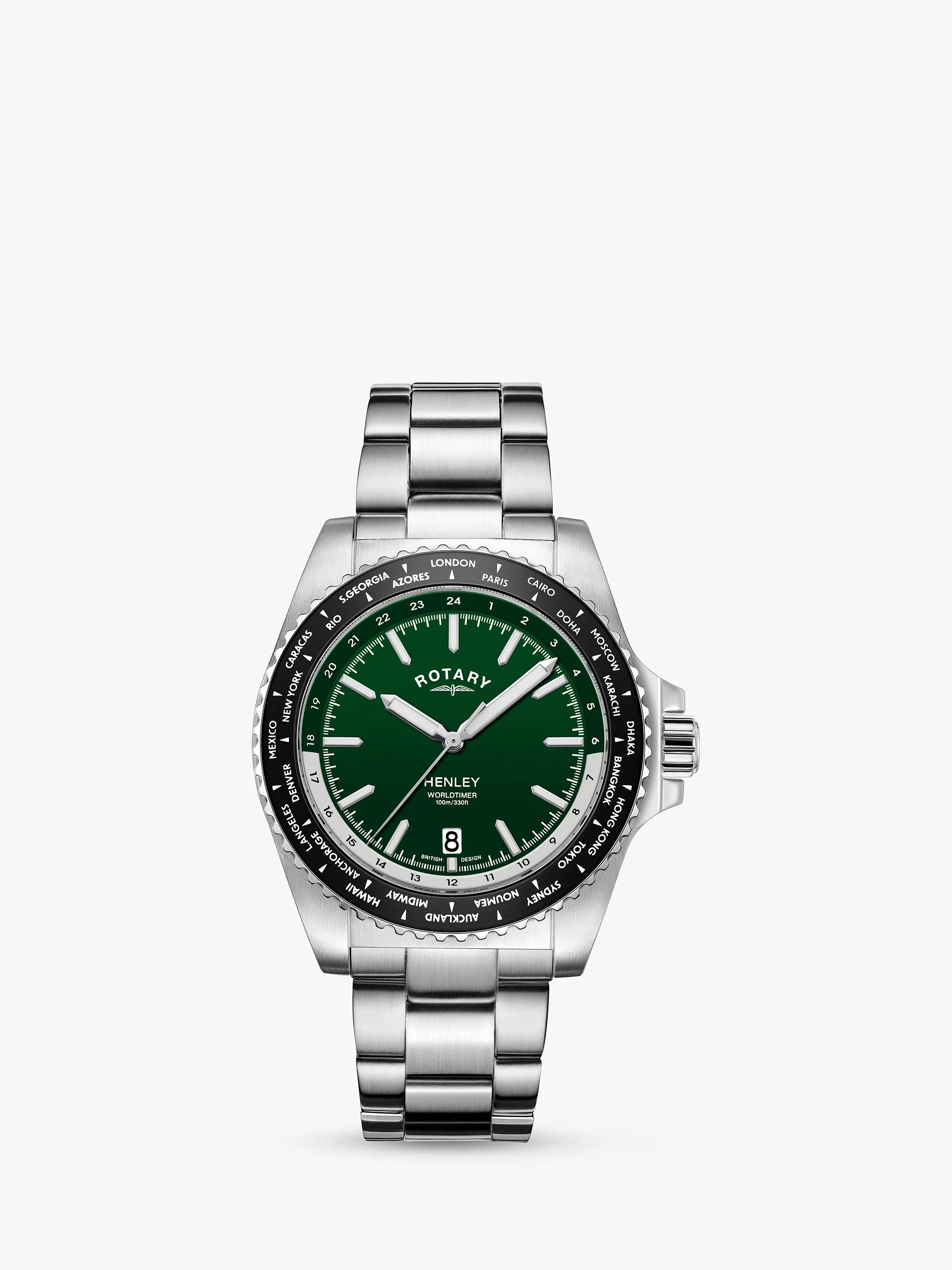 This Henley Worldtimer from Rotary lets you keep track of all 24 main time zones using an aluminium bi-directional bezel, making it perfect for explorers. The stainless steel case measures at 41mm and is water resistant to 100m. This Worldtimer features a coloured dial with applied luminous indexes, all protected by scratch-resistant sapphire glass.