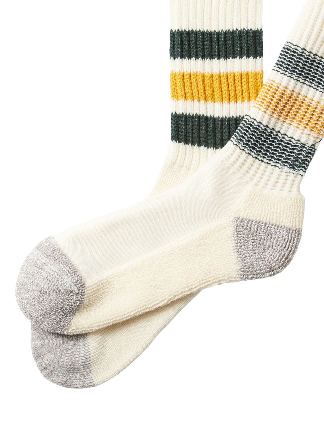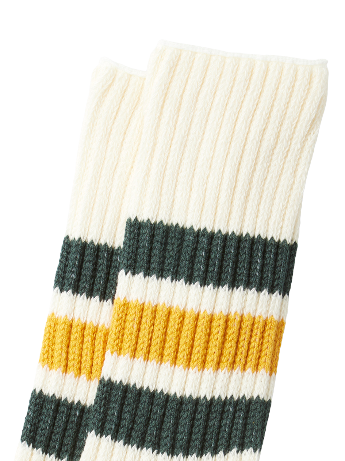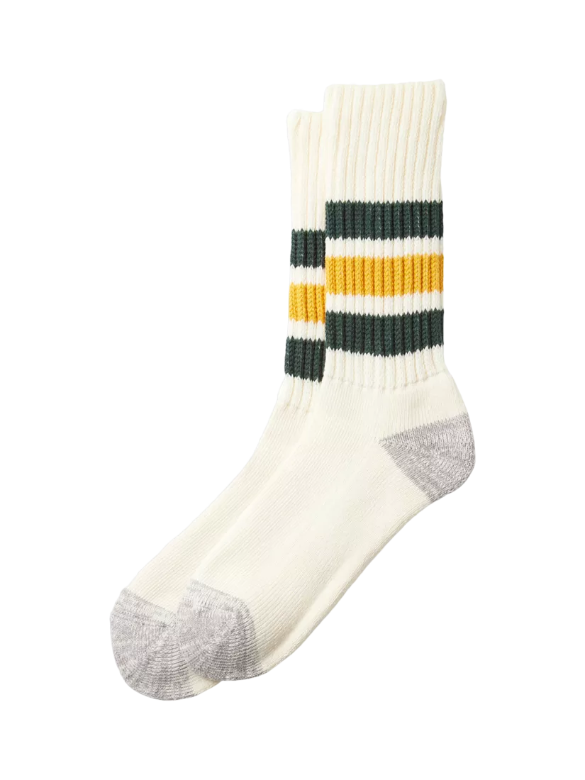 Inspired by retro tube socks, this pair is crafted on a limited-production machine with thick cotton blend yarn and a long-pile sole, offering uniquely soft and resilient comfort.