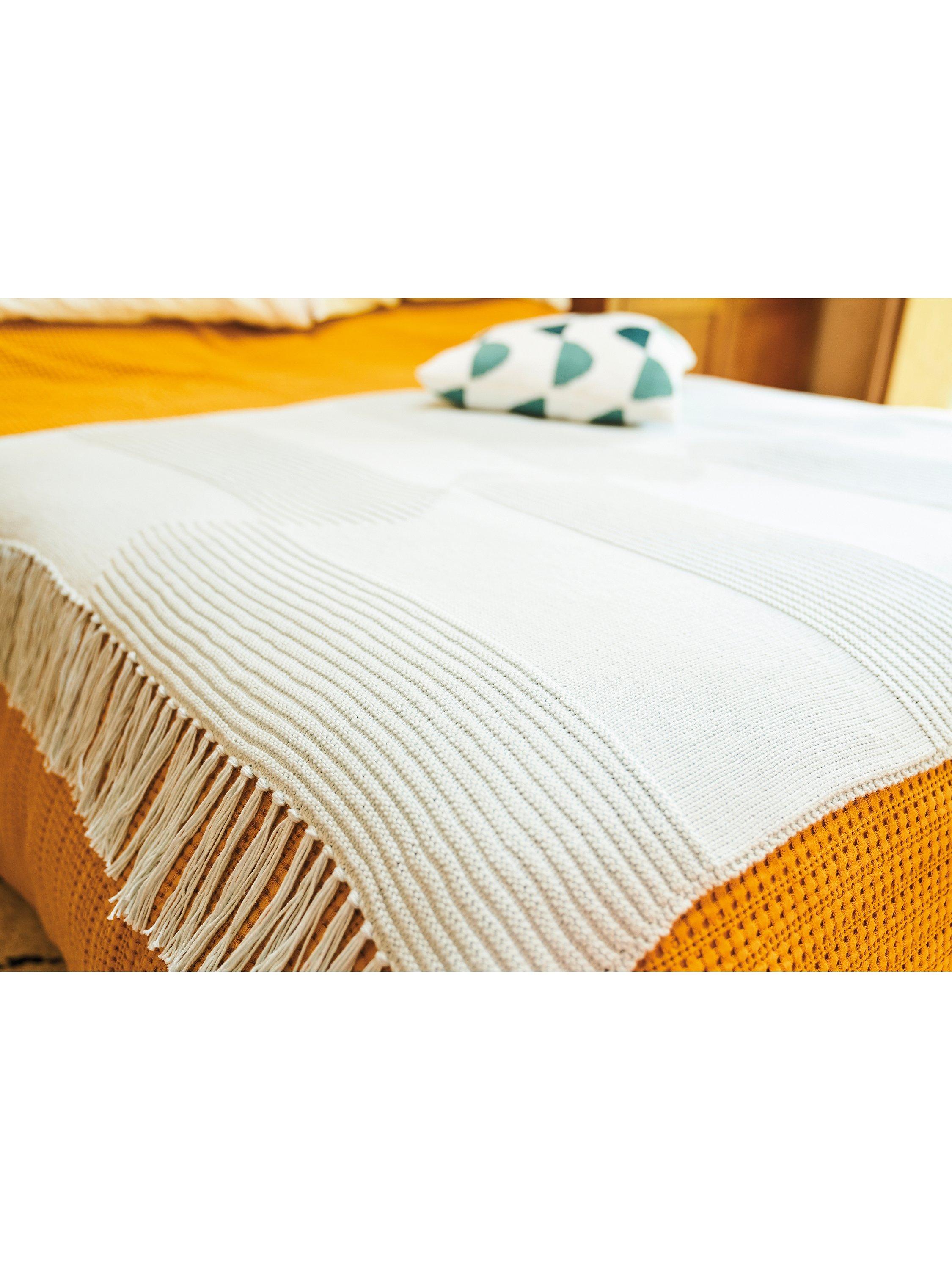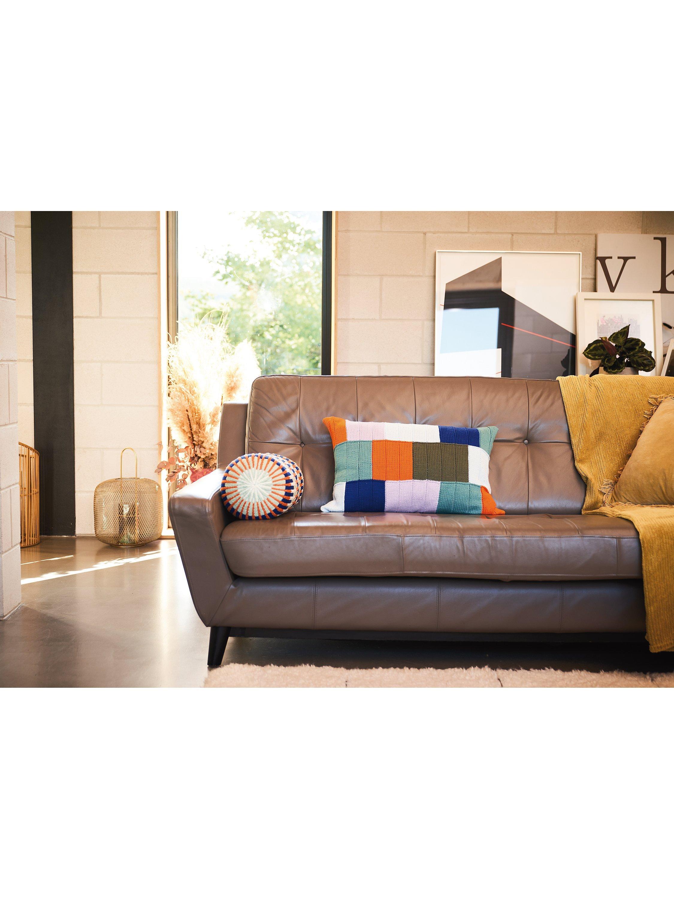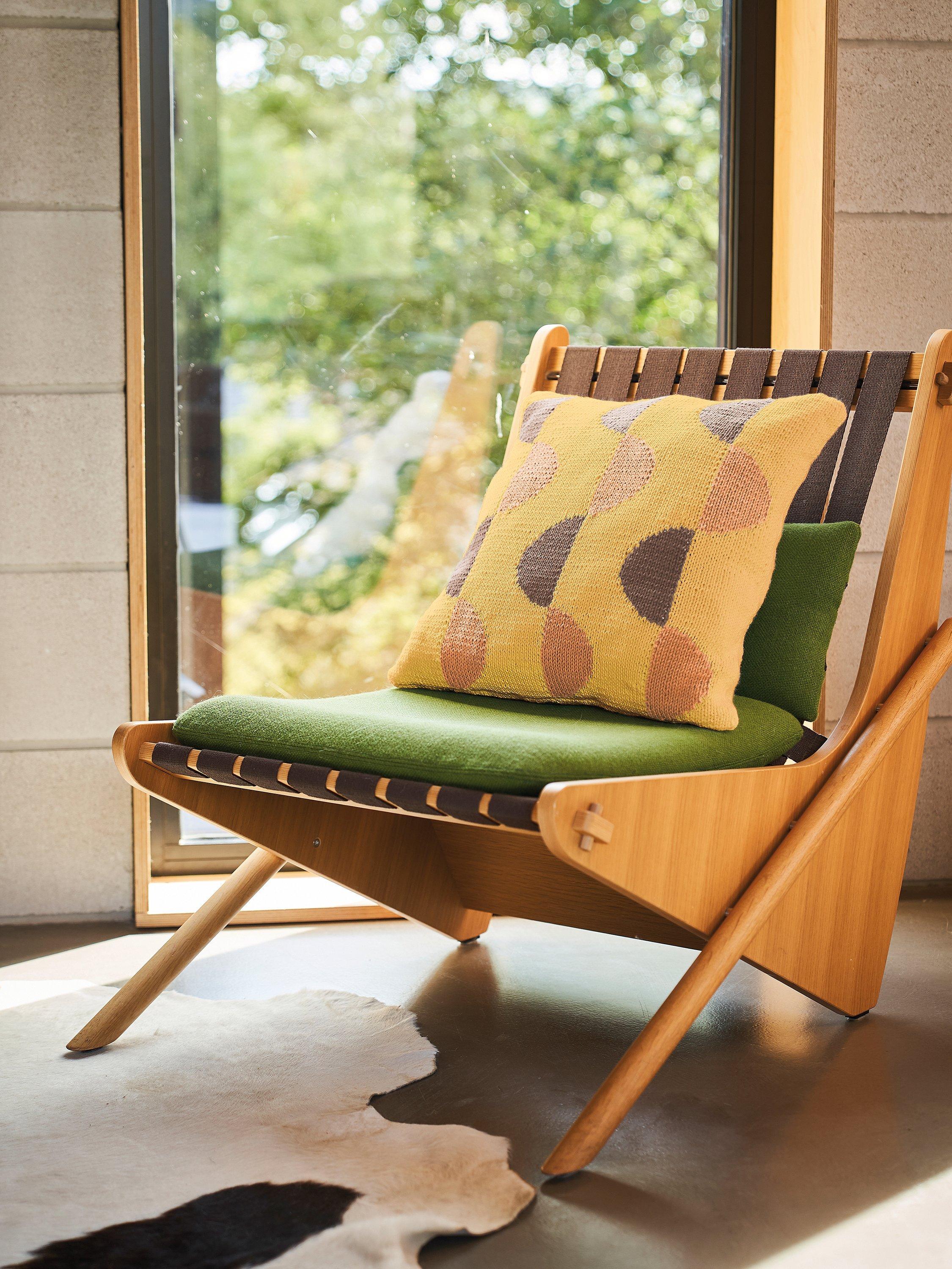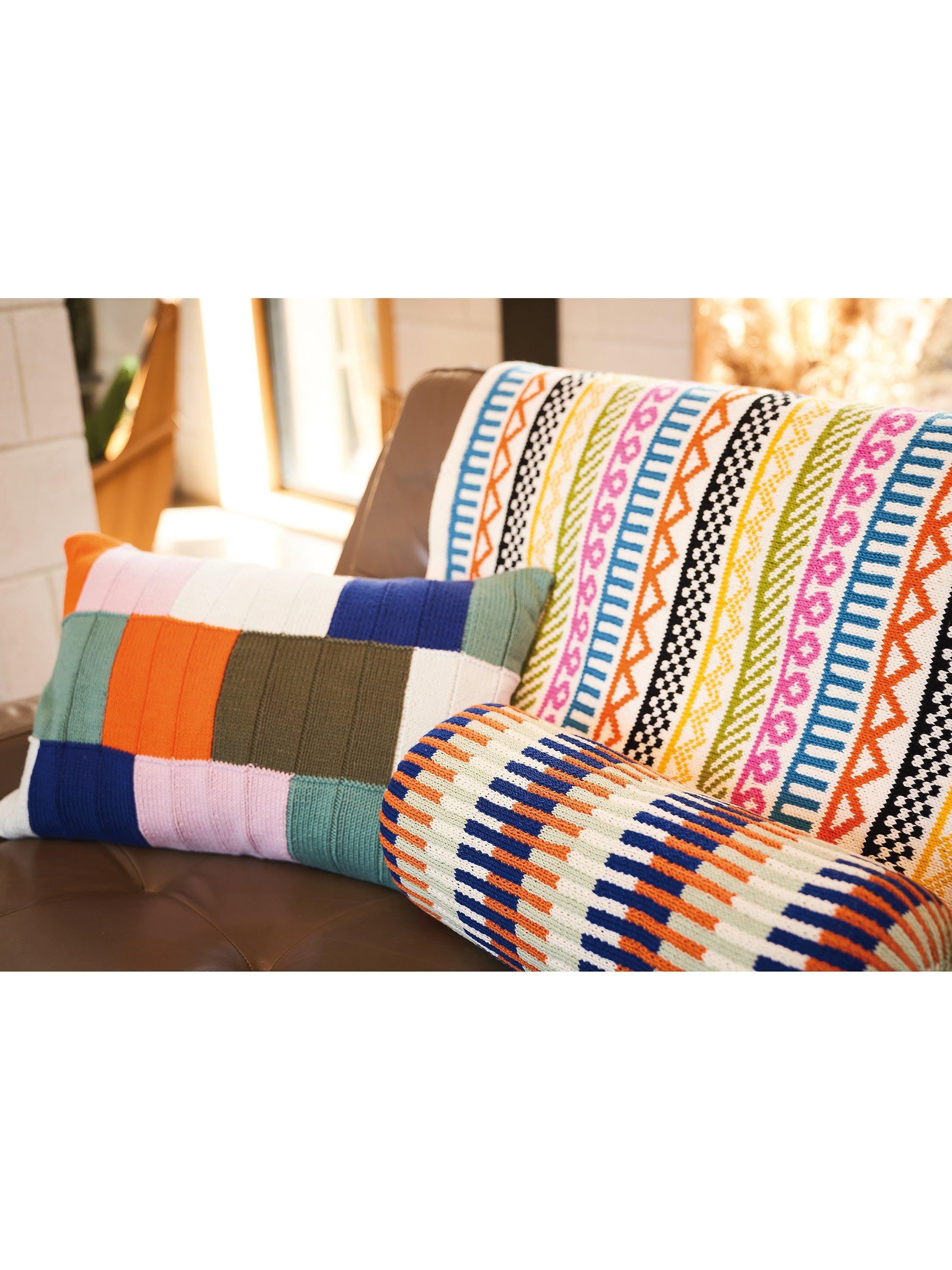 Knitted in a vibrant palette of Handknit Cotton and Cotton Glace, this collection of cushions, throws and wall hangings blends the hand-crafted with a modern, geometric aesthetic.