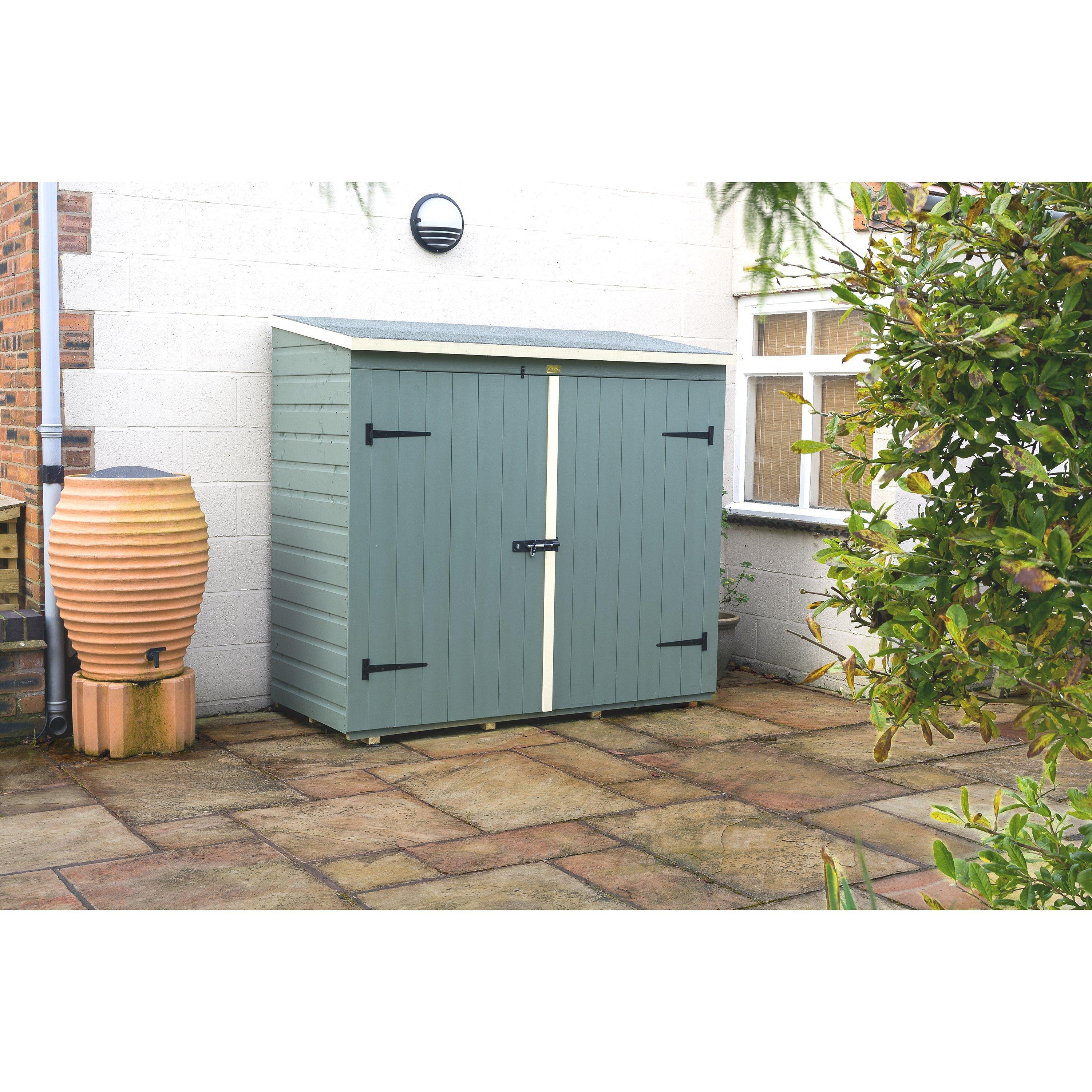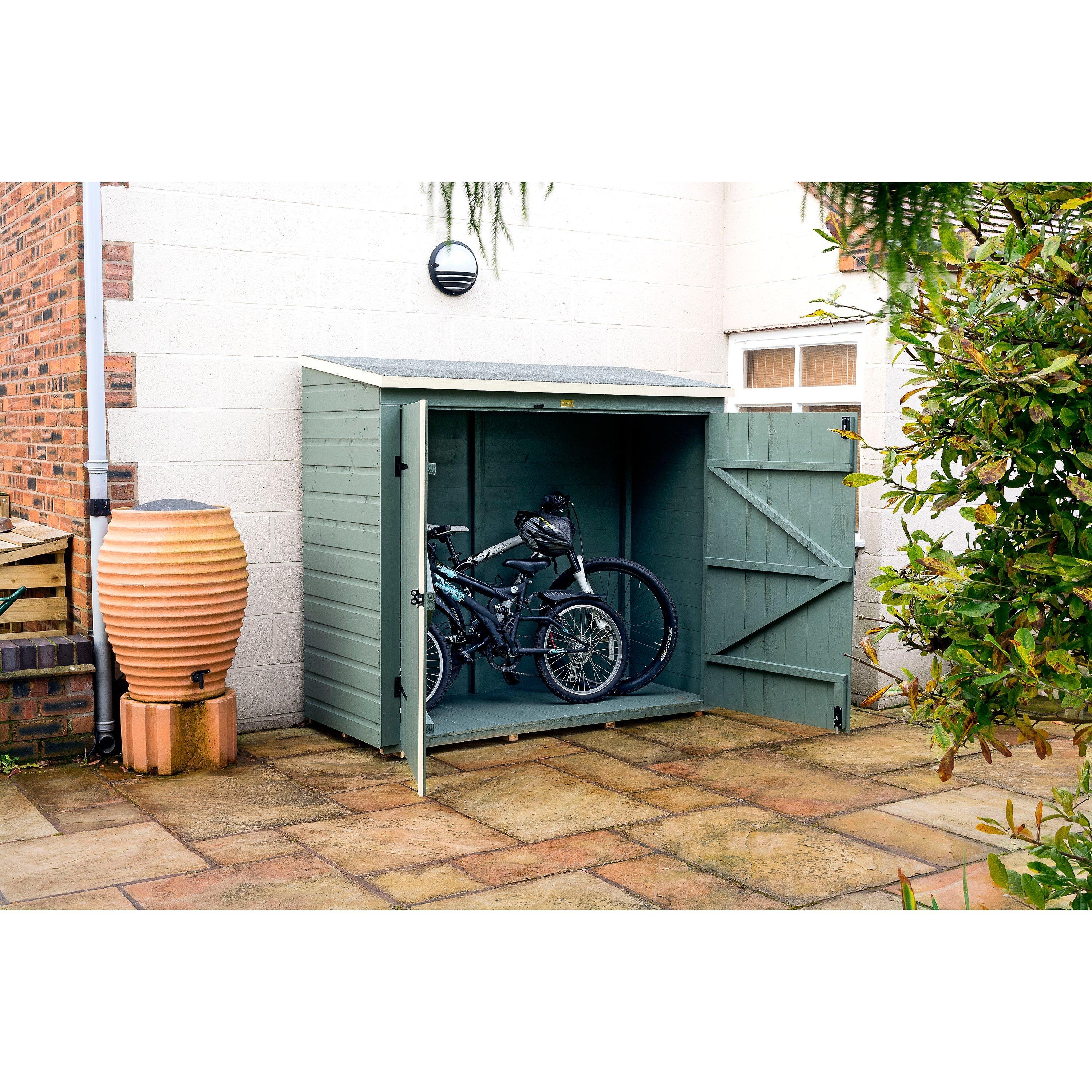 Keep your beloved bike or tools tucked up snugly with this attractive, elegant solution to garden storage. The wall store has sufficient height and width to accommodate up to two adult bikes, as well as a wide range of gardening tools and equipment (even sizable pieces such as a lawnmower). Pre-painted in willow green and cream, the store features sturdy shiplap tongue-and-groove construction and a durable mineral felt roof.