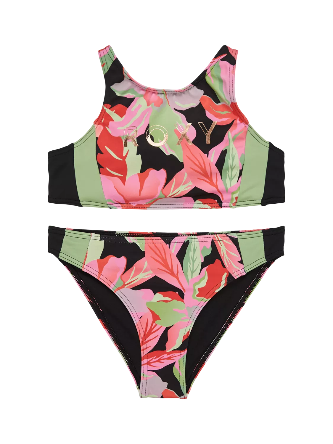 A 2 piece swimsuit with an all over floral and iconic Roxy logo detailing.