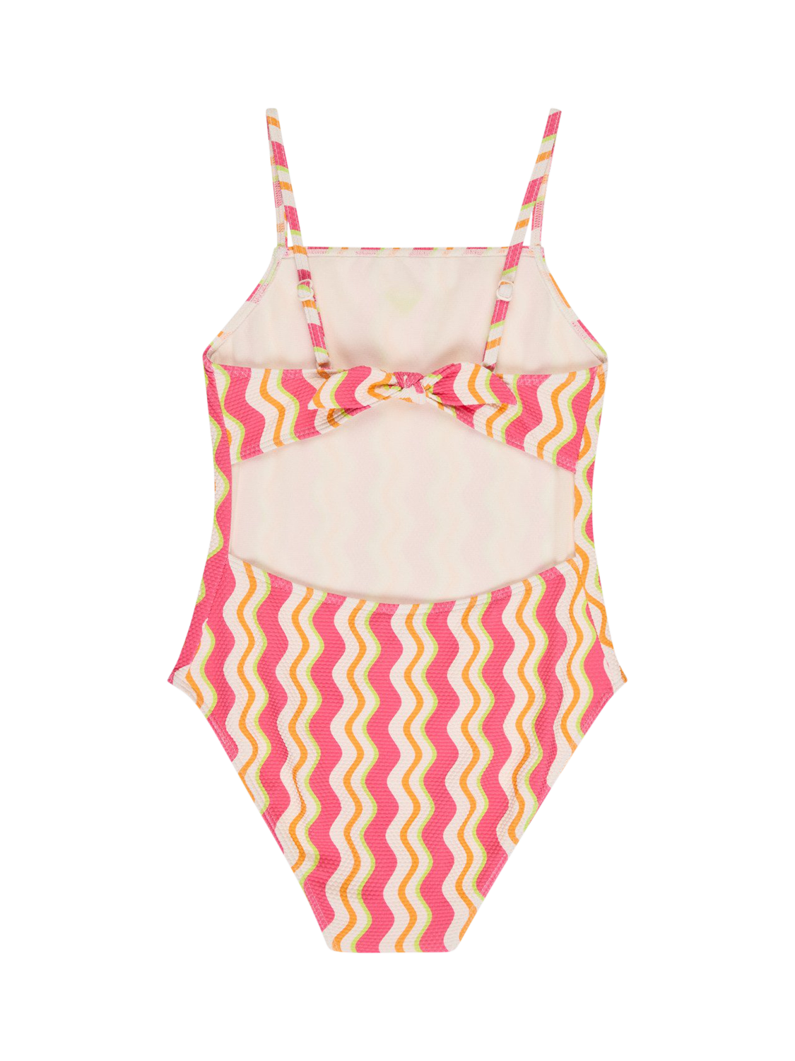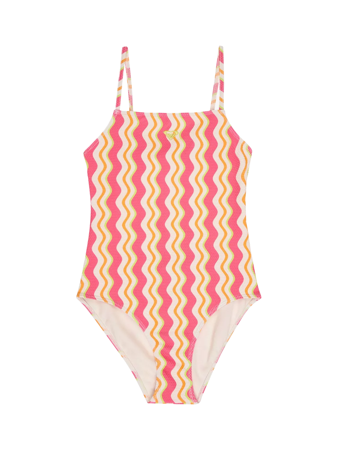 This swimsuit features a square neck and wavy stripe pattern, made in a soft stretch piqué textured fabric with adjustable straps for a comfortable fit.