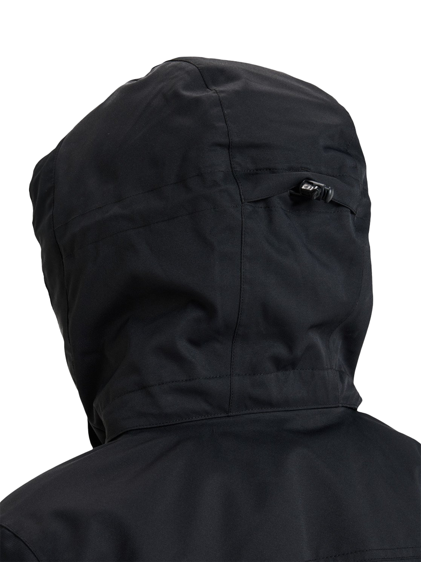 The design is clever and useful with practical details. The helmet-friendly hood includes a gaiter for full protection, and the fixed taffeta snap-away powder skirt keeps snow out. Secure storage is provided by handwarmer pockets that contain a hem adjuster, an internal goggle pocket, and a sleeve pass pocket. The sleeve cuff adjusters seal in warmth.