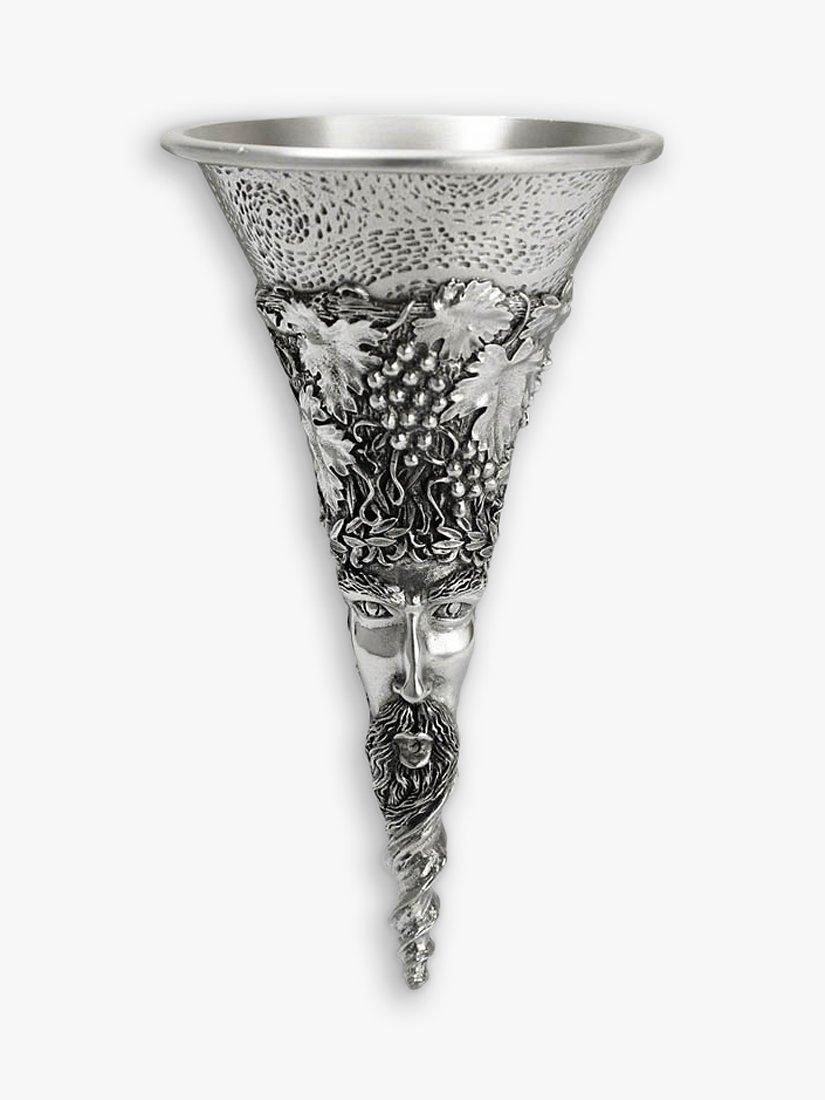 Sculpted into the pewter funnel he is crowned with clusters of grapes and his beard tapers down to the tip. When wine is poured through the funnel it appears to be blown out through Bacchus' lips, into the wall of the decanter, and in doing so the aromas and flavours of the wine are fully released.