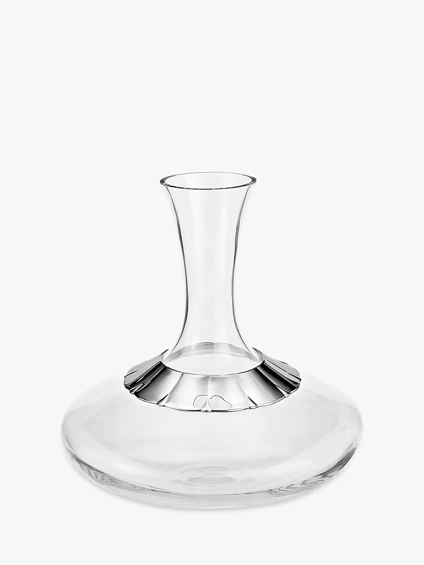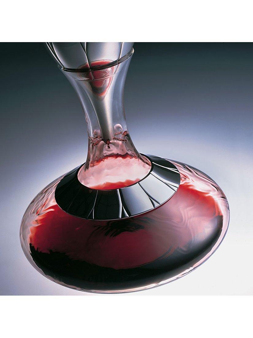 Elegantly designed with sleek lines, it's made from handcrafted glass with a fluted pewter band encircling the base of the neck. The long and straight neck and large, rounded base is ideal for aerating the wine, allowing it to breathe at rest, and releasing the beautiful aromas.