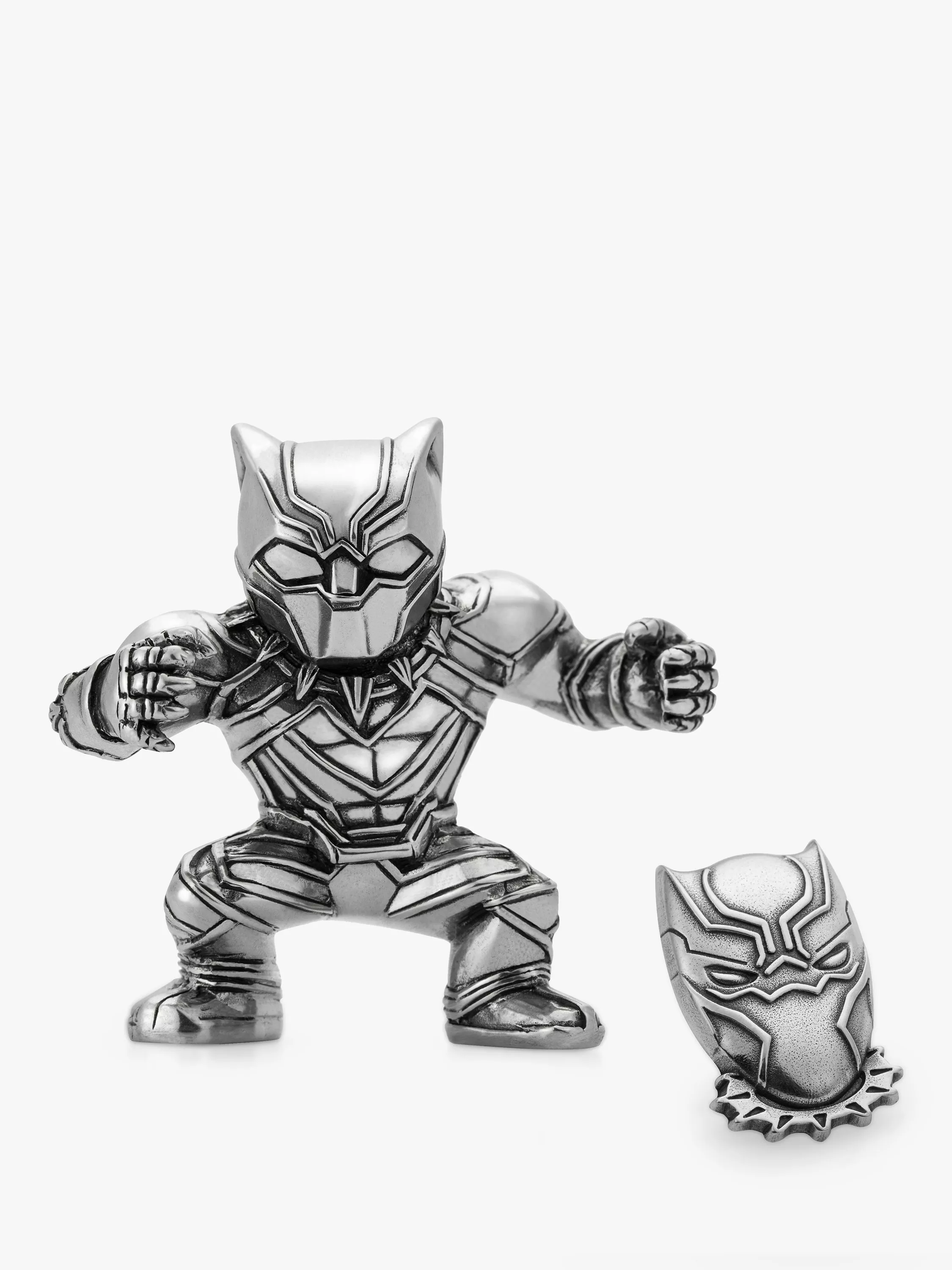 Sculpted in Royal Selangor's signature pewter with incredible attention to detail, the figurine shows the warrior king of Wakanda standing ready to pounce into action. The cat-inspired hood and signature choker of sharp claws is also reproduced as a lapel pin to complete the set.