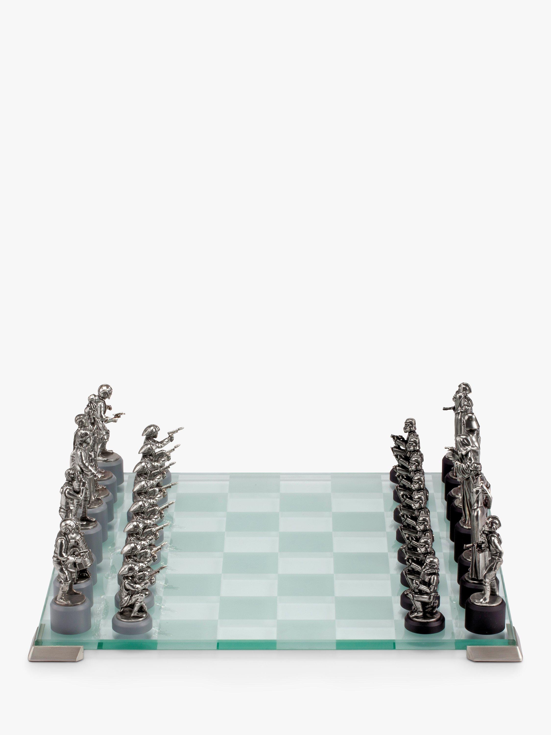 Each figure is made in Royal Selangor's signature polished pewter and has a satin finish. They face each other on the tempered glass chessboard, capped by pewter feet.