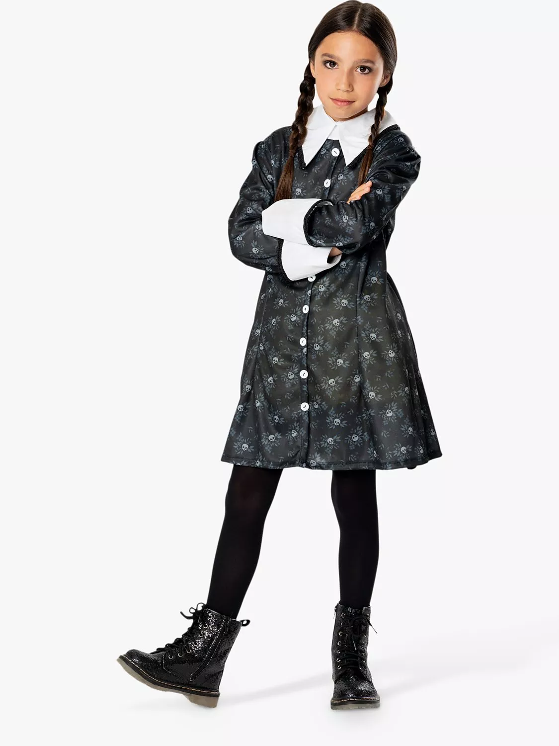 Perfect for Halloween and fancy dress parties, this costume will transform your little one into a gothic Wednesday Addams. A realistic interpretation, the ball dress features a statement collar and cuffs and it's decorated with spooky skulls.
