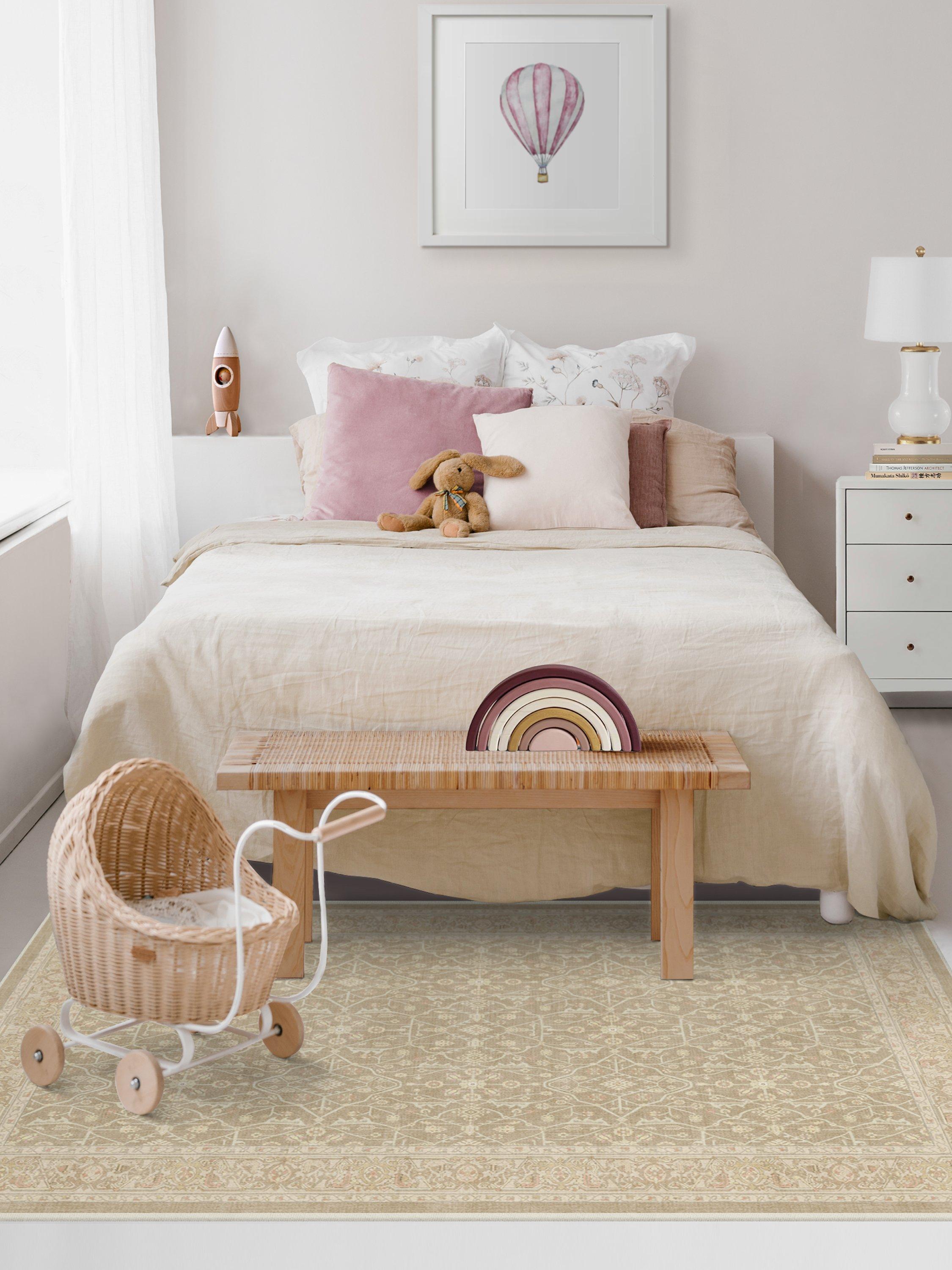The Celestine Rug gives off a celestial vibe with its whimsical floral theme. Designed to look like a lattice panel, this rug features a slim border and a large field of floral vines crawling through a grid-like pattern, bringing warmth and a touch of nature-inspired beauty to your interiors. Water-resistant, stain-resistant, and machine-washable. Rug colours may vary slightly according to your device and the lighting in your space.