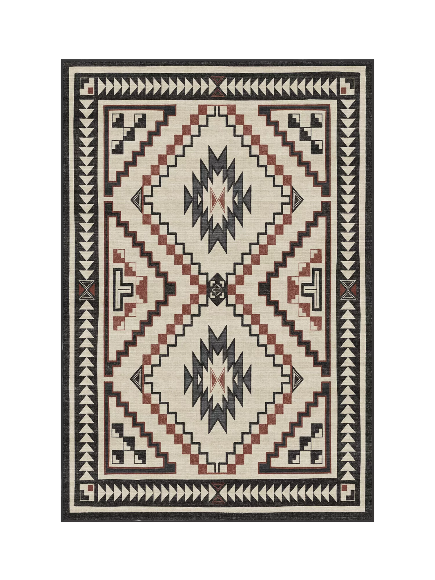 The Desert Rug features a central diamond pattern surrounded by four corner triangles in striking hues. Inspired by Southwestern motifs, this geometric rug will make a statement in any room. Water-resistant, stain-resistant, and machine-washable. Rug colours may vary slightly according to your device and the lighting in your space.