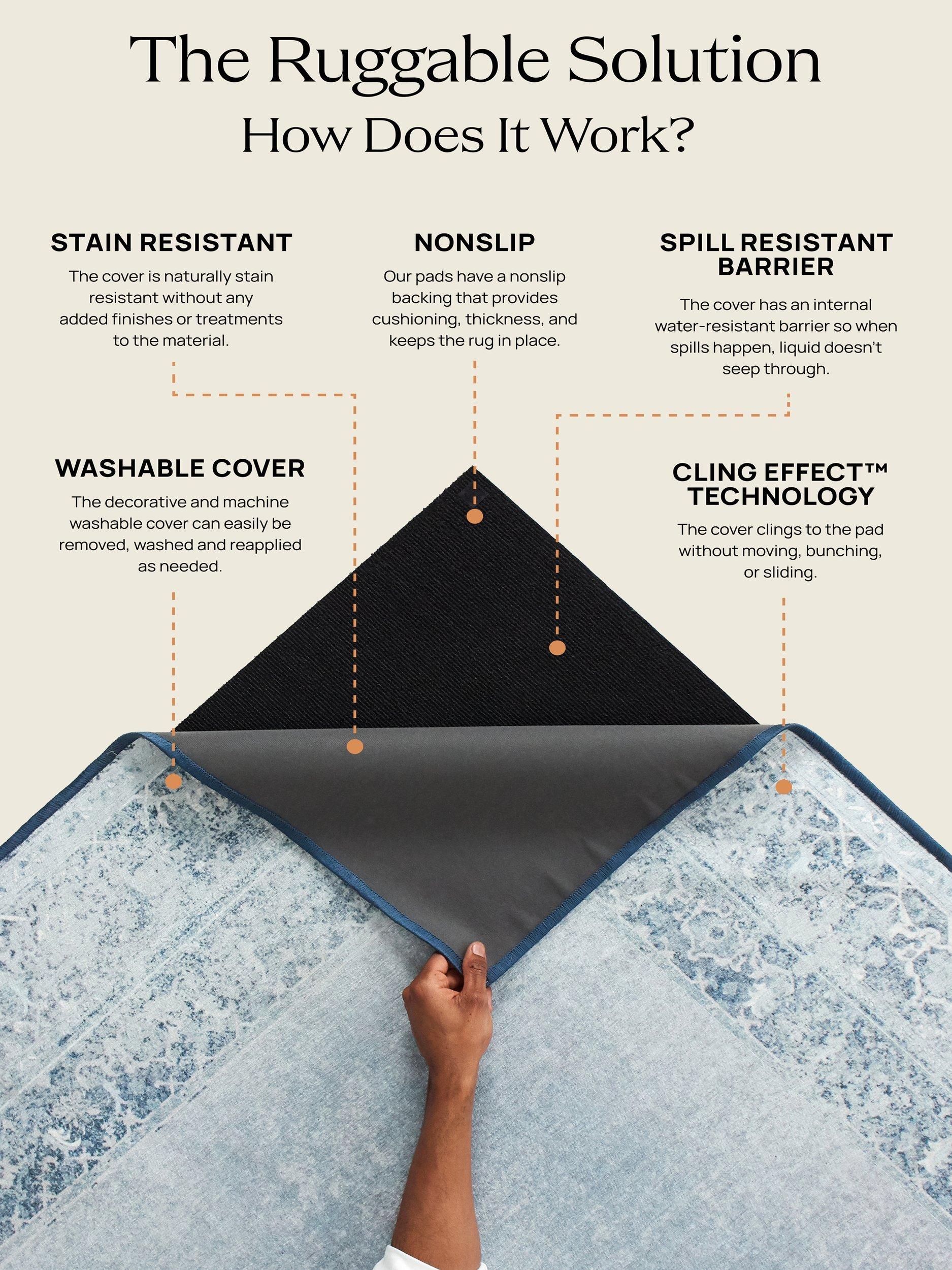 When it comes to washable rugs, Ruggable stands out from the pack. Thoughtfully designed and created to withstand whatever life throws at them: dirt, dust, spills, and even pet accidents. The rugs are fully machine washable, making it easy and affordable to keep them clean. The low-pile, flatwoven washable rugs feature a non-toxic, water-resistant barrier that shields your floors from everyday stains, spills, and unwanted odours. The rug pads feature non-slip latex-free backing to keep your rug in place. Rugs look new again after each wash and they have water-resistant protection that doesn't deteriorate after washing. The 2-piece system allows the non-slip grip to stay out of the washing machine and your rug to stay in place. Ruggable rugs are pet-friendly, kid-friendly, and life-friendly. No stress over spills, soft for tiny toes & paws, and safe & non-toxic.