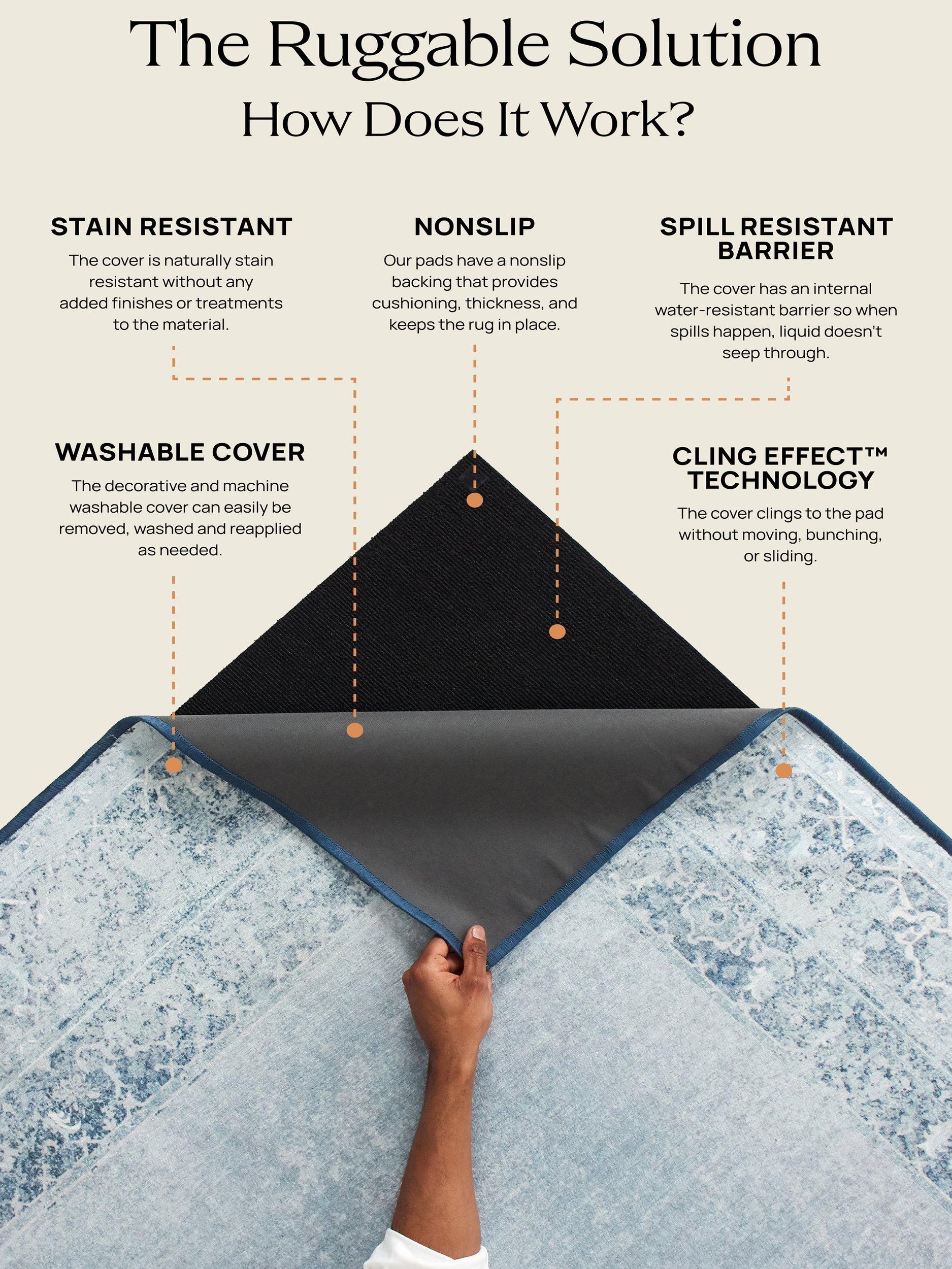 - The 2-piece system allows the non-slip grip to stay out of the washing machine and your rug to stay in place. Ruggable rugs are pet-friendly, kid-friendly, and life-friendly. No stress over spills, soft for tiny toes & paws, and safe & non-toxic.