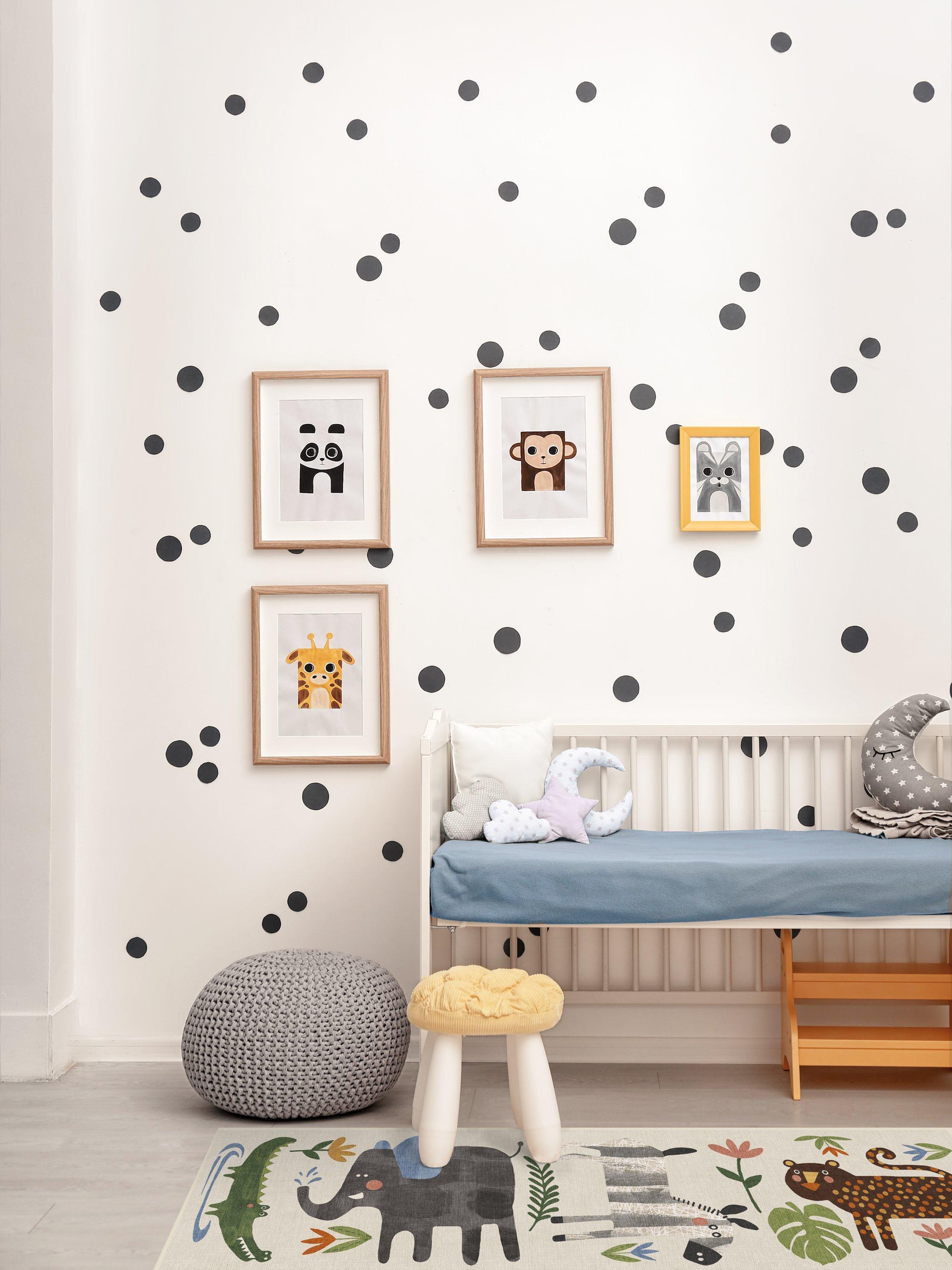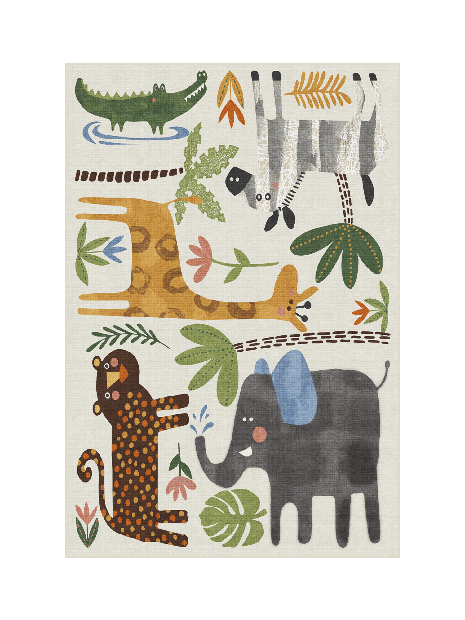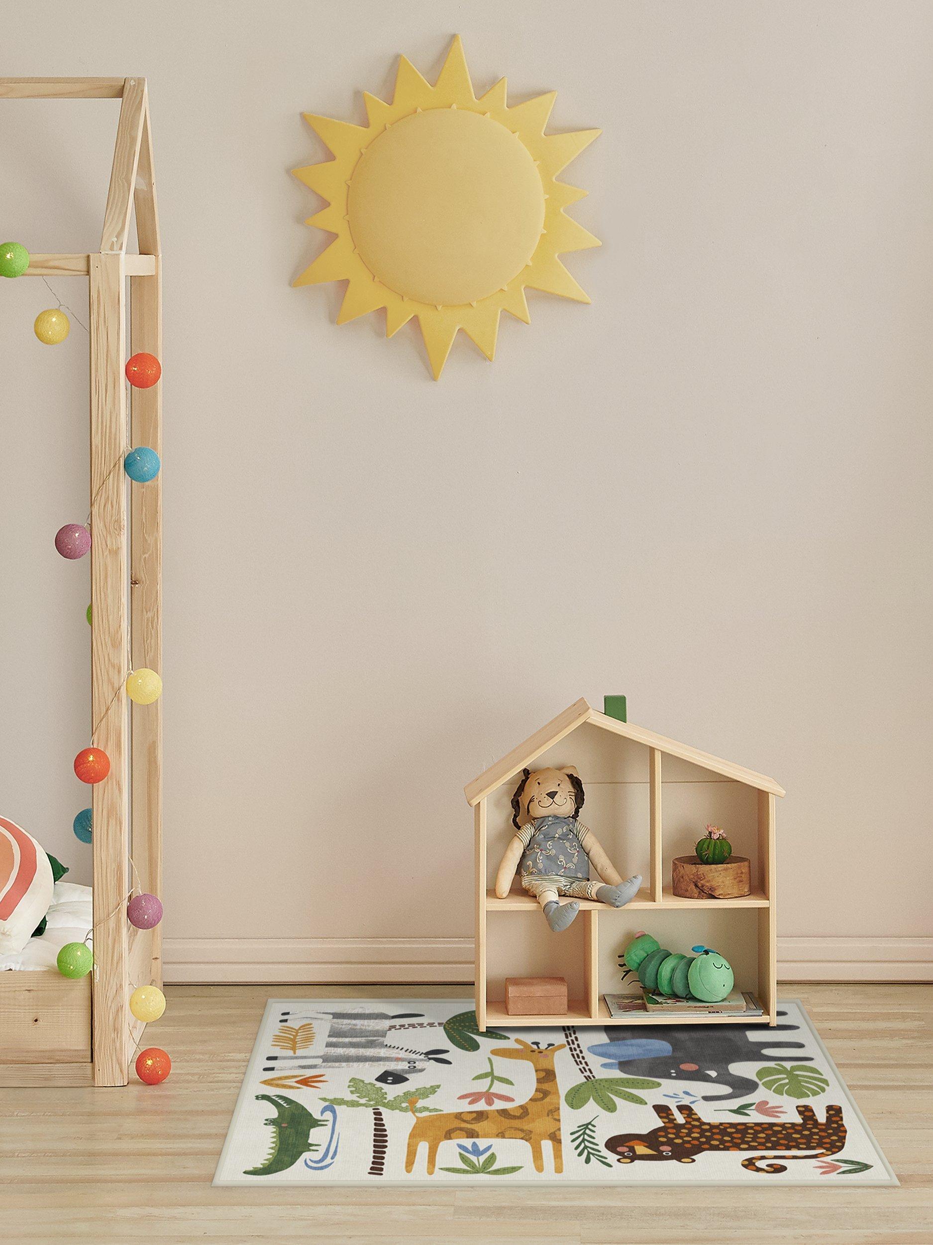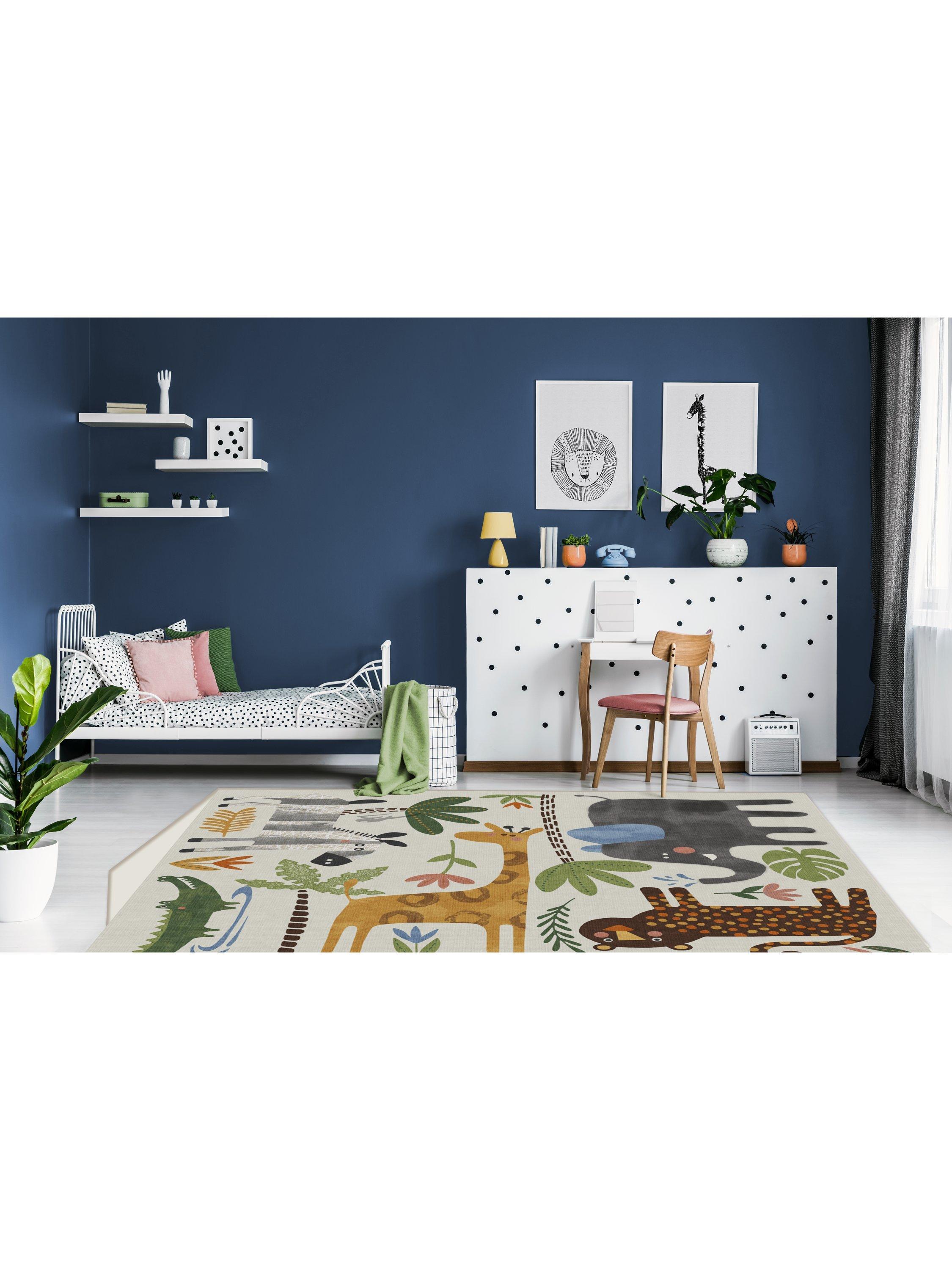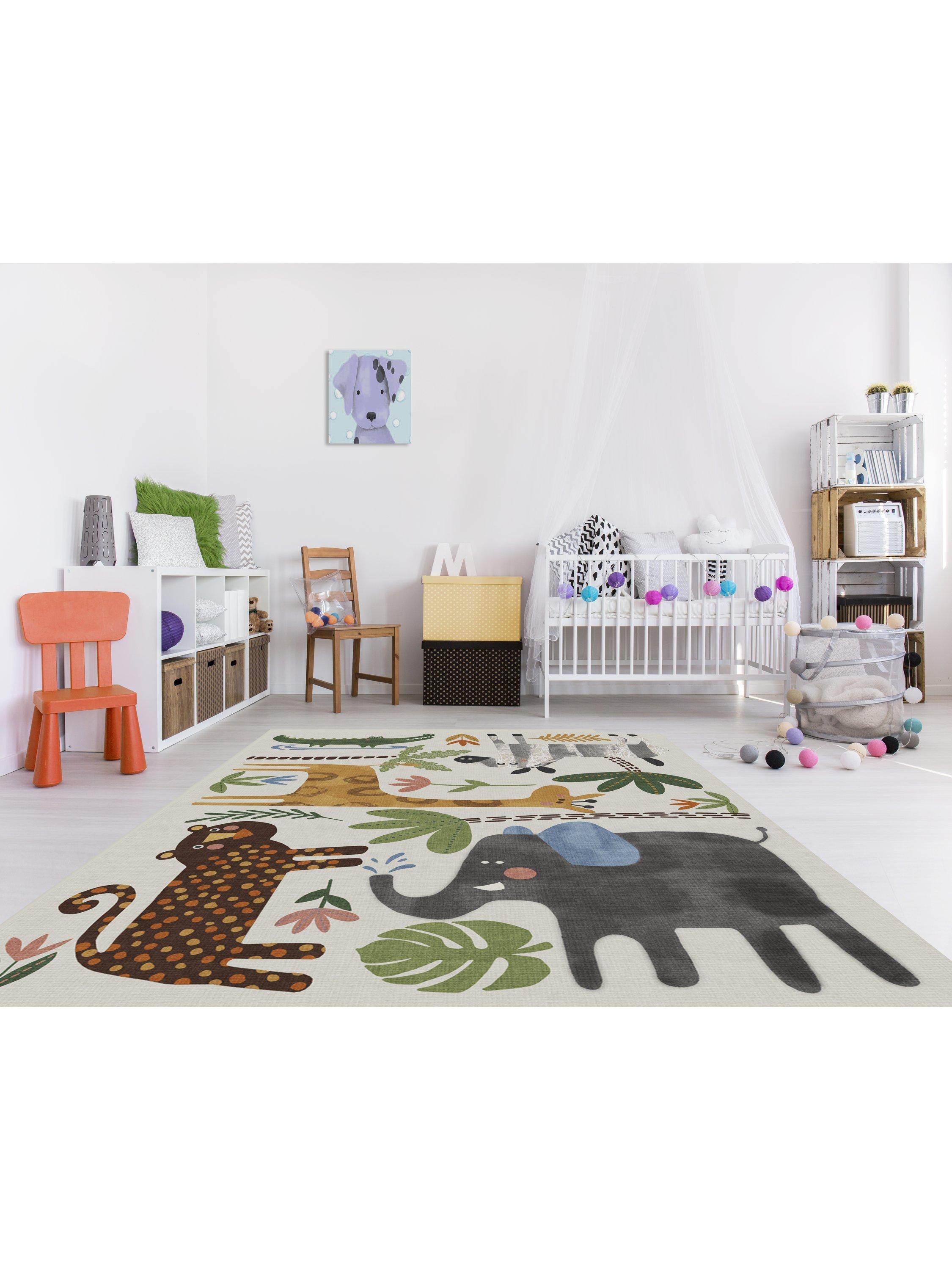 Little explorers will love this crew of critters on the Jungle Safari Multicolour Rug. Tinted in watercolour hues, this rug features cheerful animals - lion, zebra, giraffe, elephant, and crocodile - roaming among rubber trees, leaves and flowers, adding a wildly whimsical touch to any child's space. Water-resistant, stain-resistant, and machine-washable. Colours may vary slightly according to your device and the lighting in your space.