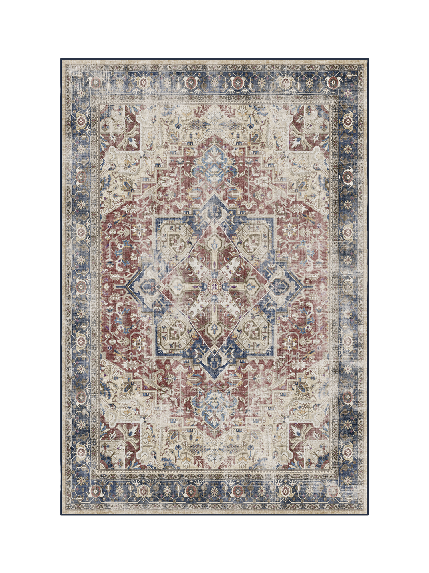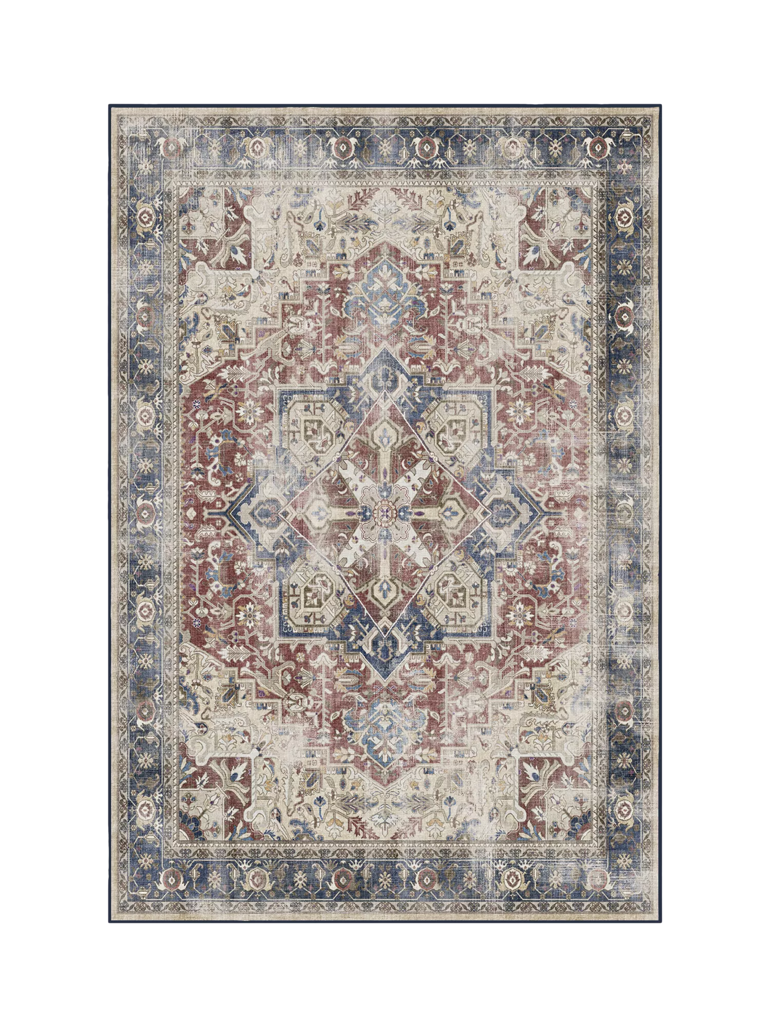 A Persian design with a distressed look. Inspired by traditional Heriz rugs, Ruggable's Kamran Rug features a large medallion with an ornate border in rich shades of vintage colours. Water-resistant, stain-resistant, and machine-washable. Rug colours may vary slightly according to your device and the lighting in your space.