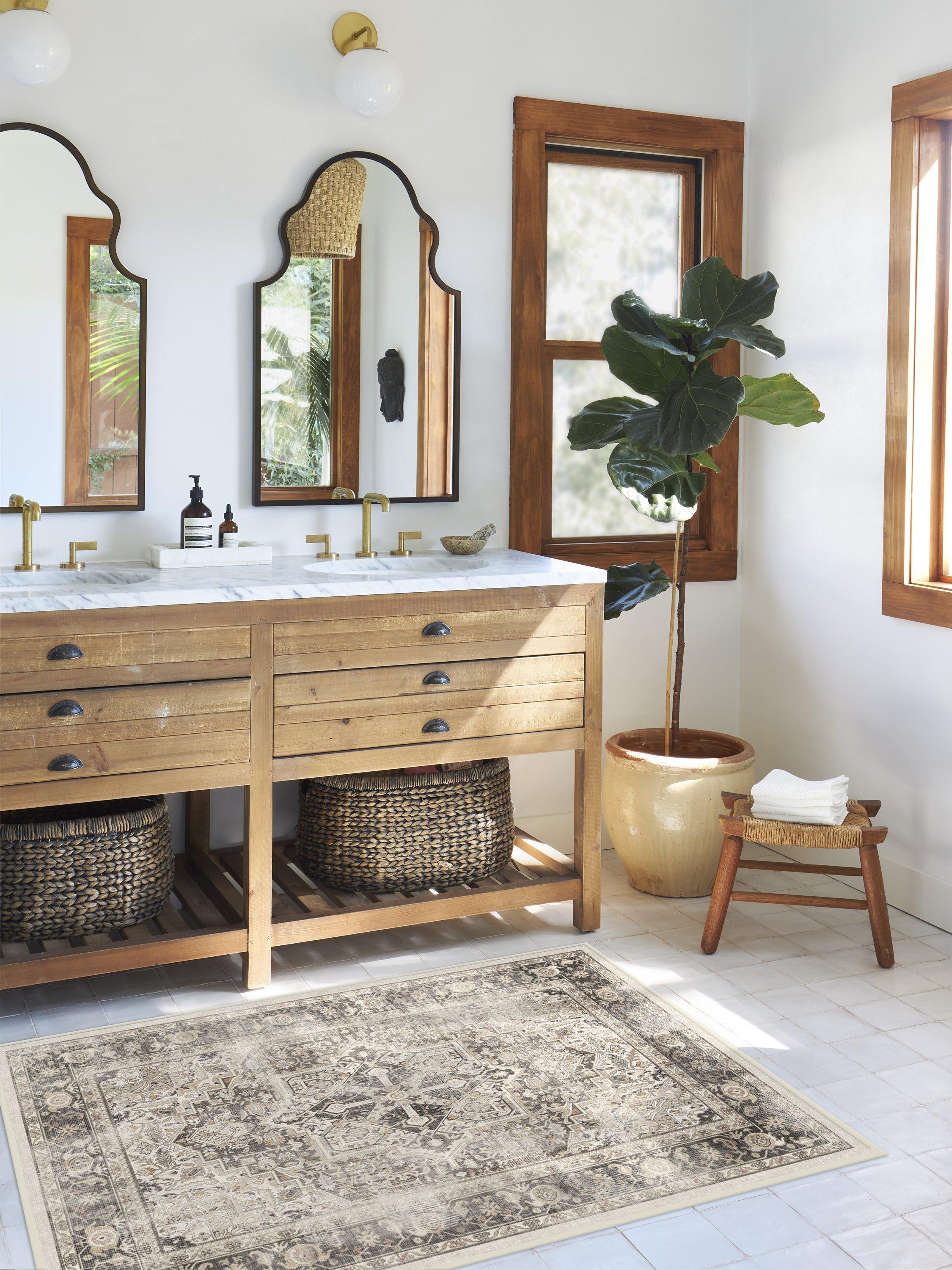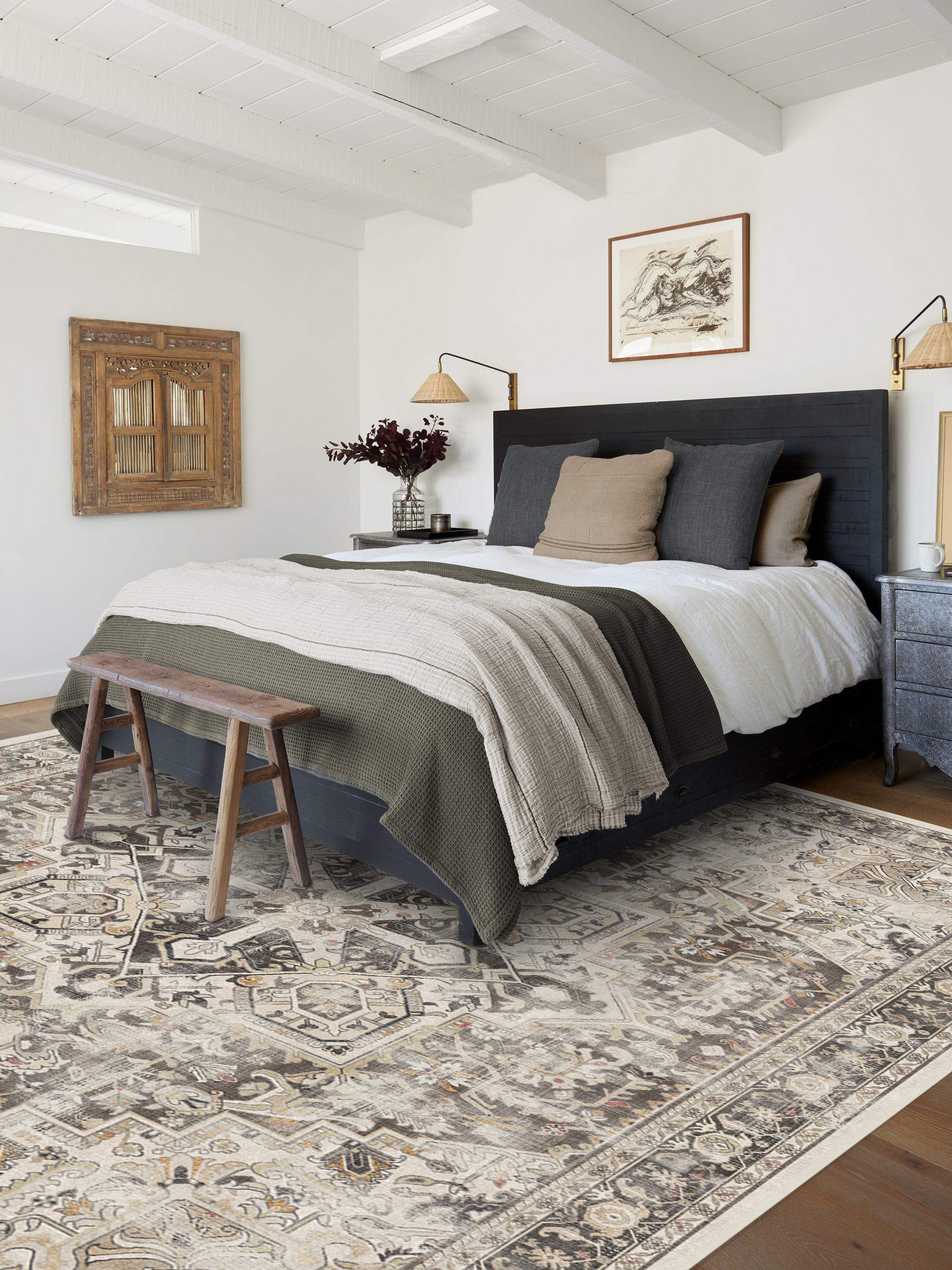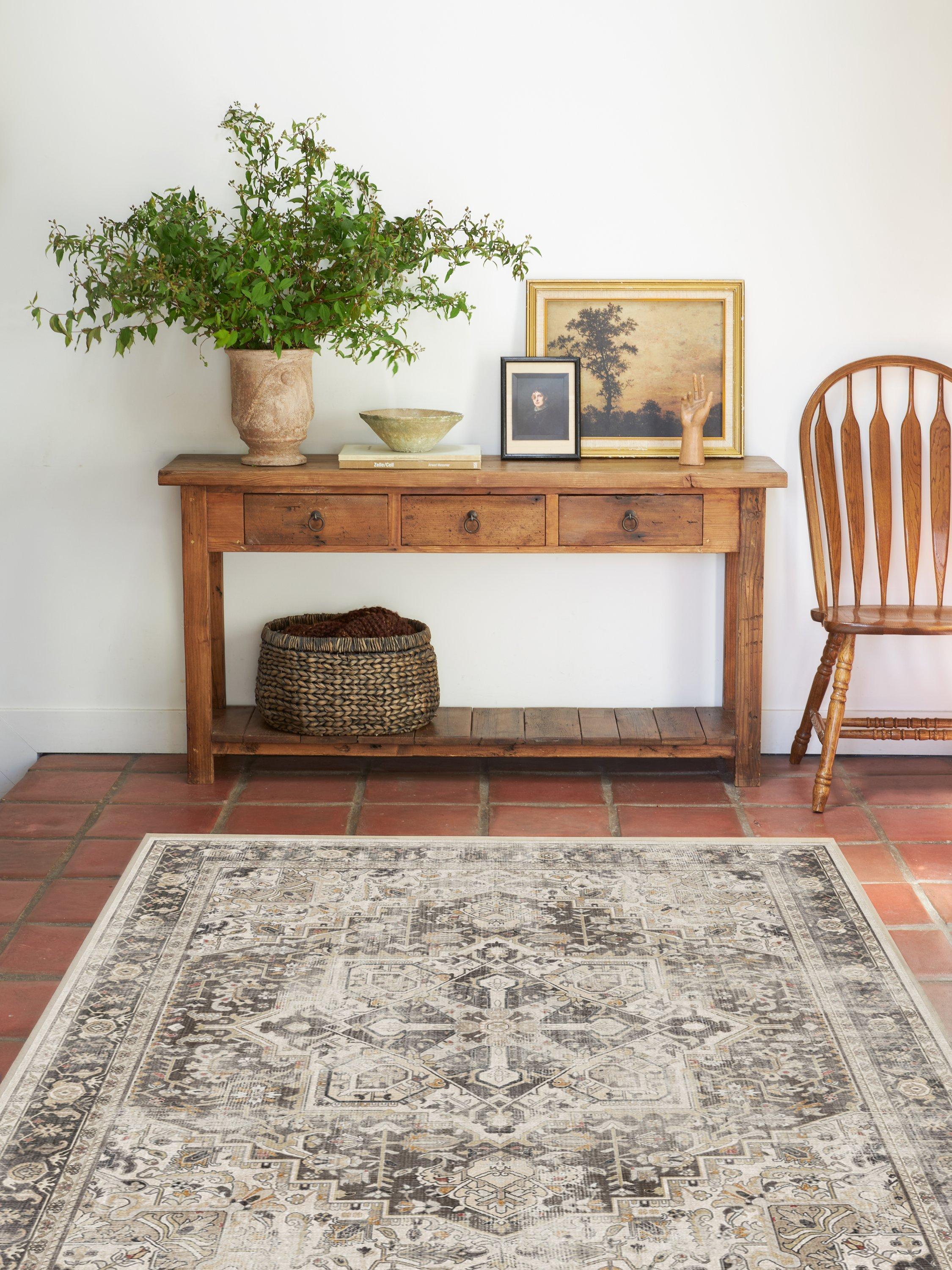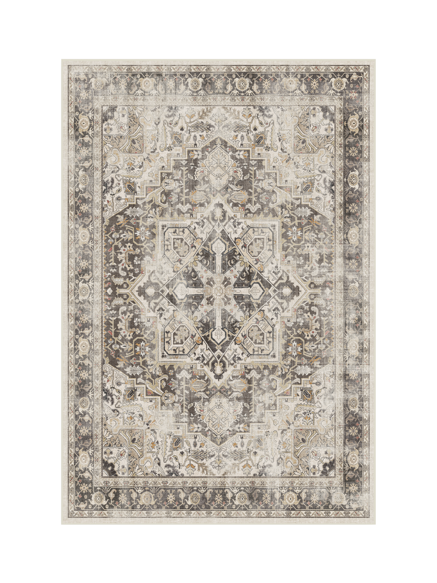 An upscale, elegant statement maker. This design is purposefully distressed for that weathered, rustic look. The large medallion and ornate border are inspired by traditional Heriz rugs and have a vintage look that will complement a variety of decor. Water-resistant, stain-resistant, and machine-washable. Colours may vary slightly according to your device and the lighting in your space.