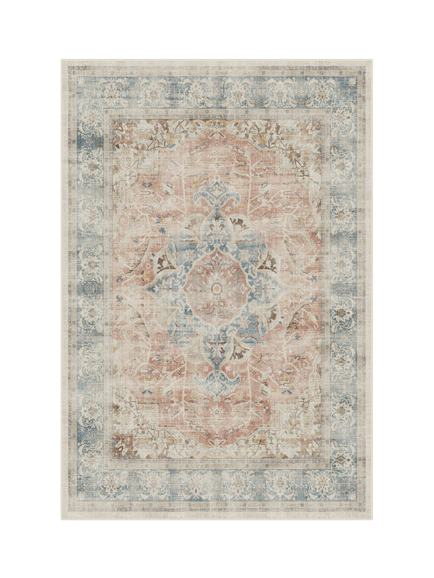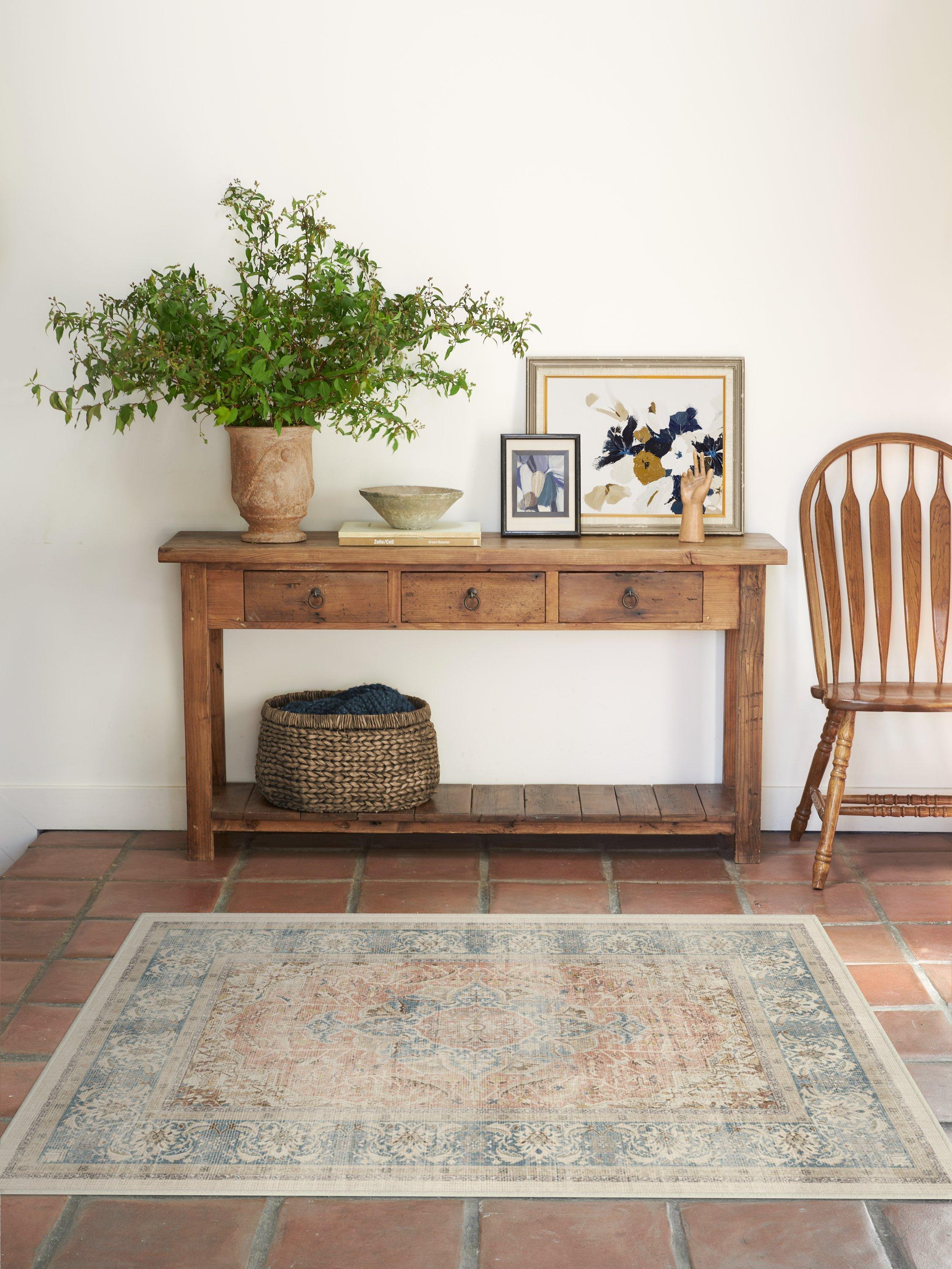 Warm and rustic. Beautiful shades blend together in this rug to create a beautifully rich, distressed design featuring a floral medallion and border. Water-resistant, stain-resistant, and machine-washable. Rug colours may vary slightly according to your device and the lighting in your space.