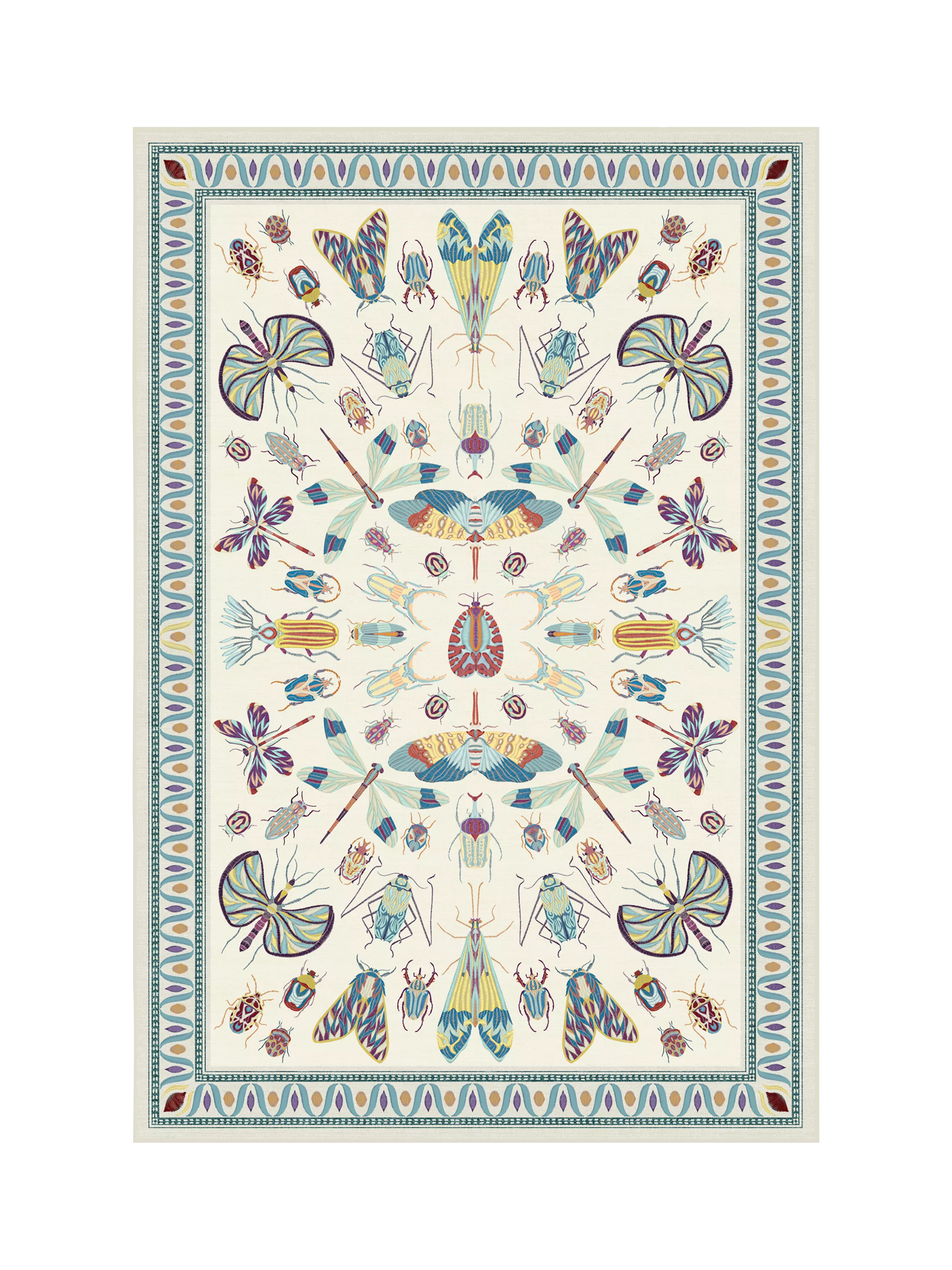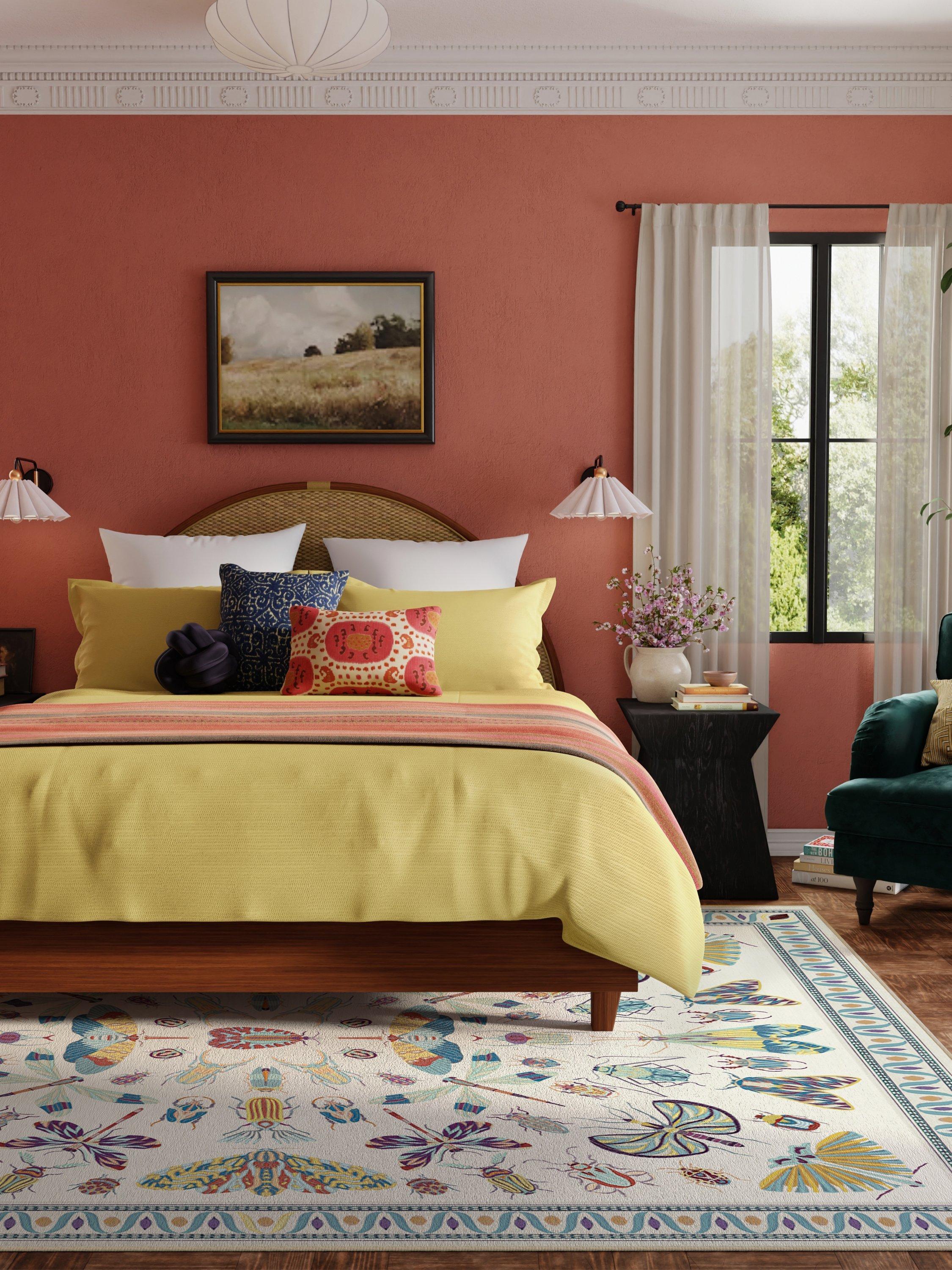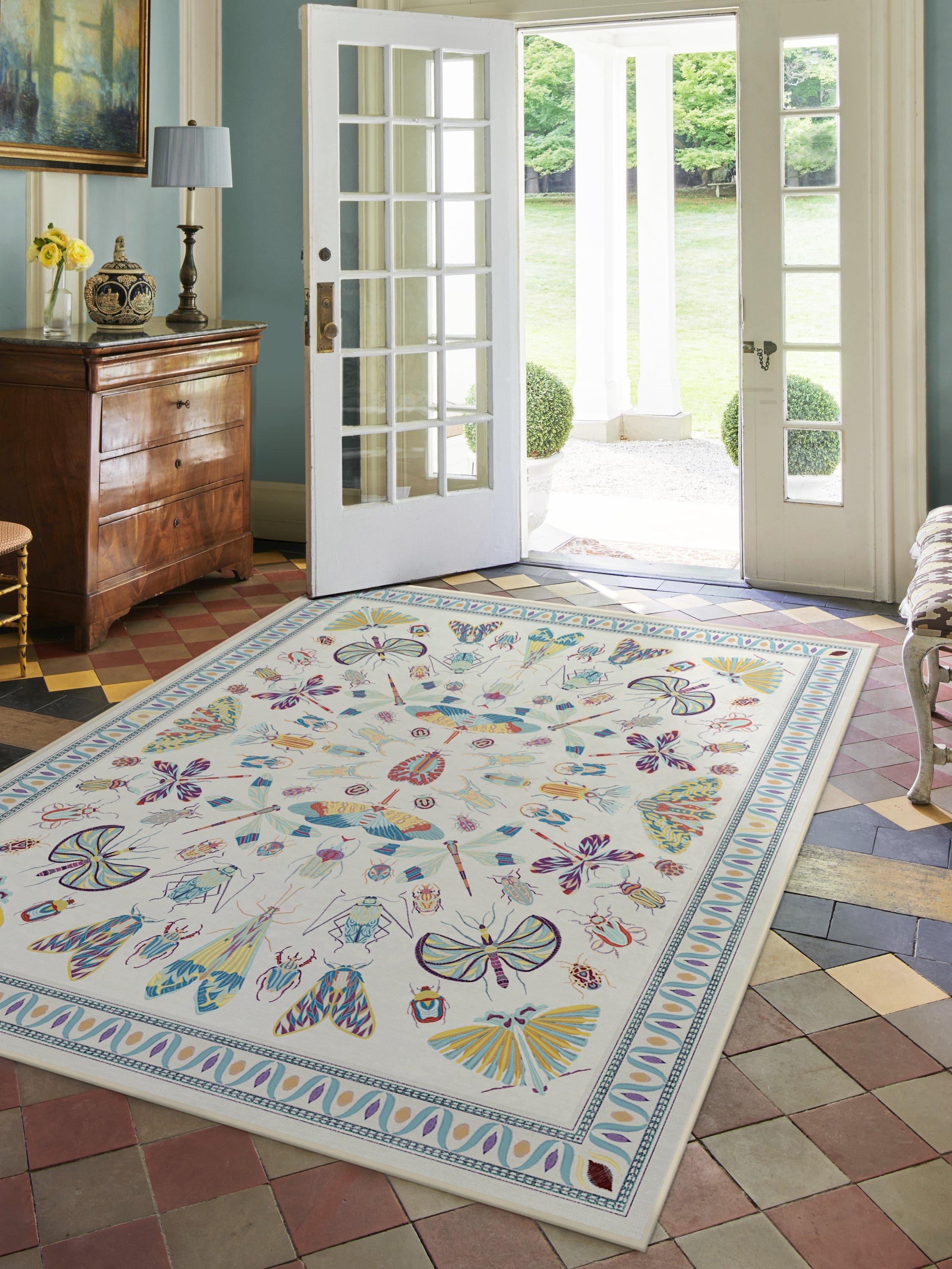 It's a bug's life. The Iris Apfel Flutterby Rug showcases a diverse mix of extravagant insects. Brightly coloured in a spring palette, this intricate design is inspired by the fashion icon's unique and bold sense of style. Look for fluttering butterflies near the zigzag border, all complemented by a gentle background. Water-resistant, stain-resistant, and machine-washable. Colours may vary slightly according to your device and the lighting in your space.