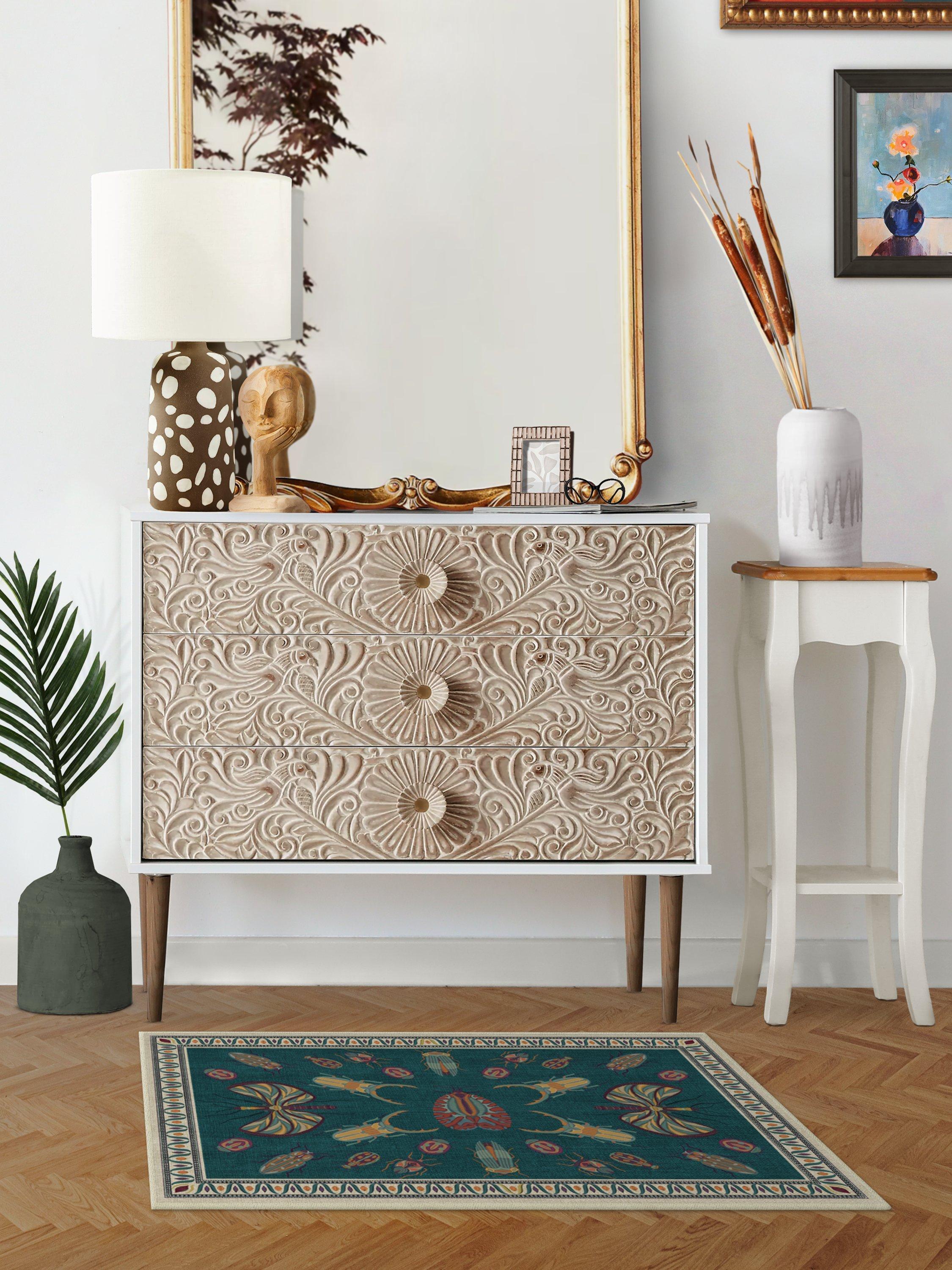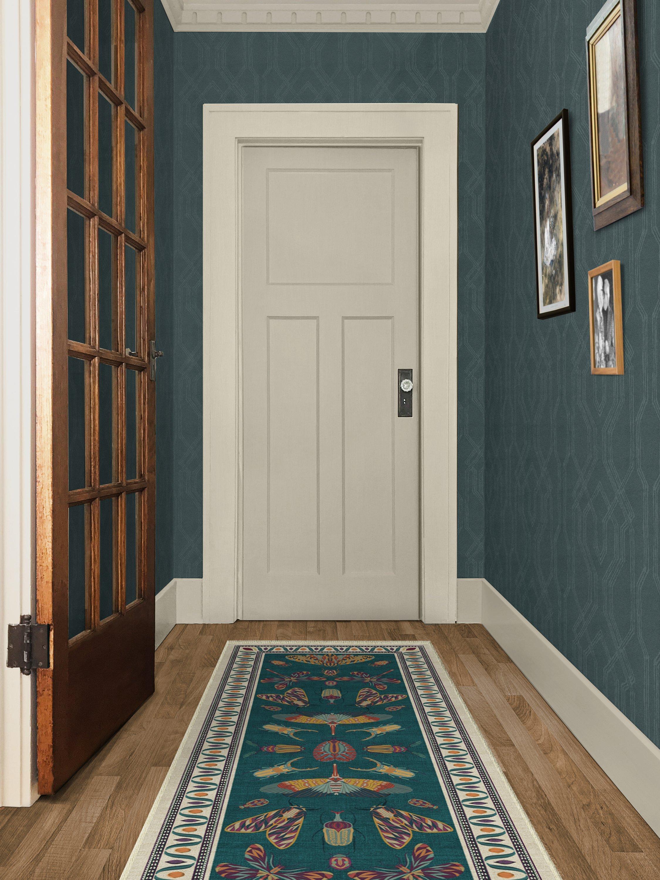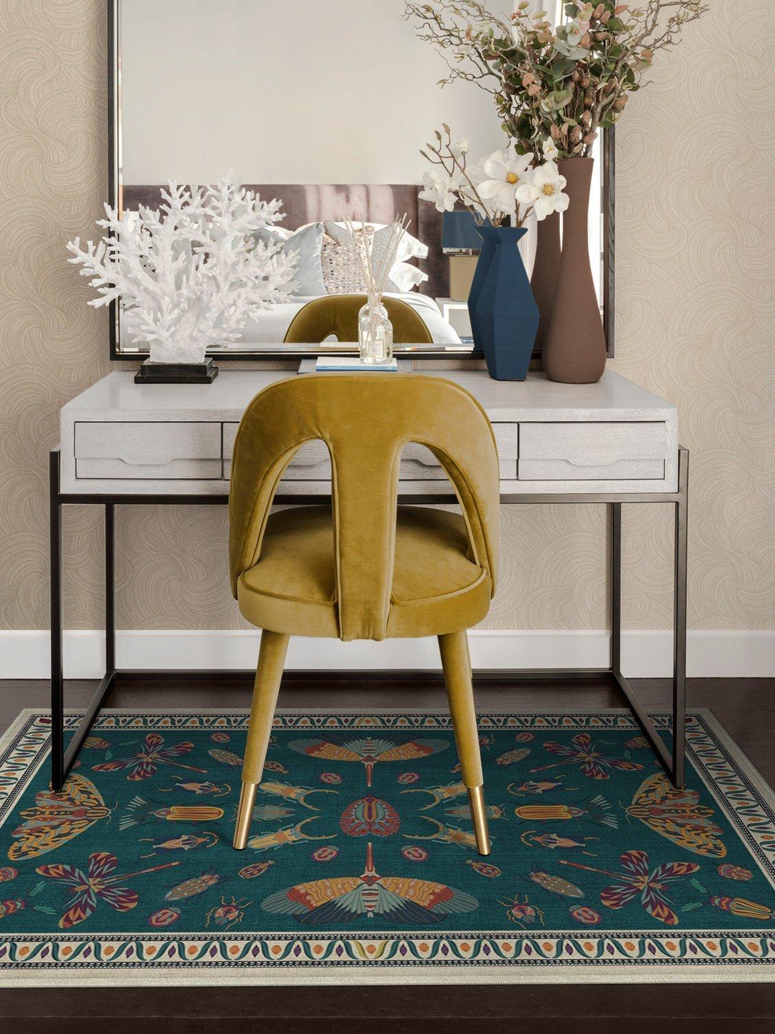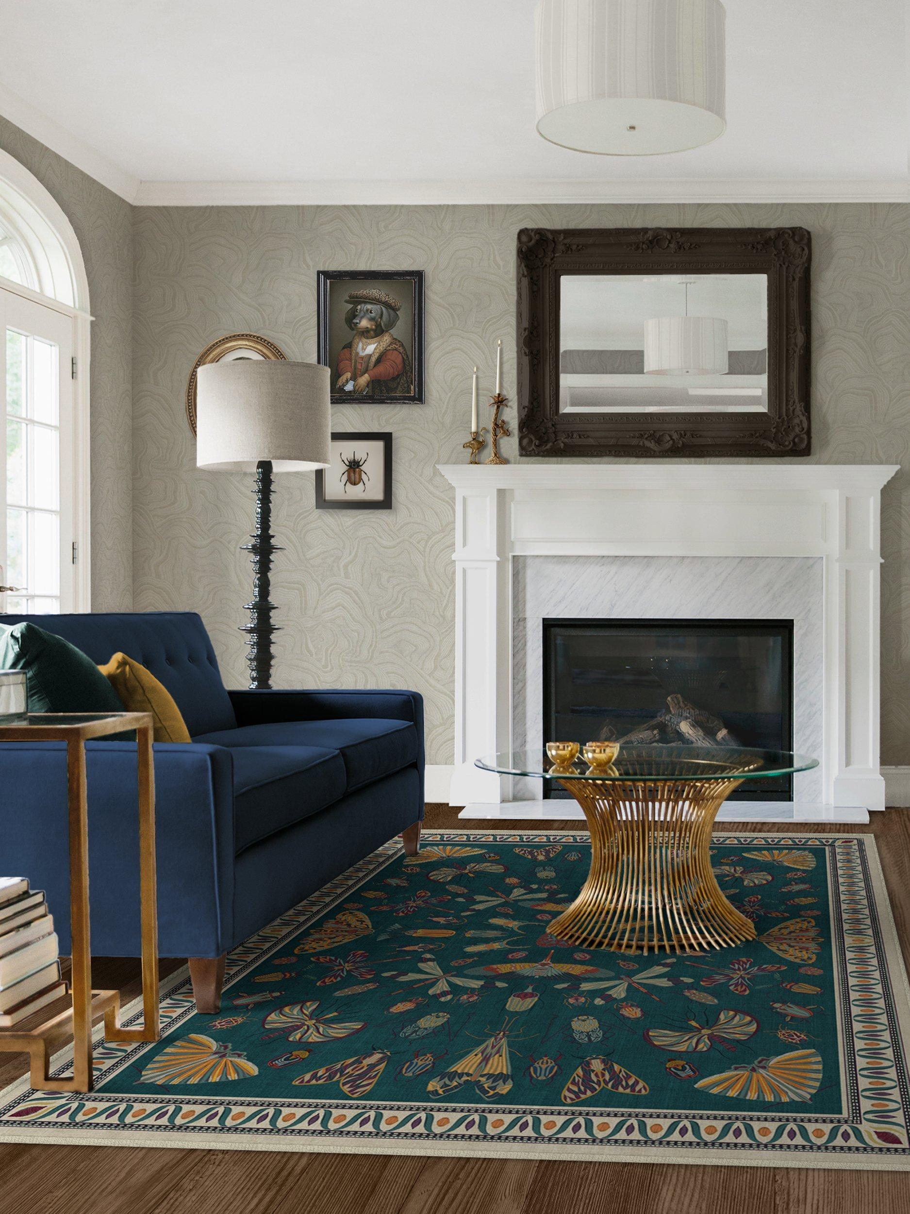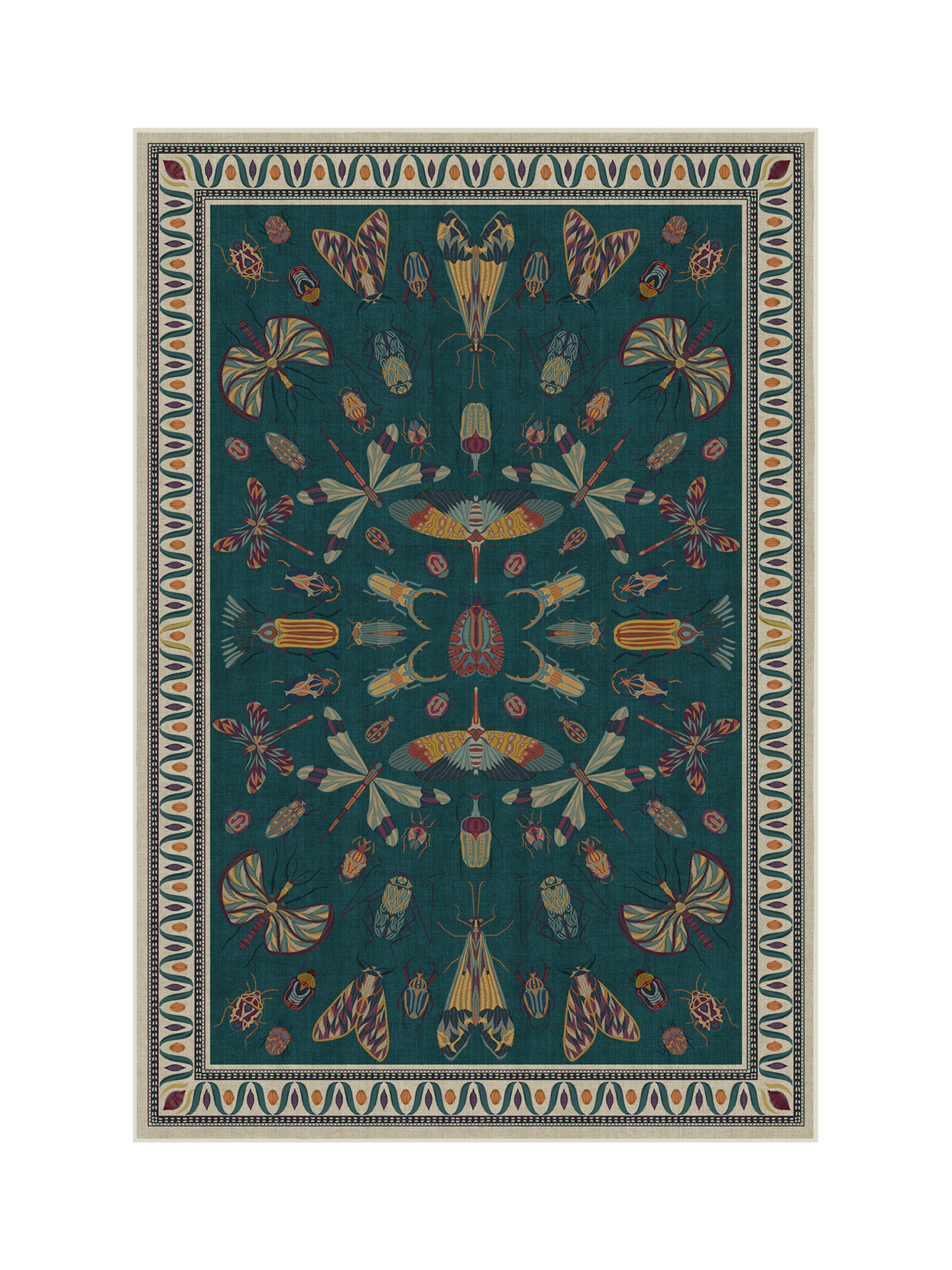 It's a bug's life. The Iris Apfel Flutterby Rug showcases a diverse mix of extravagant insects. Brightly coloured in a spring palette, this intricate design is inspired by the fashion icon's unique and bold sense of style. Look for fluttering butterflies near the zigzag border, all complemented by a gentle background. Water-resistant, stain-resistant, and machine-washable. Colours may vary slightly according to your device and the lighting in your space.