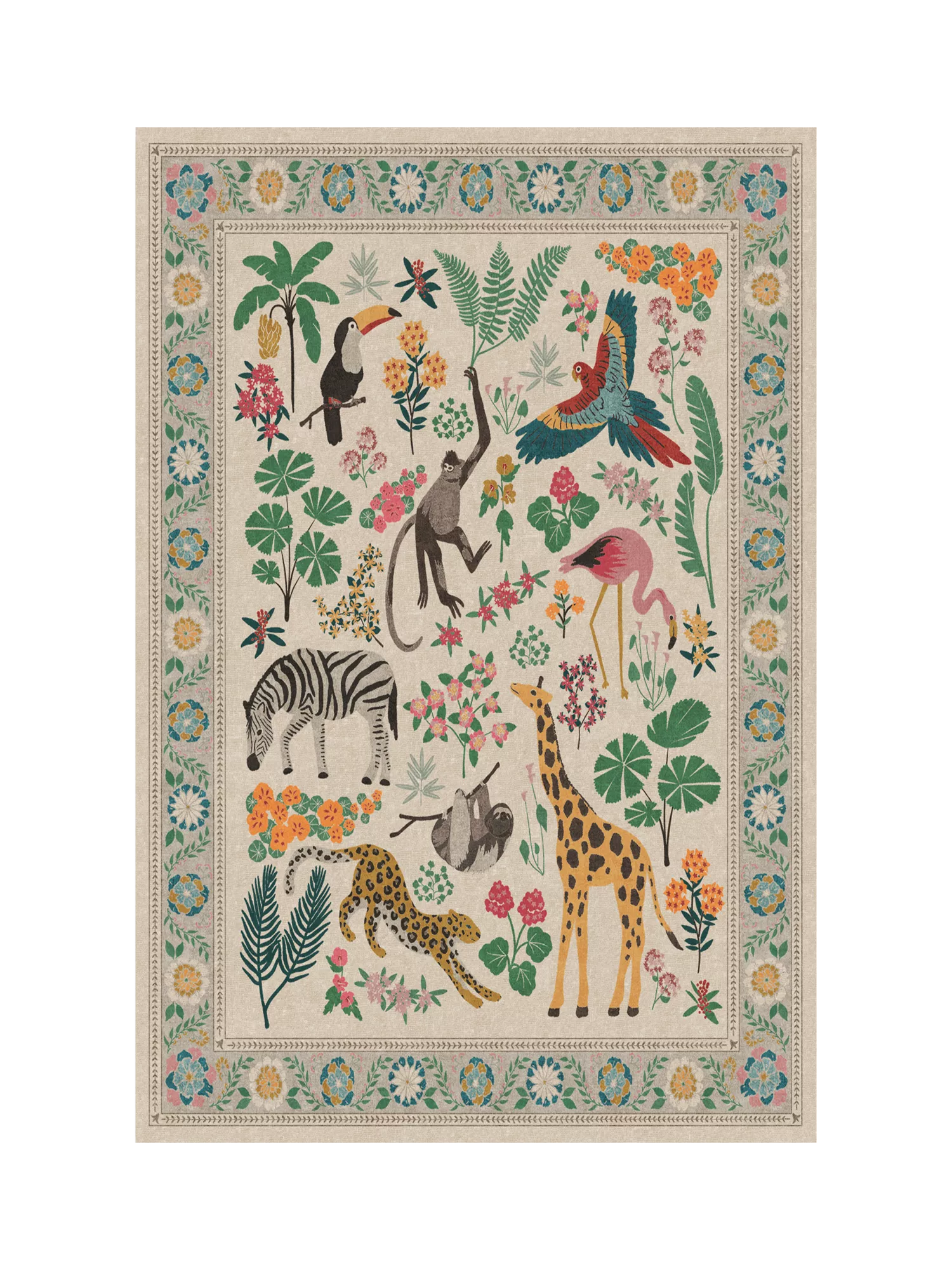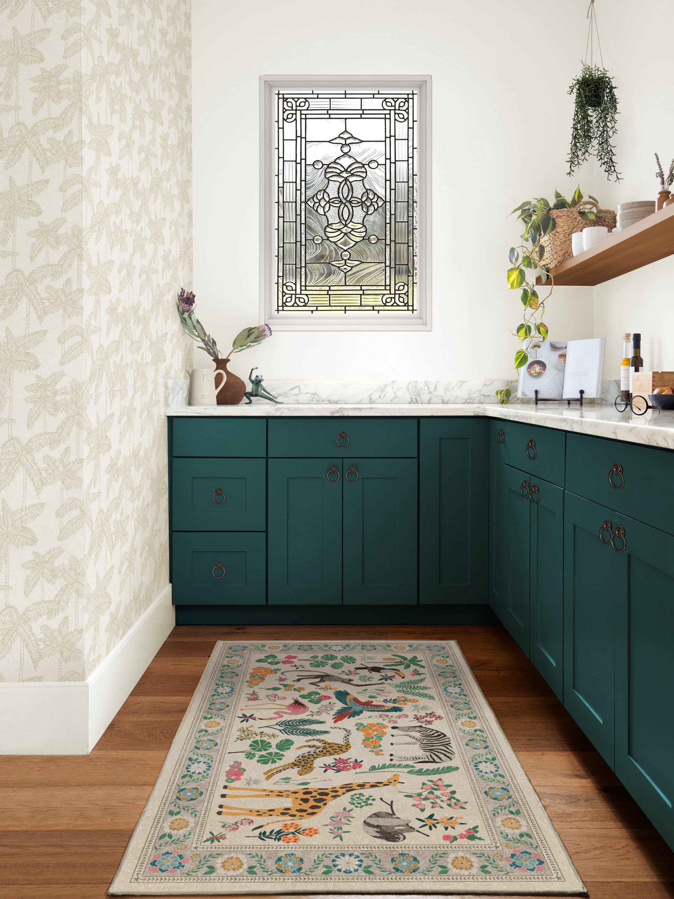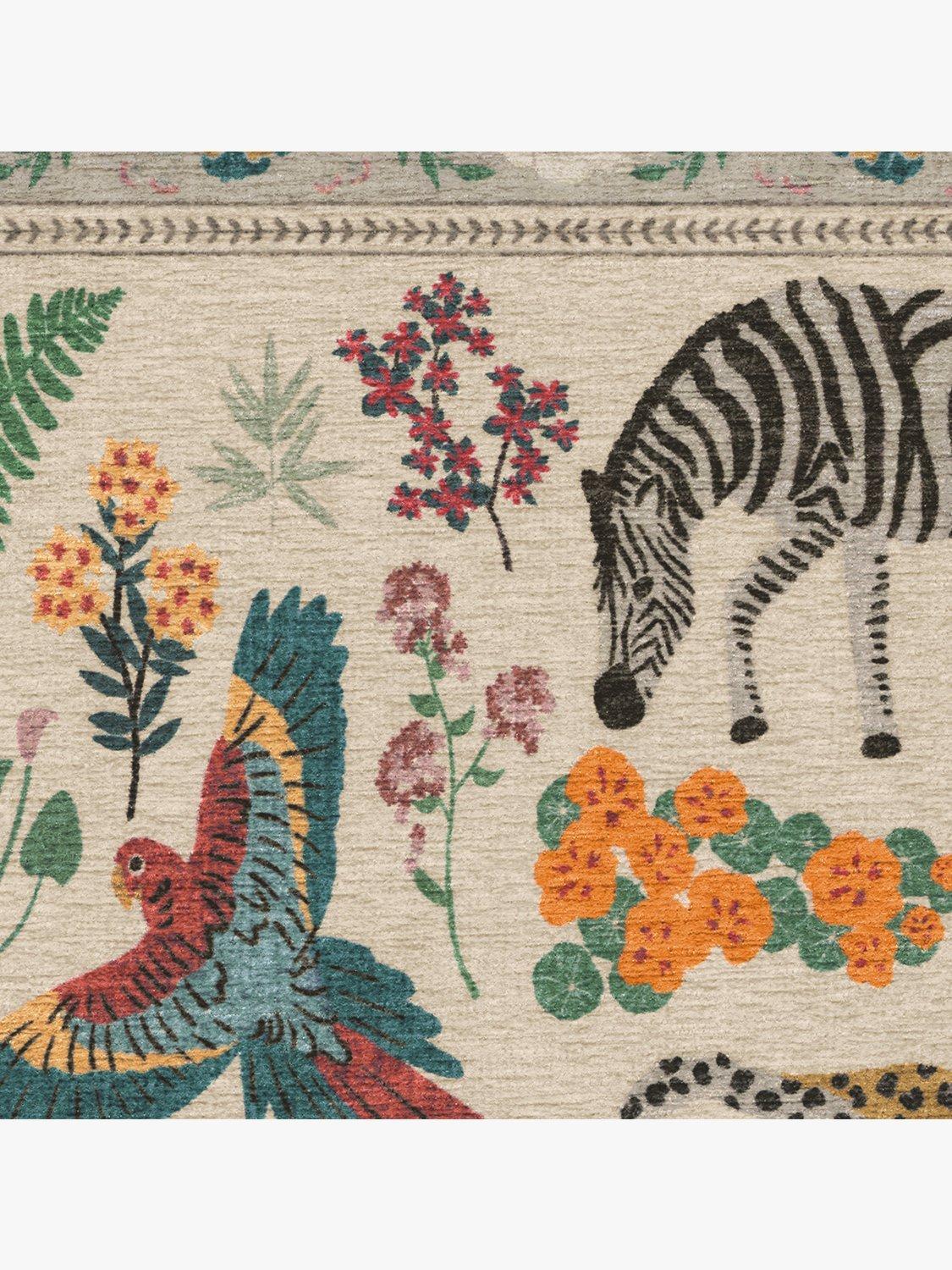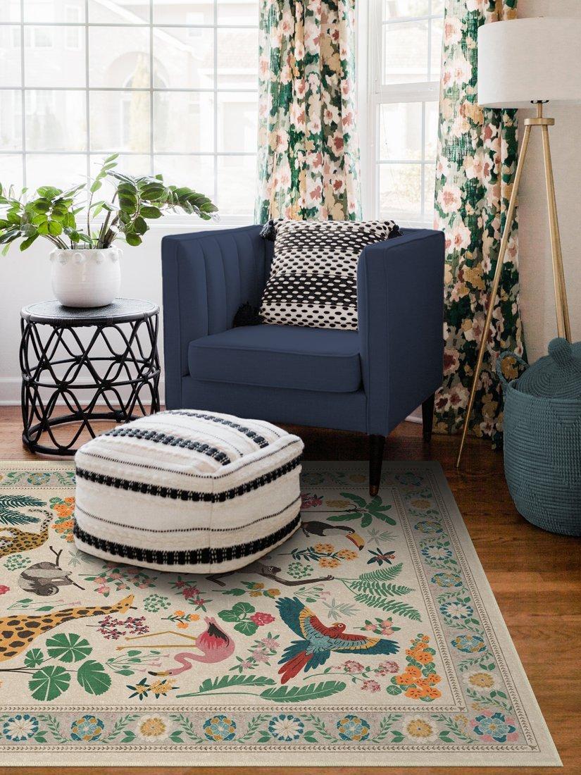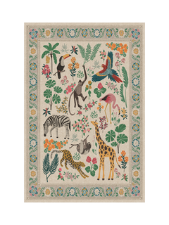 Tufted provides thicker texture and softer feel for comfortable living spaces, playrooms, and bedrooms. Take a walk on the wild side. The Iris Apfel Jingle Jungle Tufted Rug draws inspiration from the fashion icon's love of animal figurines she's collected on her travels. This lively design features a delightful assortment of animals - monkeys, sloths, giraffes, zebras, and more - surrounded by tropical flora.