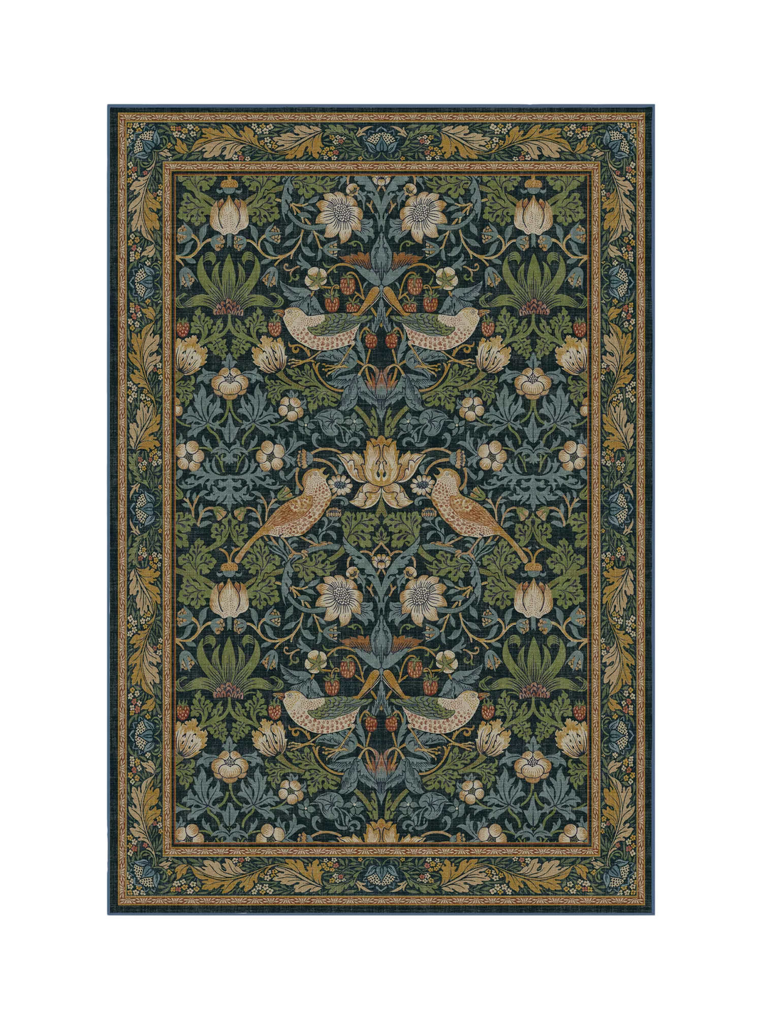 Step into Kelmscott Manor's garden with the Strawberry Thief Rug, part of a collaboration between Ruggable and Morris & Co. A direct translation of William Morris's recognisable block print textile, this rug depicts Morris's thrushes stealing fruit from his kitchen garden. Water-resistant, stain-resistant, and machine-washable. Rug colours may vary slightly according to the lighting in your space.