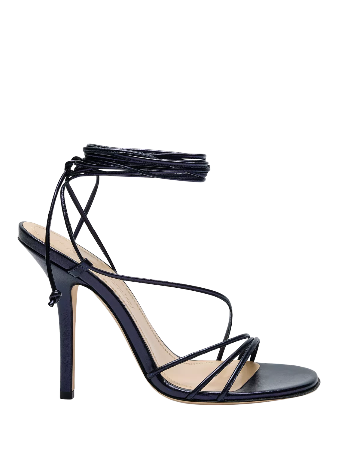 Risley Strappy is all tension and allure. Slender straps frame the foot while ankle ties wind with purpose delicate but impactful. Set on a soaring heel the silhouette feels confident intentional and poised to make an entrance.