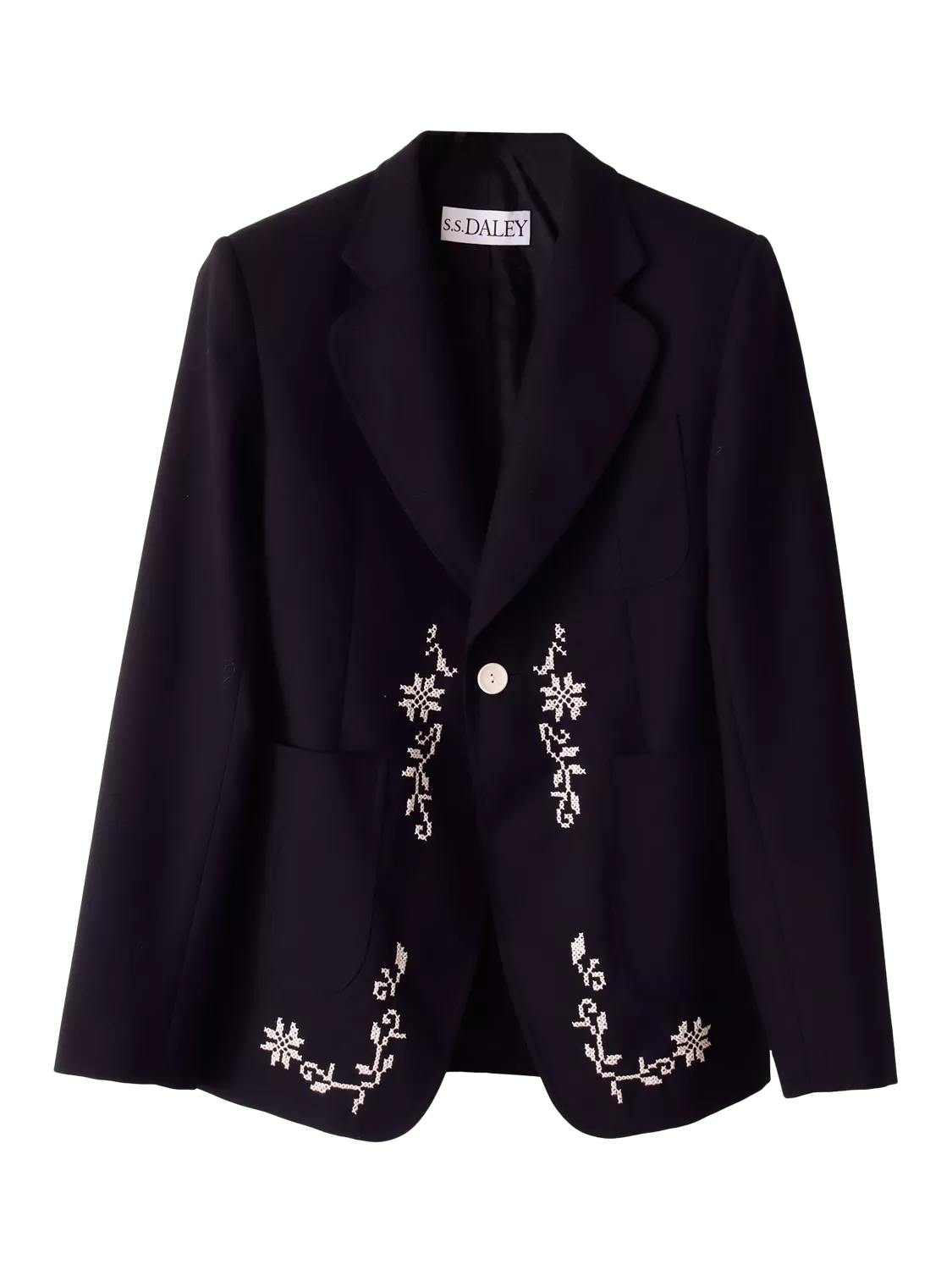 A single-breasted jacket with hand-embroidered detailing on the front, this style is inspired by a 1940s lace handkerchief.