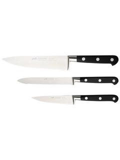 Superb quality knives featuring corrosion-resistant, stainless steel blades and anti-slip, full tang handles with silver-coloured rivets. Set includes a paring knife, an all-purpose knife and a 15cm cook's knife.