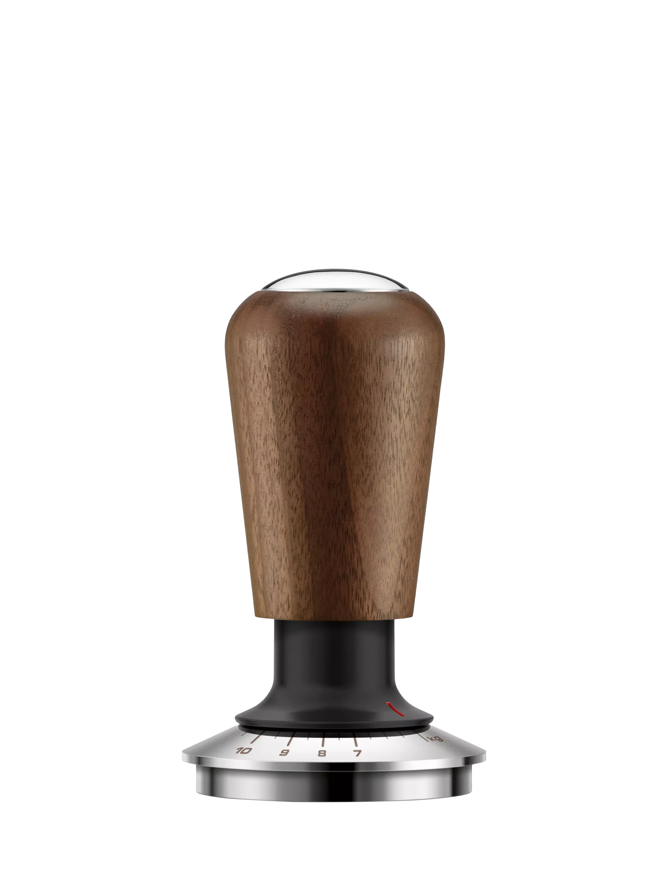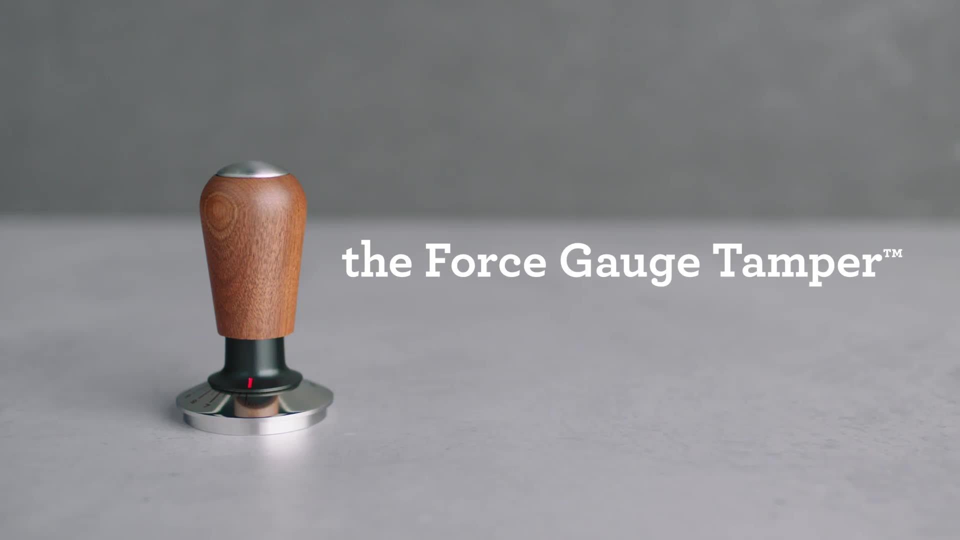 Spring-loaded mechanism provides consistent pressure between 7 kg and 10 kg. The variable force gauge has marking indicators to let you select your preferred tamp force to the grind.