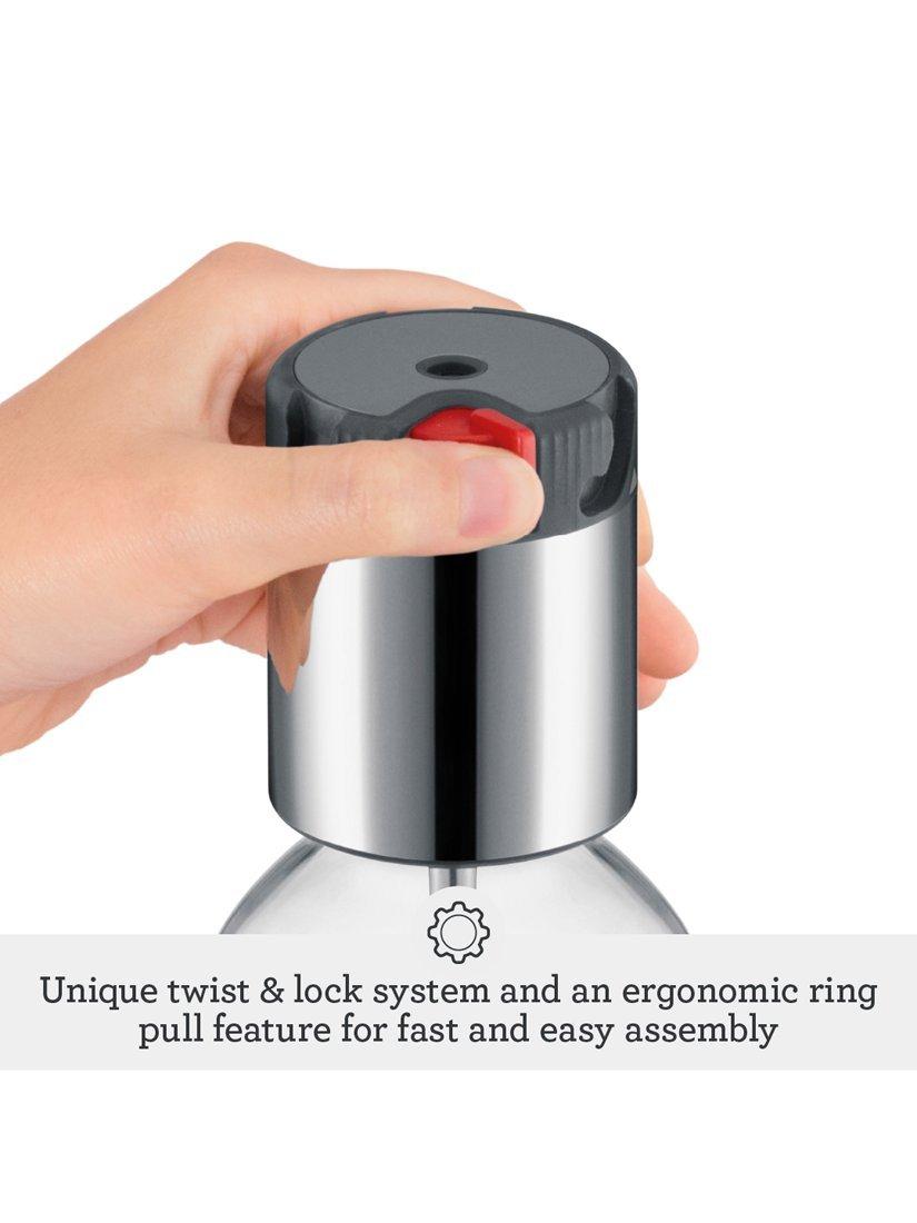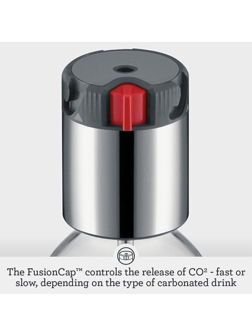 Use with standard screw type 60L CO2 canister. CO2 canister not included. Included accessories: the Fusion Cap™, 1L bottle with stainless steel cap and base, cleaning brush, funnel & sieve.