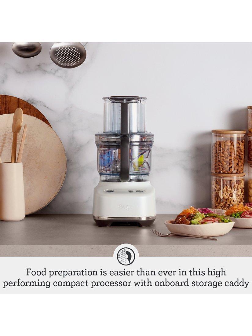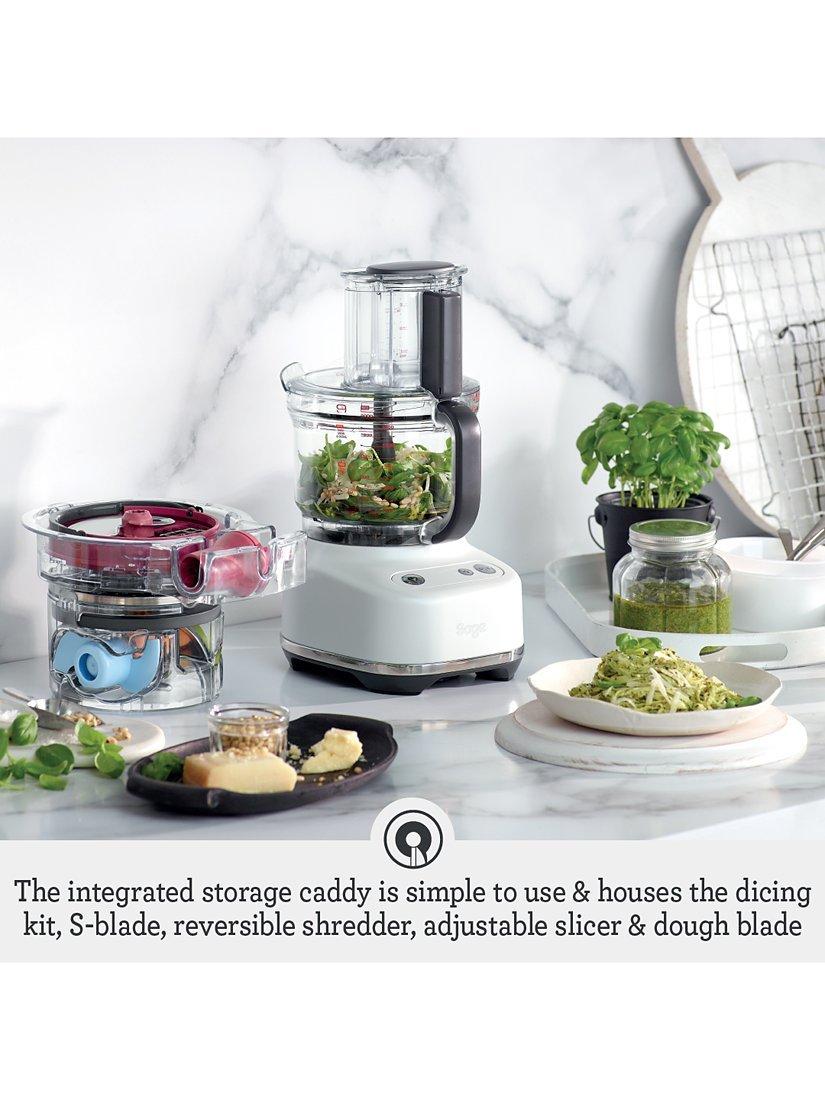 The integrated storage caddy is simple to use and houses the dicing kit, S-blade, reversible shredder, adjustable slicer and dough blade. They can be accessed independently and are neatly housed inside the bowl.