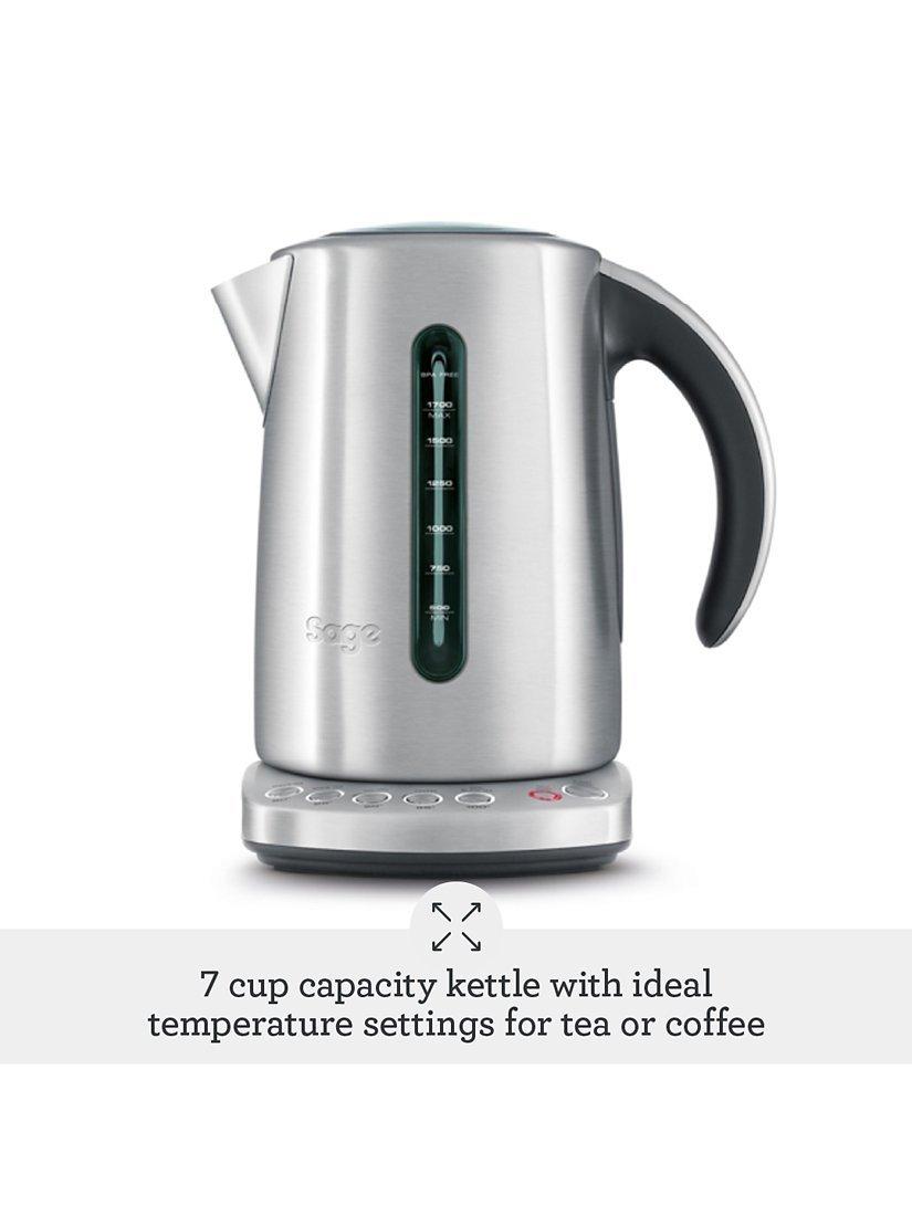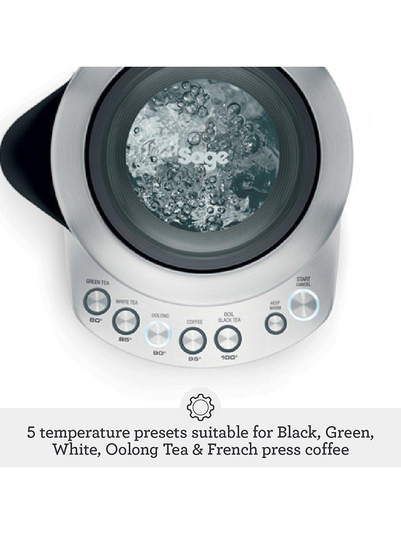 This 1.7L capacity stainless steel kettle knows the ideal temperature for tea or coffee. 5 settings brew at the right temperature for Black, Green, White or Oolong Tea and French press coffee.