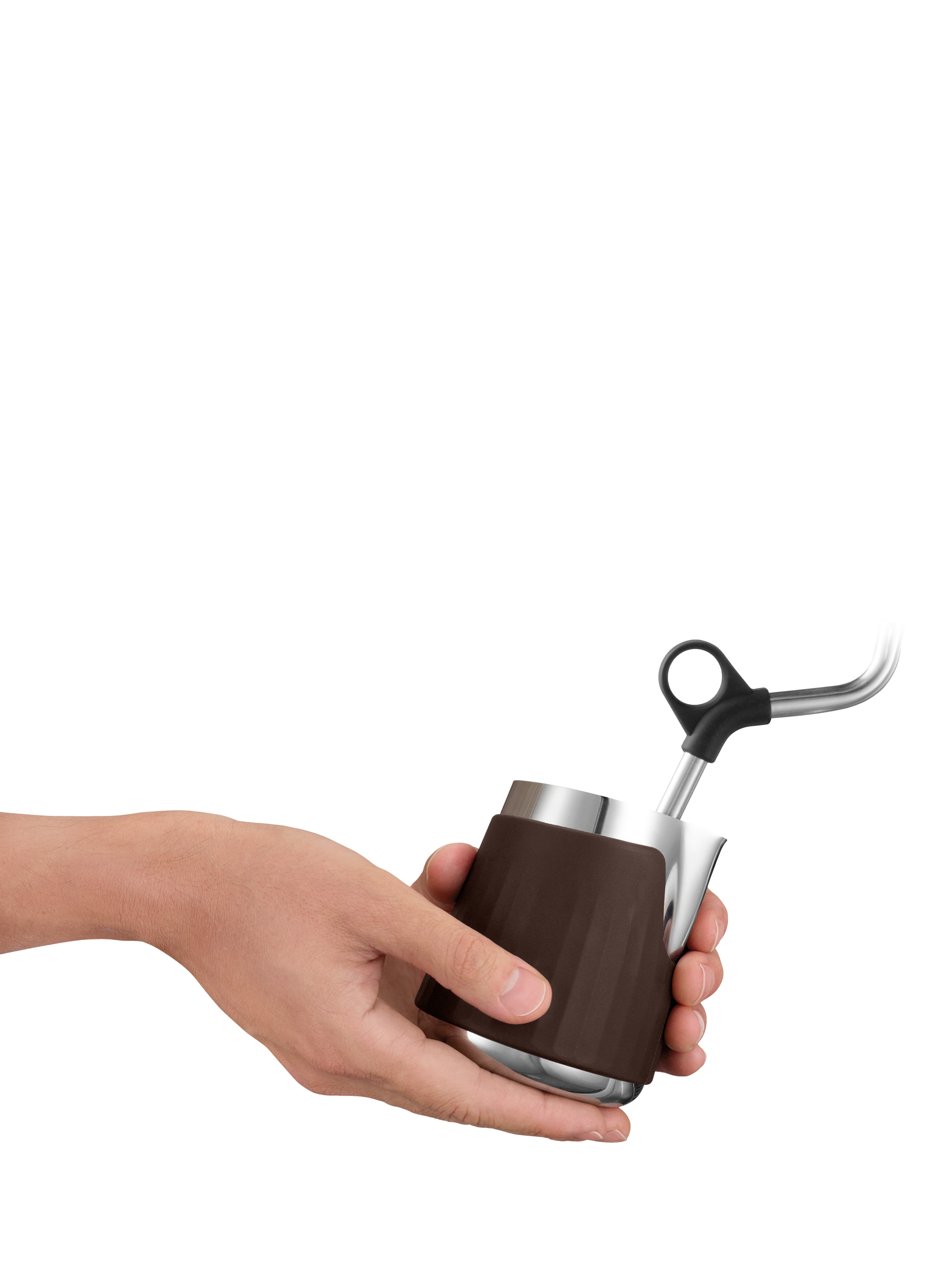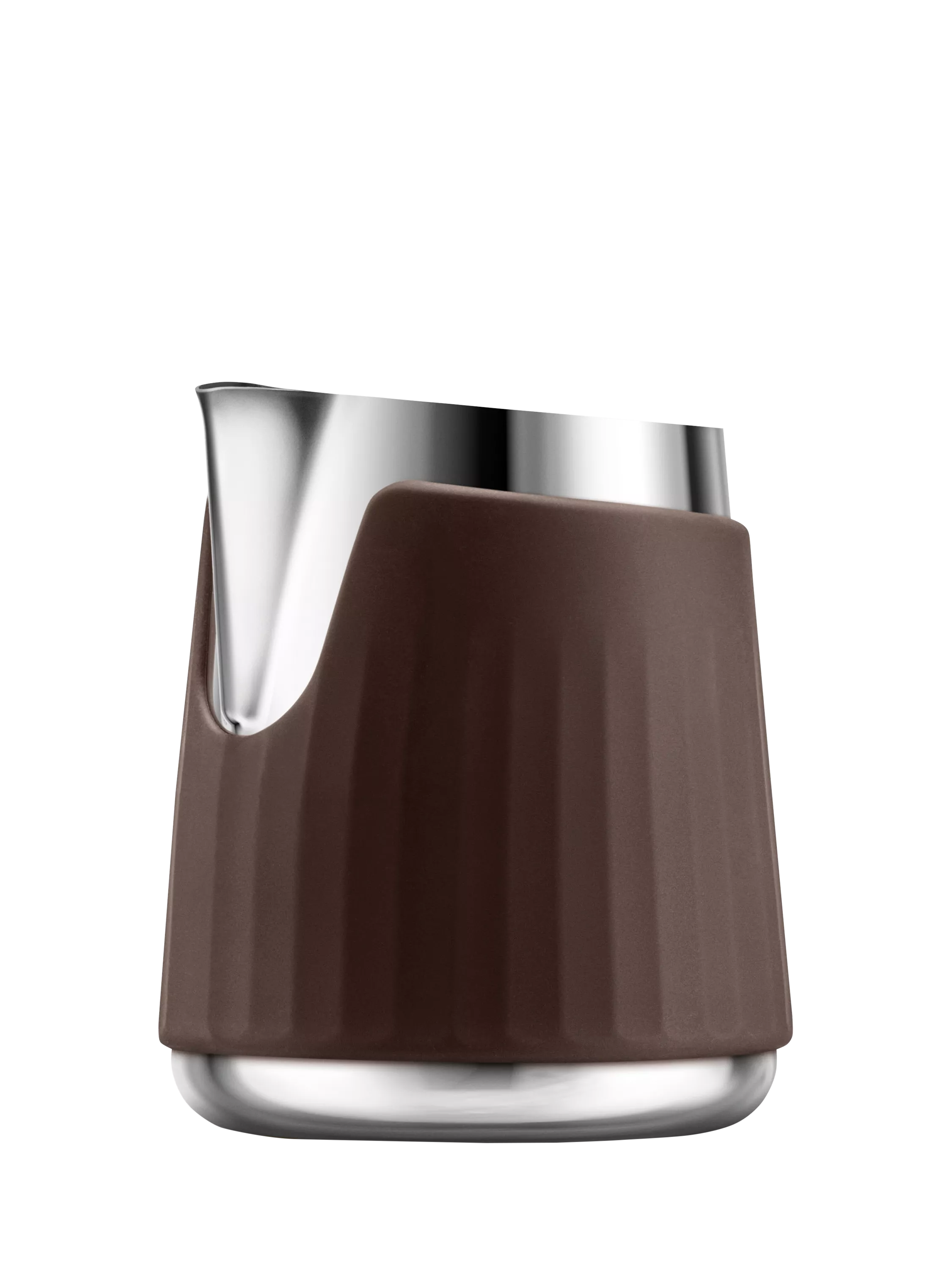 Handleless design and heat-resistant silicone sleeve gives you full control, with a pro spout to create more precise latte art. Angled opening provides a better view when steaming milk.