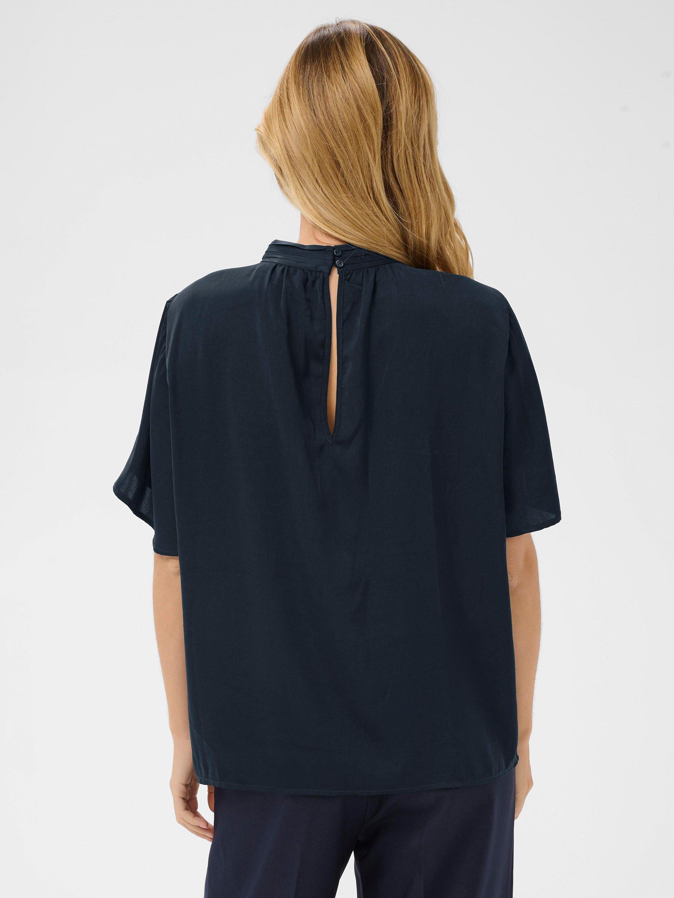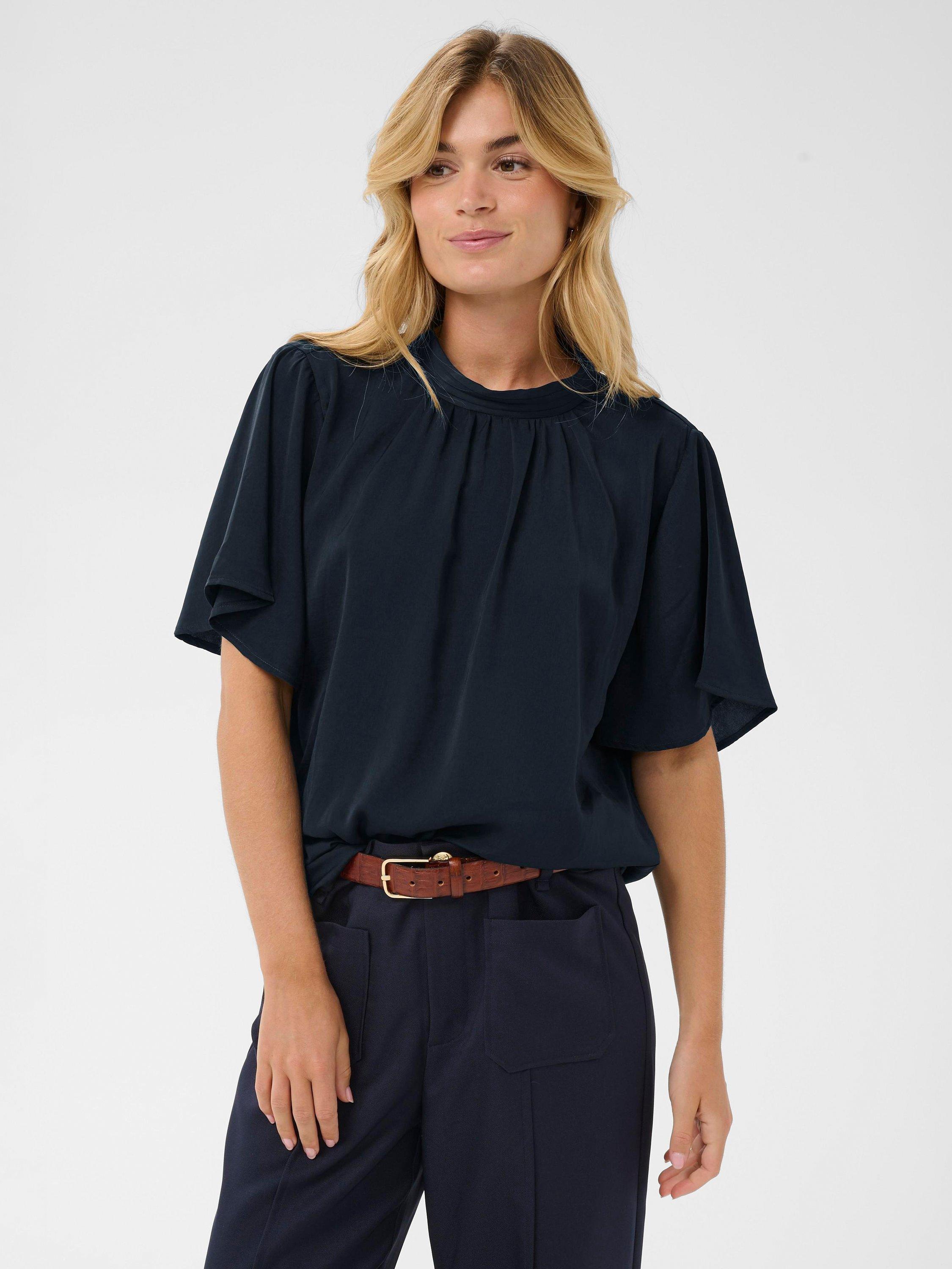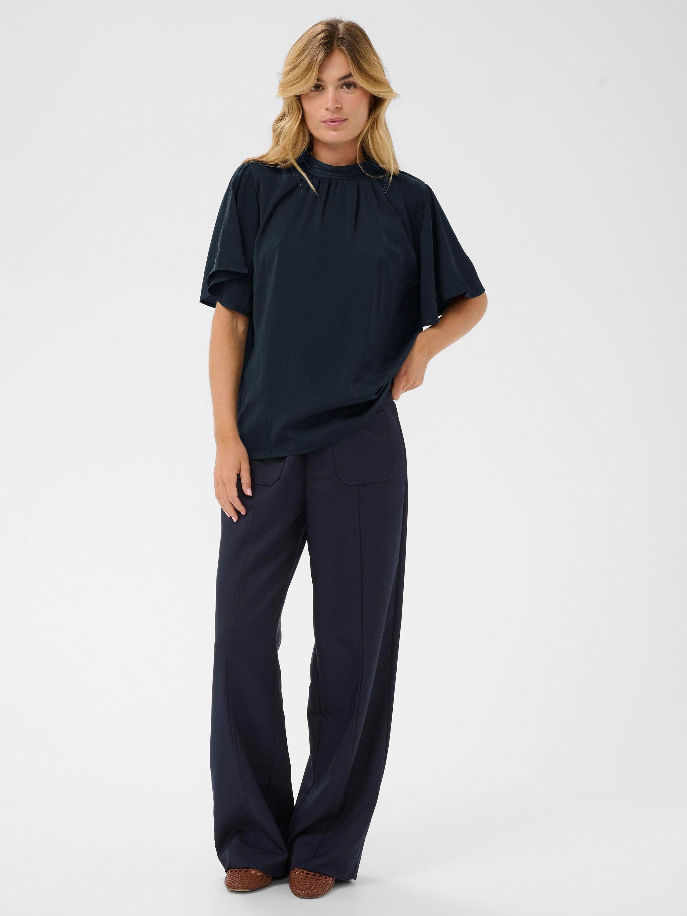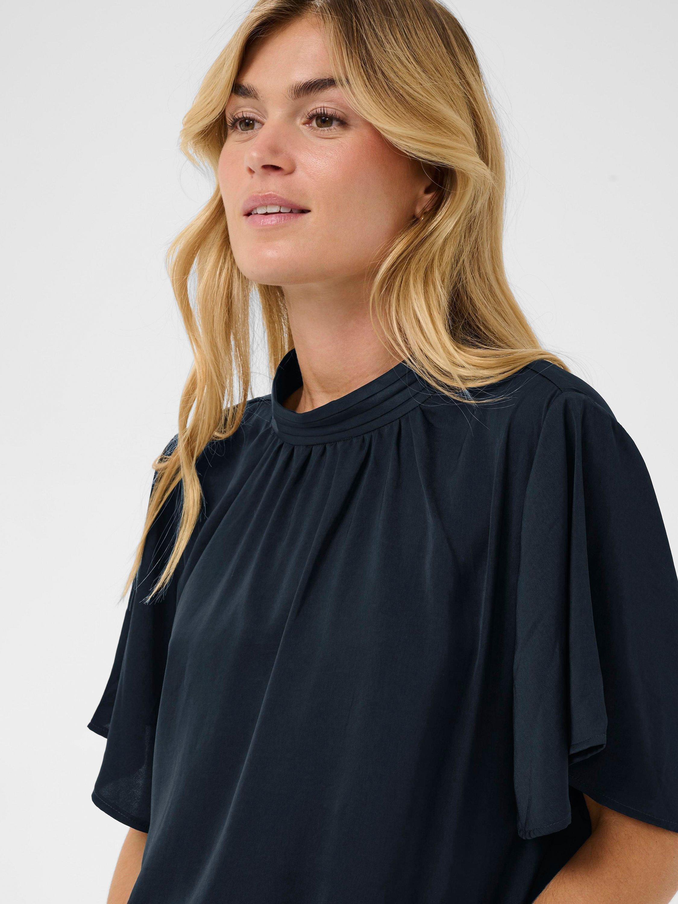 An effortless blouse from Saint Tropez. With a high neck and flared sleeves, the plain colour means it goes with everything. Casual, comfortable, and effortlessly chic.