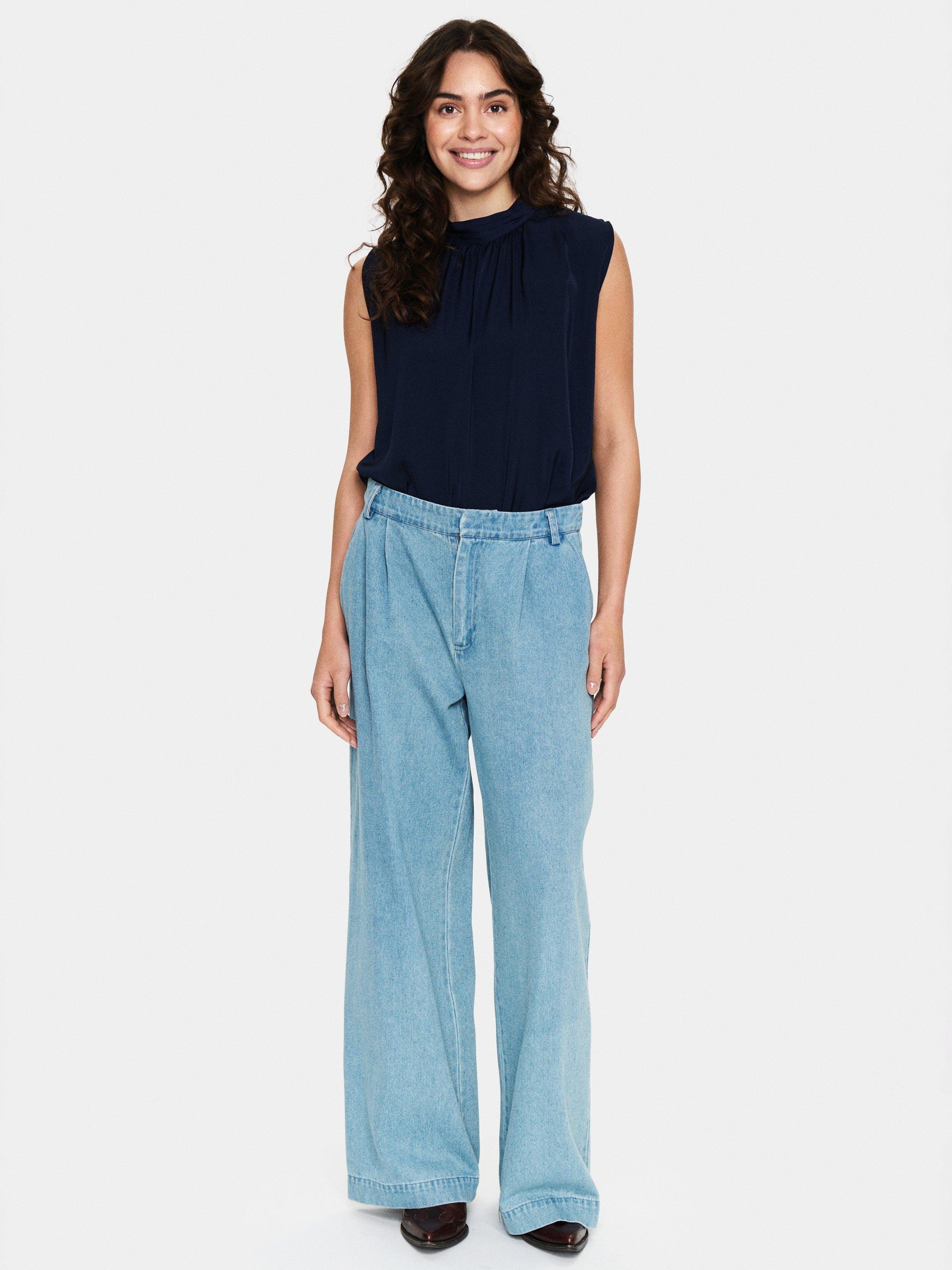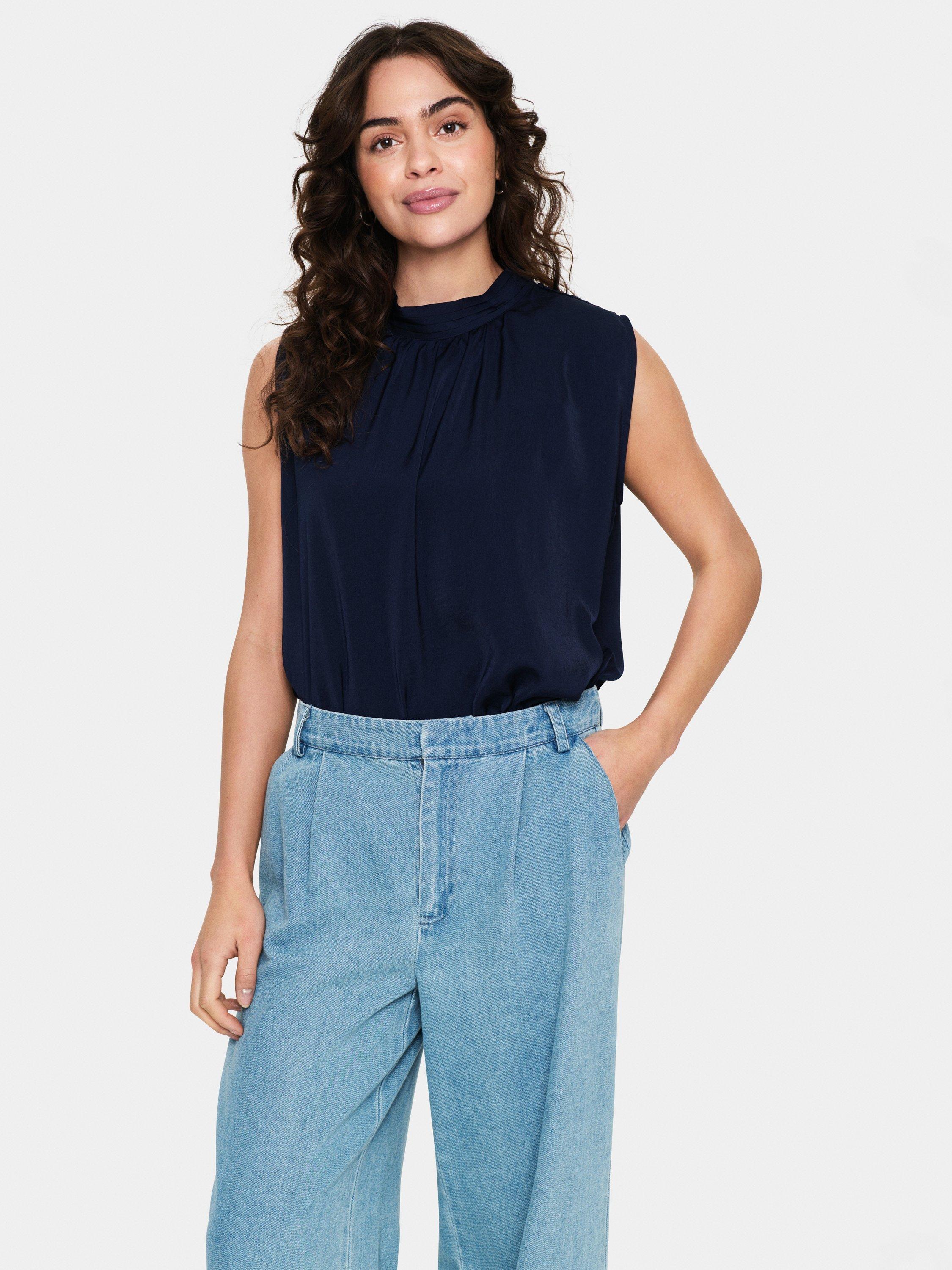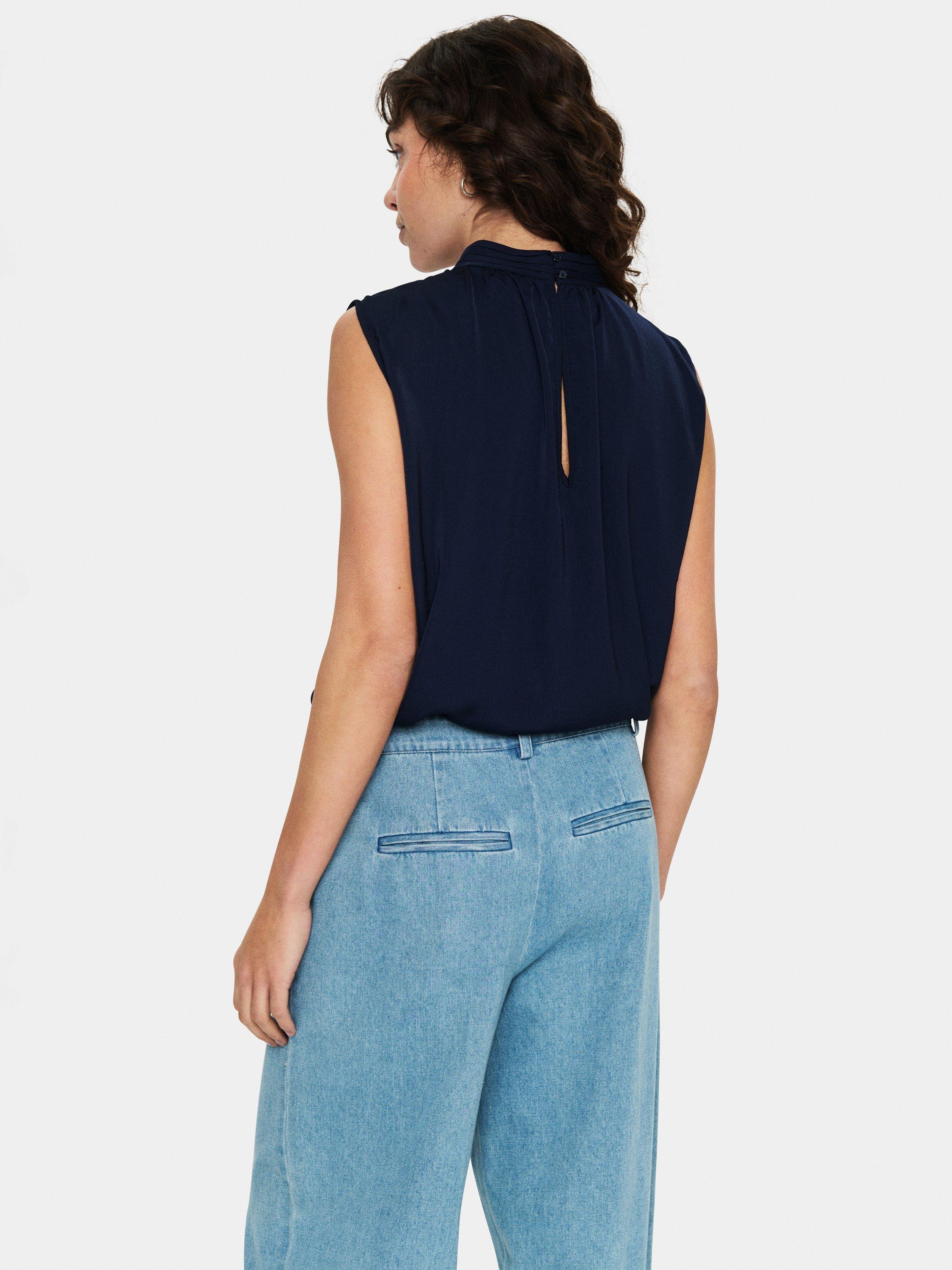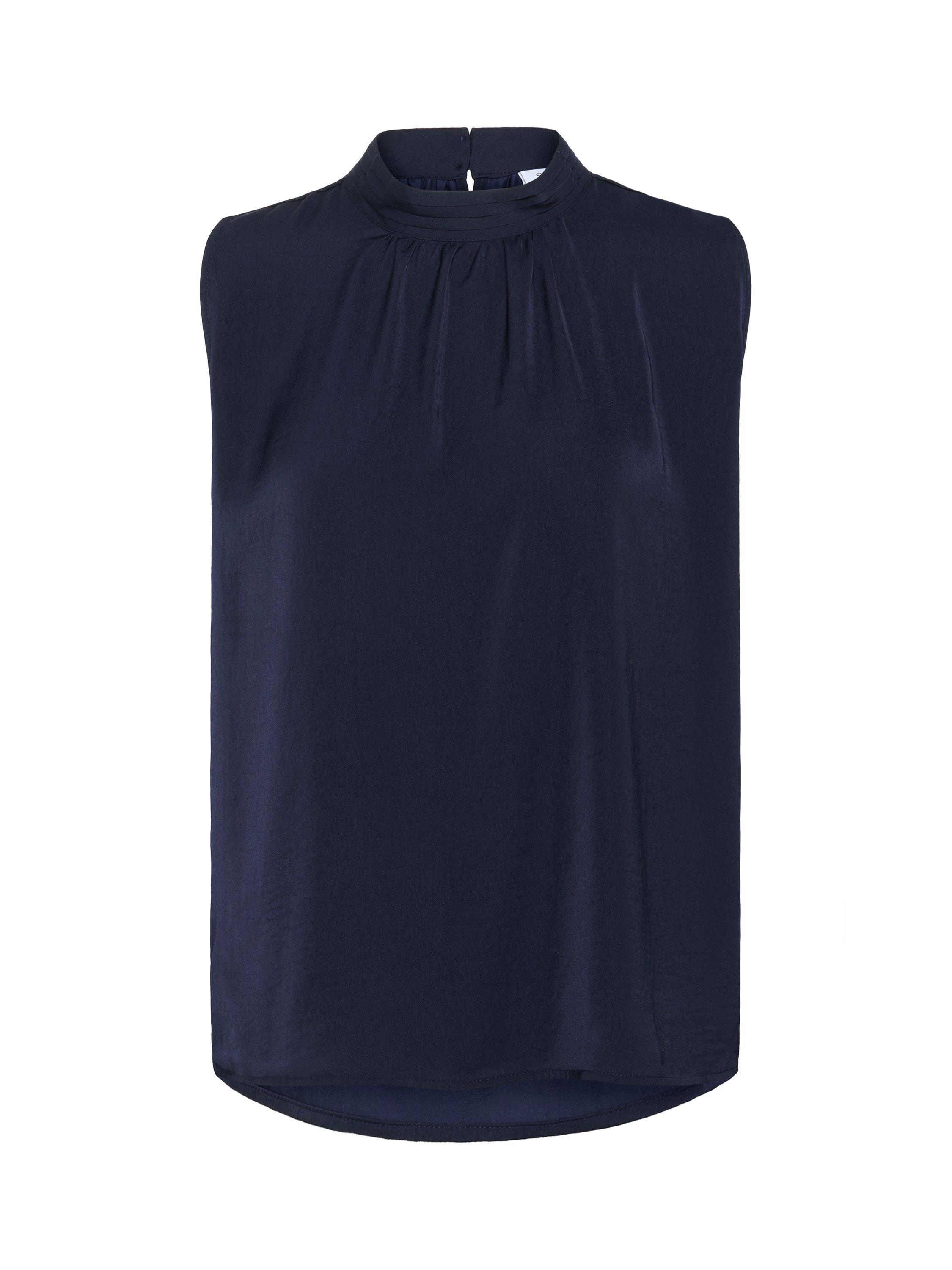 The Aileen top is a sleeveless blouse with a low funnel neck. The neck has folded pleats, and a double button fastening at the back. Below the buttons the blouse has a keyhole detail. Along the neckline the blouse has soft pleats that makes it drape elegantly down the body. The blouse has a regular fit and is cut at the hips.
